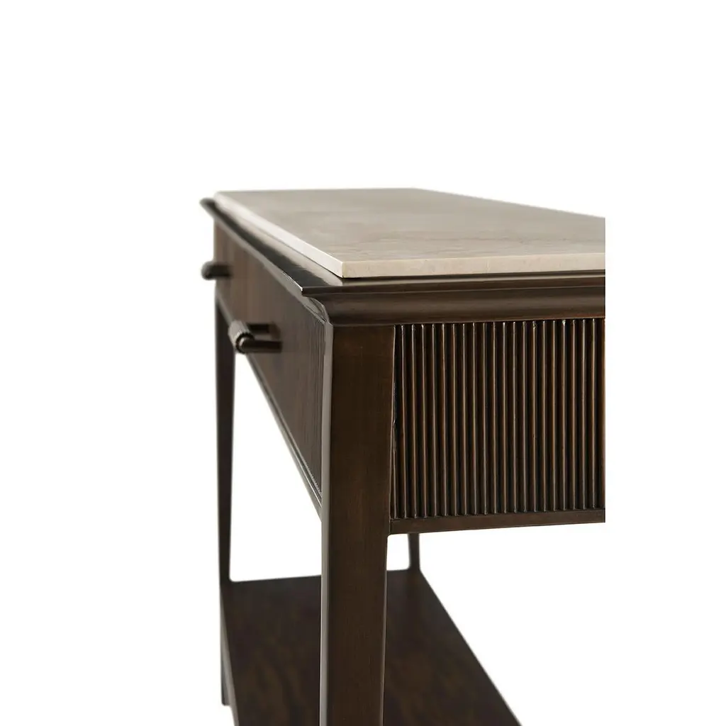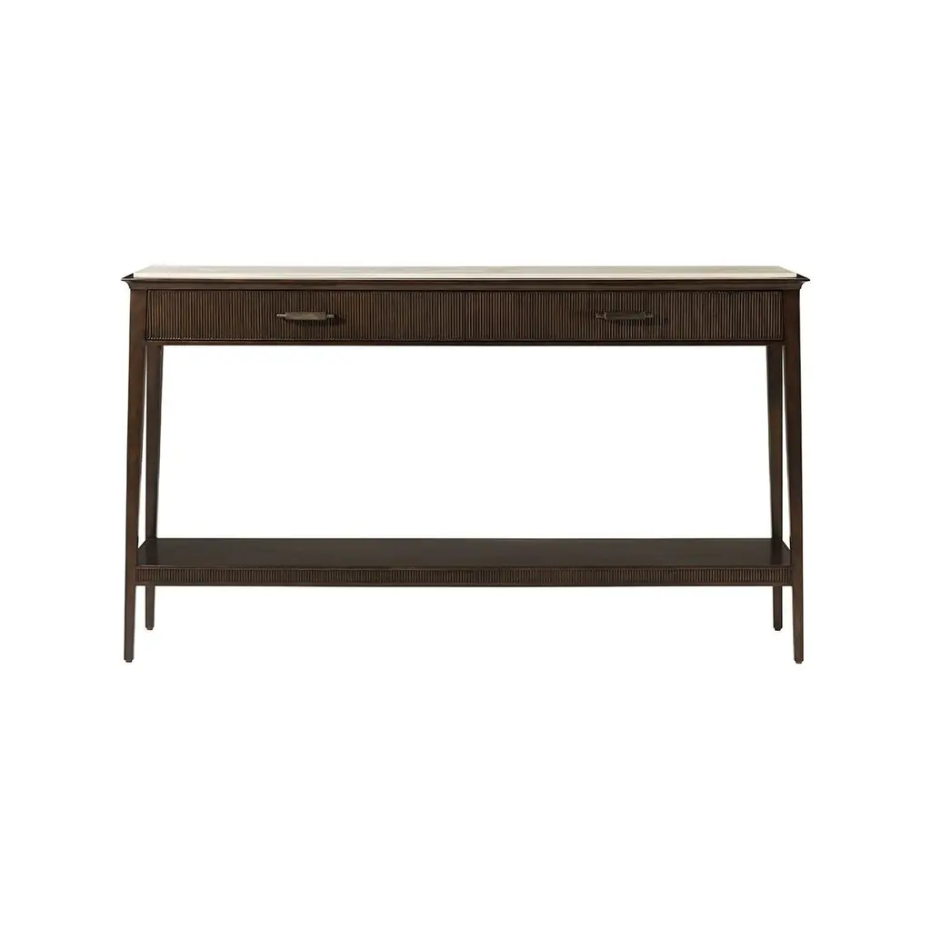 With an updated Neo Classic design, is crafted from Prima Vera in our Bistre finish that is complimented by a beautifully honed inset Crema Marfil marble stone top. It features an elegantly tapered silhouette, reeded detailing, two drawers and a shelf. The custom forged hardware, finished in a dark rubbed bronze, echoes the reeded details throughout.Dimensions: 60.5" W x 14.5" D x 34.5" H