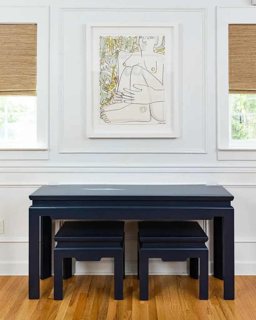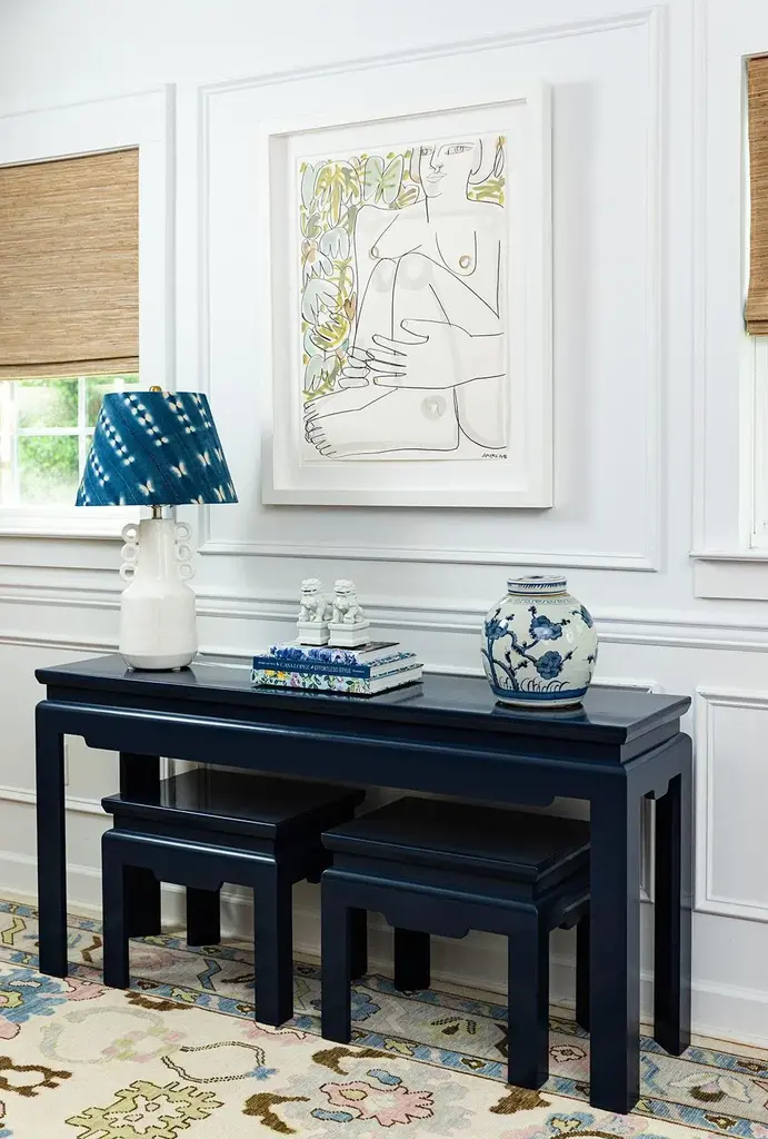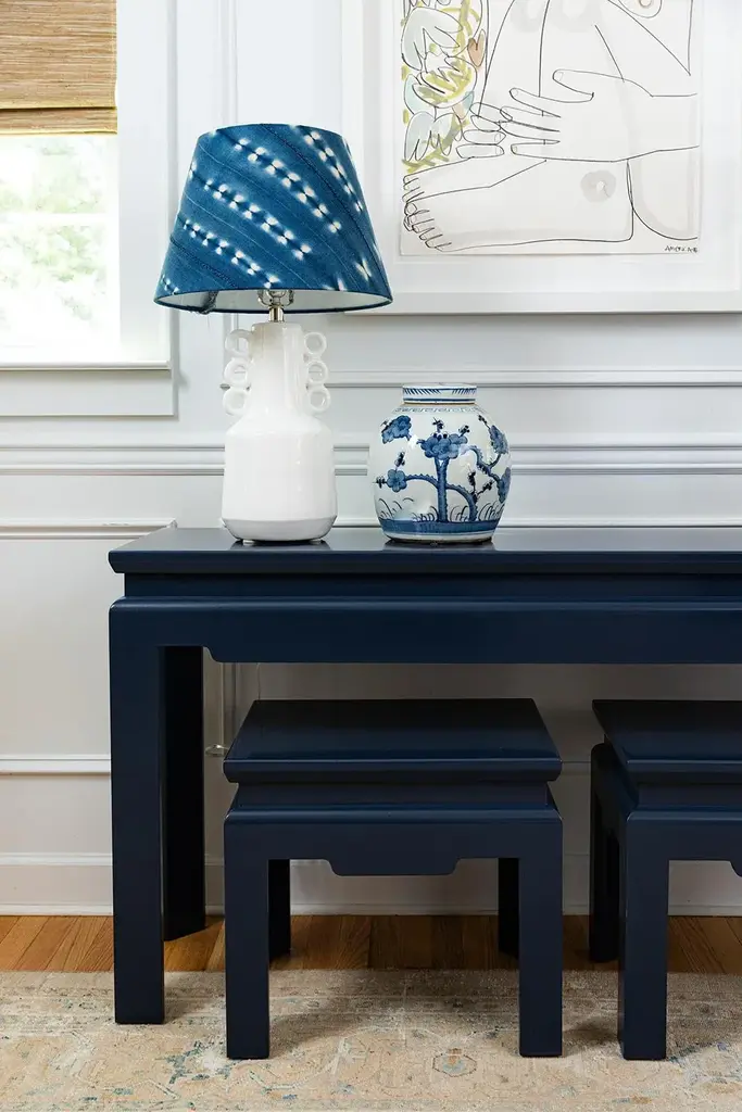 Rail & Stile Bespoke Furniture Collection: Modern Ming - Vintage feel, Modern size. Our bespoke console inspired by Chinese Ming Dynasty profiles has been reimagined for modern-day interiors with graceful lines and modern sizing. It measures 60” wide x 16” deep x 30” tall. This is a show-stopping addition to any entryway or living space. It complements our Modern Ming stools perfectly and the pair can sit nicely within. Please see last image that shows our shop colors. You can state which color you want in a Message to Seller after purchase. If you want Hale Navy you do not need to send me a message.