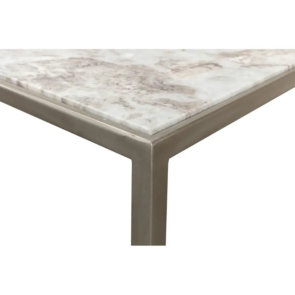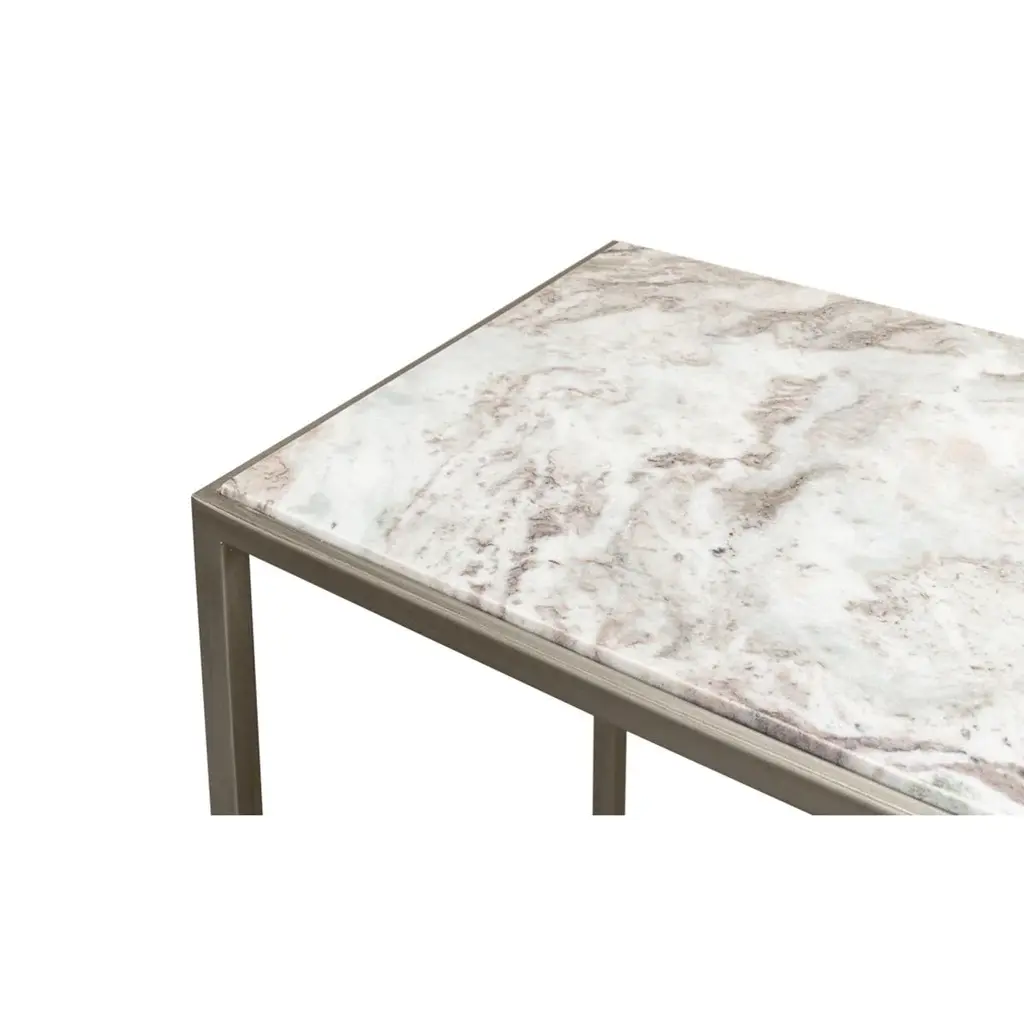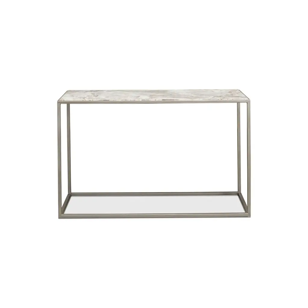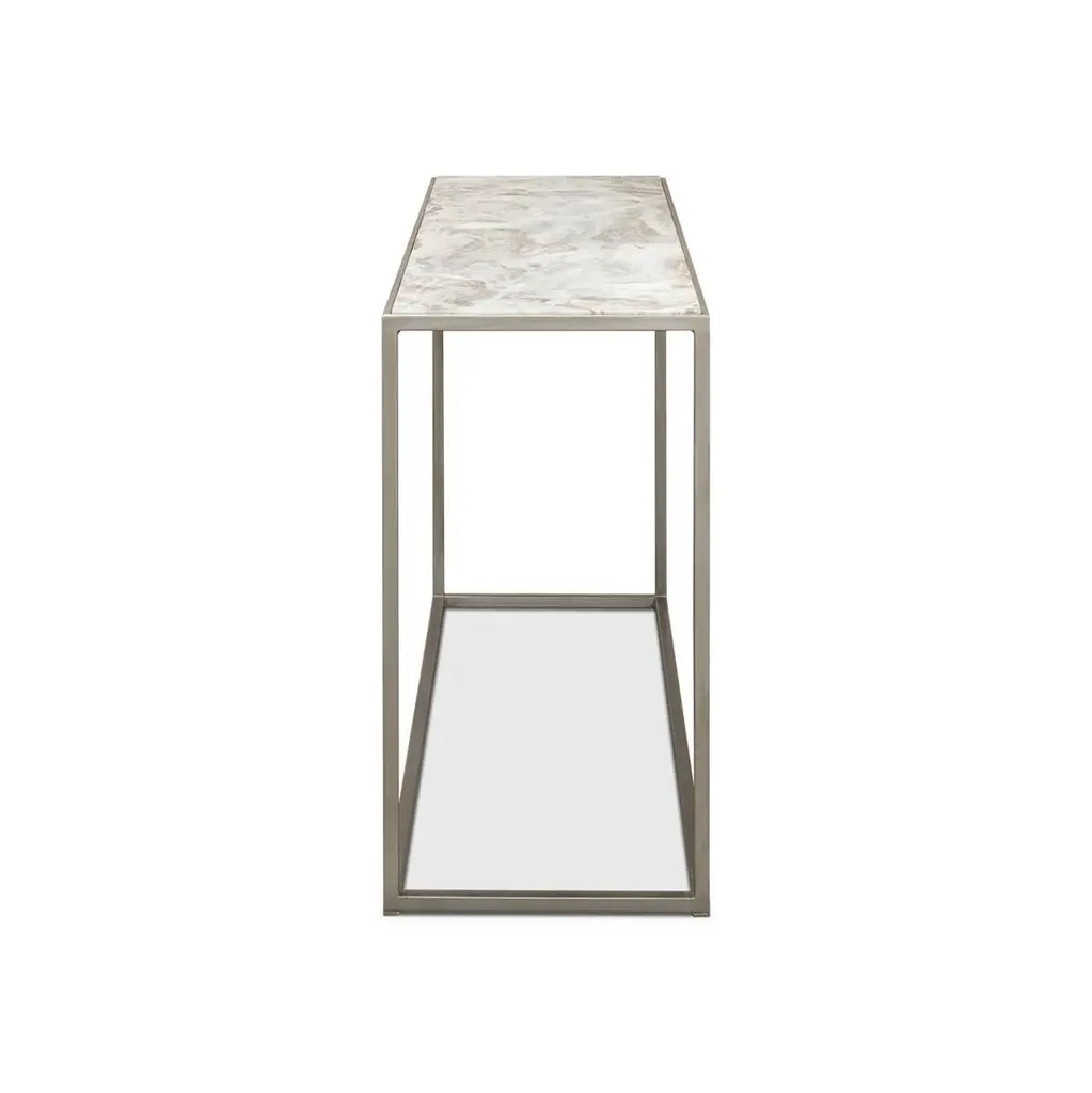 Modern Minimal Marble Top Console Table, with inset marble top above an antiqued and silvered finish iron box form frame. Dimensions: 48" W x 16" D x 30" H