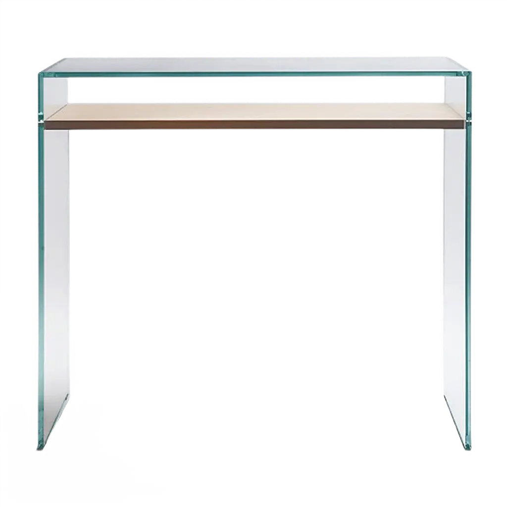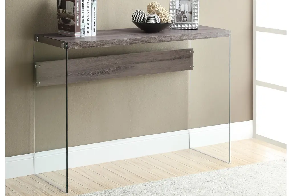 The Moderna Modern Brown 44" Console Table is a stylish and functional addition to any home. Its dark taupe wood finish and clear tempered glass sides create a sleek, contemporary look that complements a variety of decor styles. The spacious table top provides ample surface area for displaying plants, books, or other decorative items.