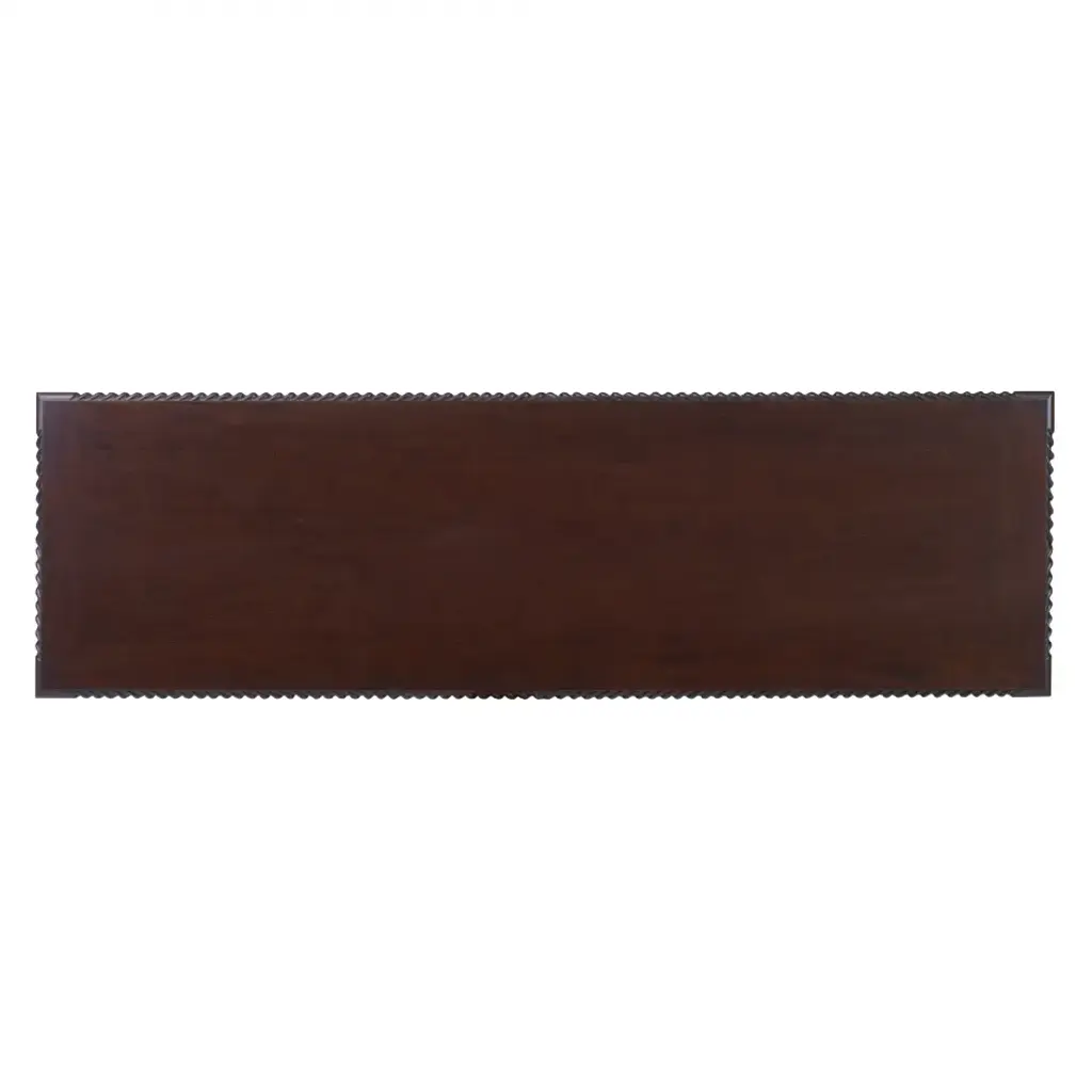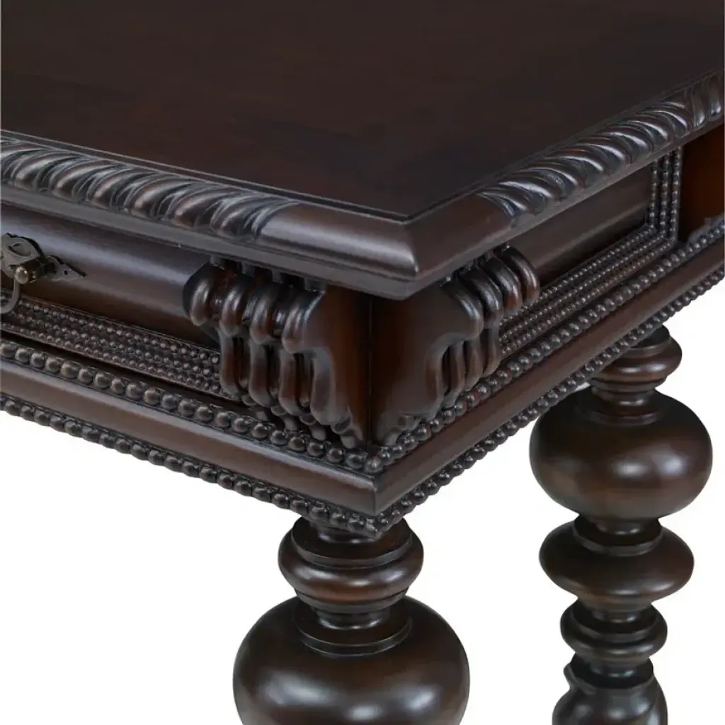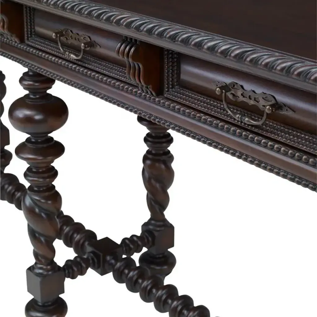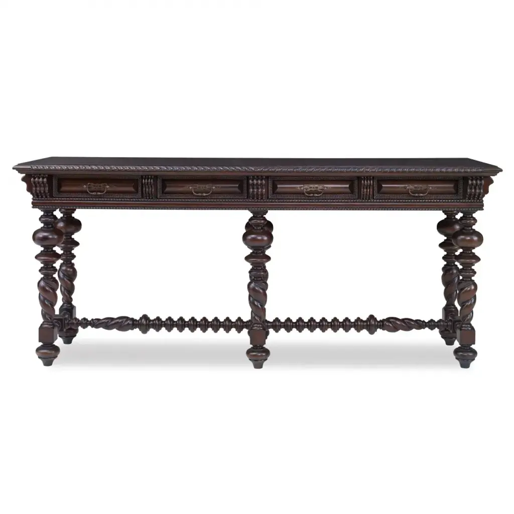 Mahogany console table with beautiful carving details, twisted, turned legs, and spindle stretchers. Finished in dark, rich mahogany. Includes four drawers.