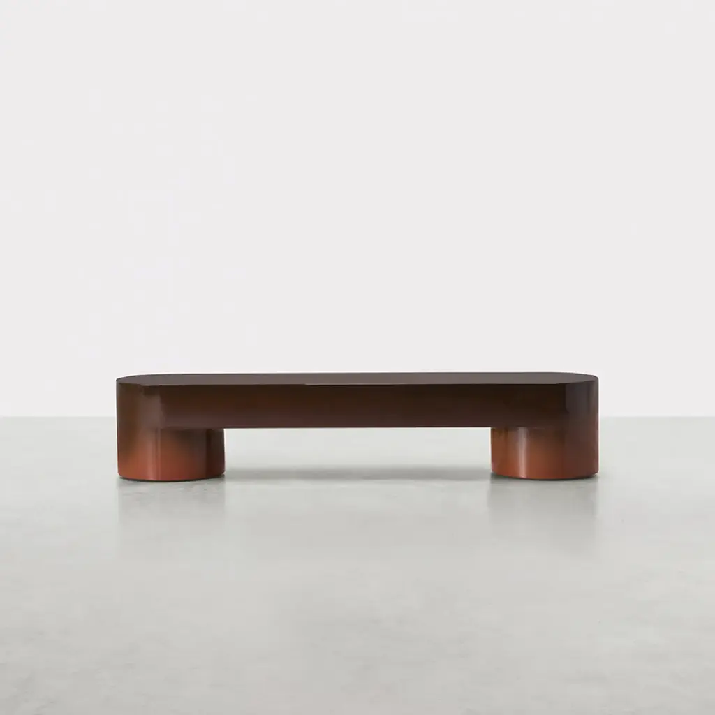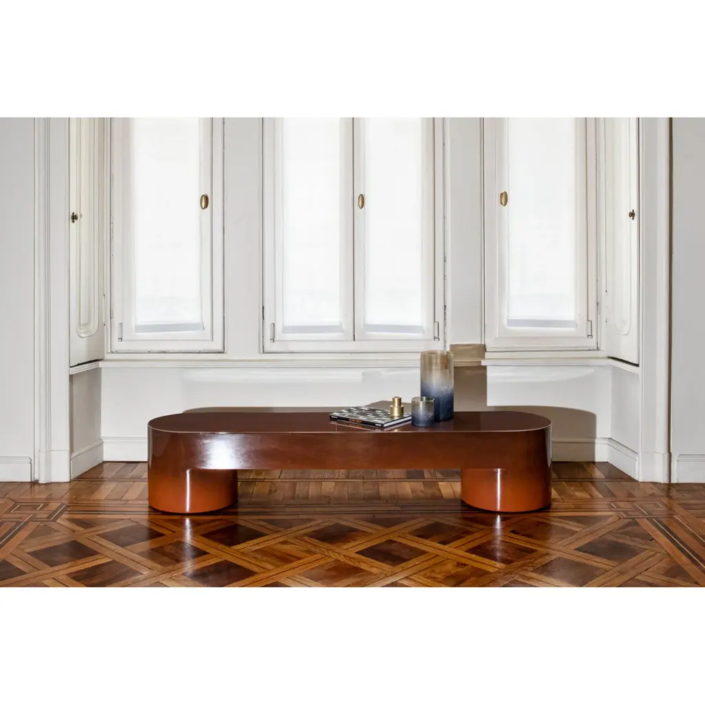 Indulge in luxury with Lazy-O, featuring a lightened mdf monolithic structure and a nuanced copper brown lacquered polyester high gloss finish. The exaggerated volumes of this collection, including a console table, side tables, and a bench, are a mantra of elegant design. Elevate your space with Lazy-O.