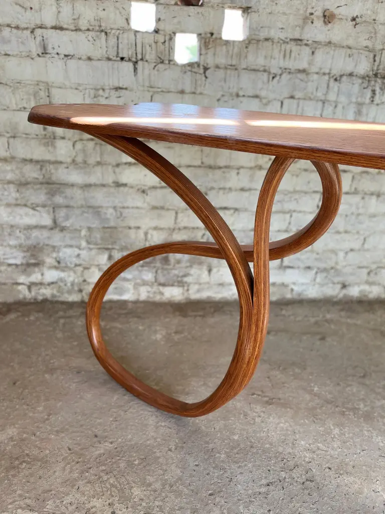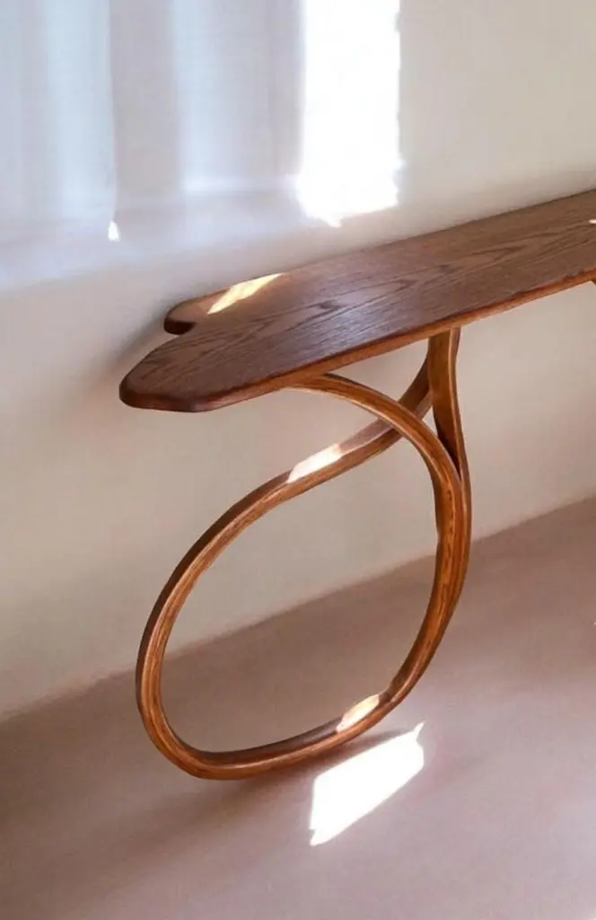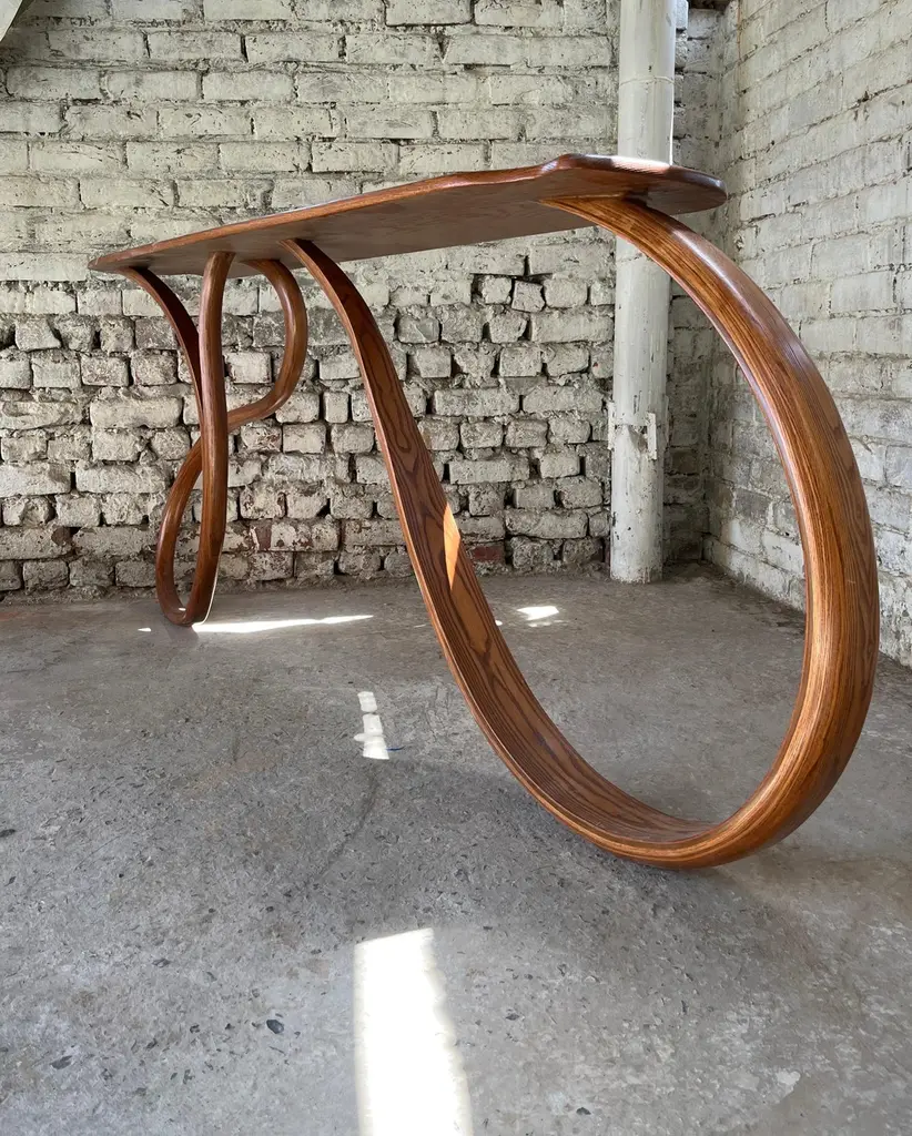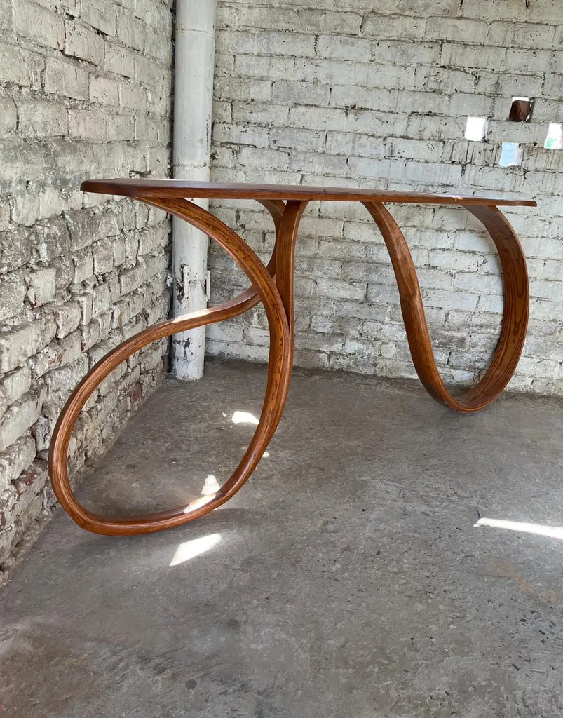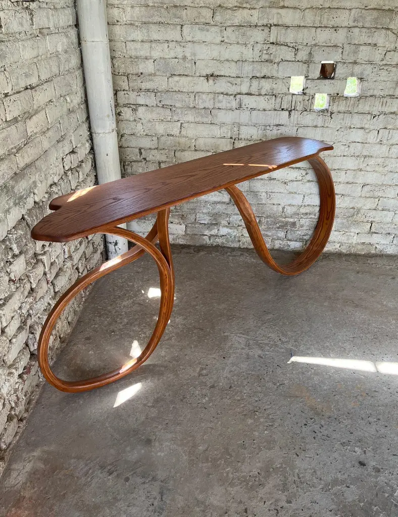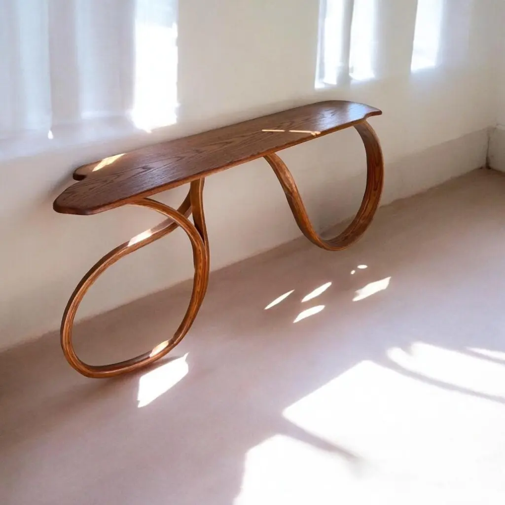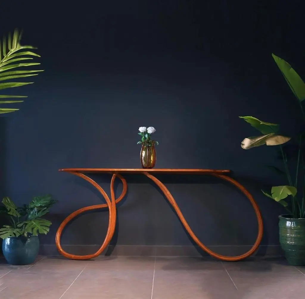 The Motus console II is designed using theancient Japanese technique of woodbending. At Raka Studio we create designsusing this technique which are fluid in theirform and are coherent with the laws ofnature. The base design is constantly inmotion and there are no straight edges, oneextension seamlessly emerges from theother as if it were a branch growing out of atrunk.The base which also balances the wholestructure holds the solid wood top from multiplepoints. The base design has been slashed as if were seamlessly vanishing into the top.The Motus console II is a limited edition pieceand can be customized in dimensions anddifferent stain finishes.