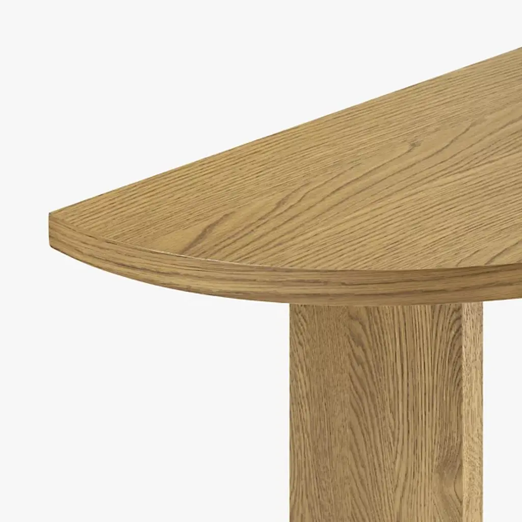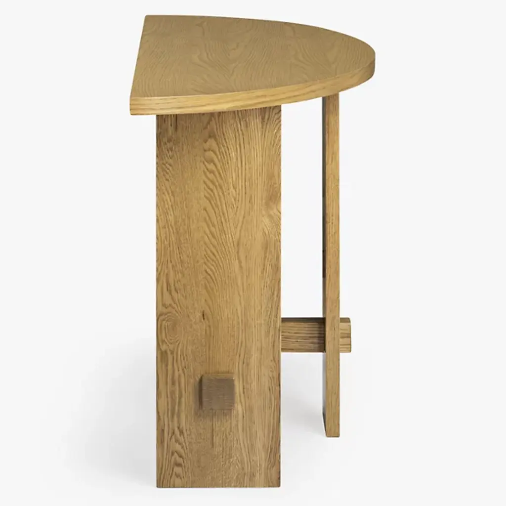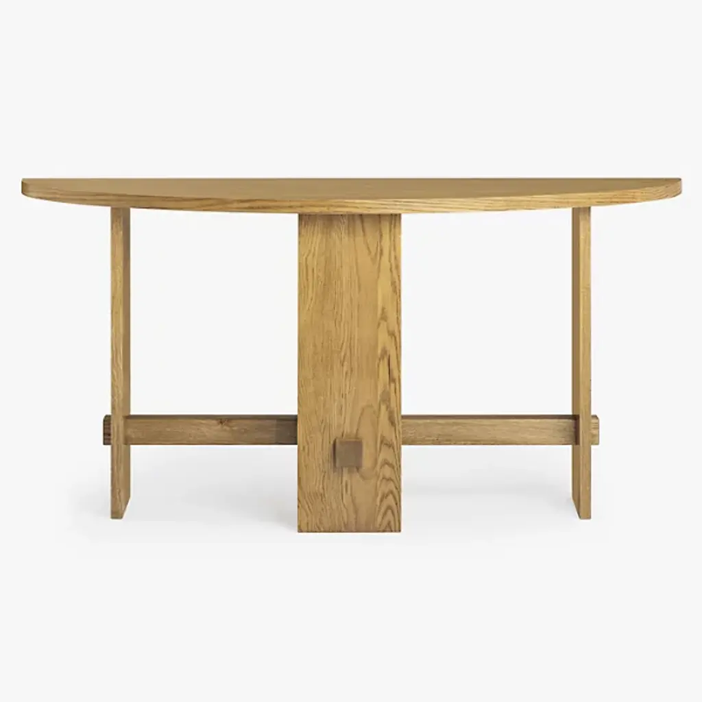 The Muckleroy Demi Lune Console Table from Alder & Ore is a poetic half-moon that graces your entryway or hallway. Its gently curved form, hewn from honey-hued oak, echoes the welcoming embrace of a new day's dawn. Its slender profile belies its strength, offering a stable surface for keys, mail, or decorative objects. This table is a daily greeting, a silent host that sets the tone for your home's interior narrative.