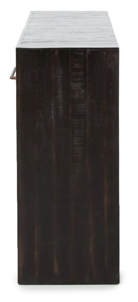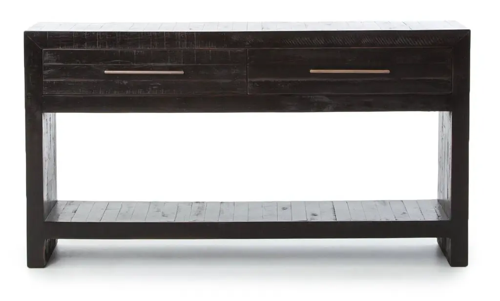 A hand-rubbed, burnished black finish draws the eye with high-low contrasts to modernize a mid-century shape. Brass-finished hardware adds a sleek touch to console's spacious dual drawers.