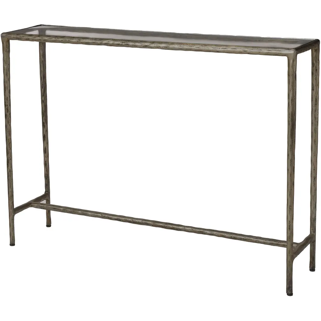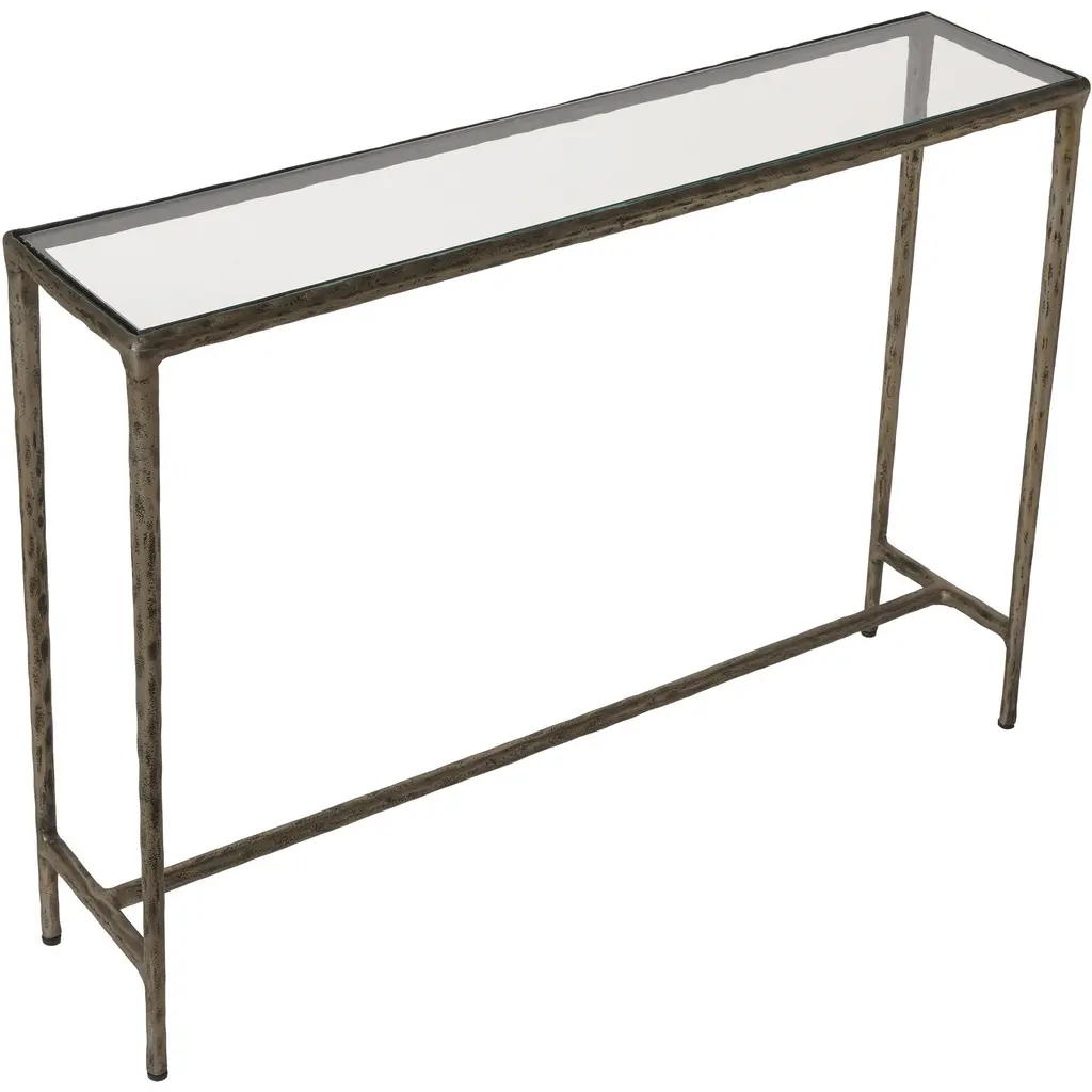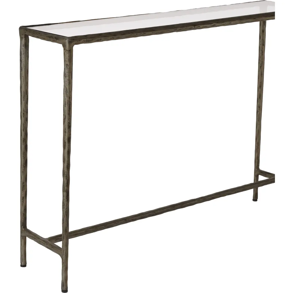 An excellent way to fill small spaces and add function to a room, this console table will also help inject personality to any transitional interior. Designed using cast aluminum and tempered glass for strength and an antique brass patina for a classic touch, this stylish table is a great pick for placing in an entryway, hallway or behind a sofa to elevate any space.