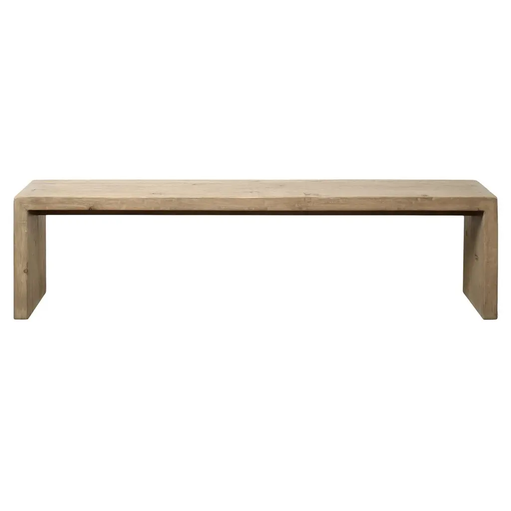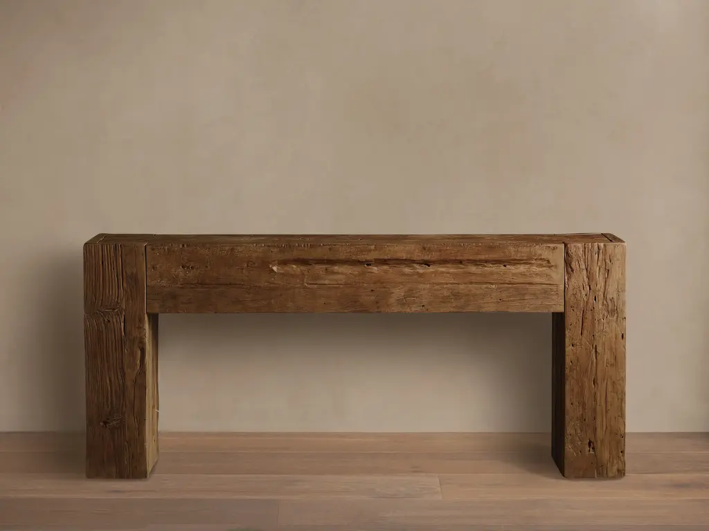 Solid salvaged oak wood beam console table with natural brown finish. Simple rustic modern design, featuring butterfly enclosure details. Each will vary in exact tones, grain, and inherent imperfections.