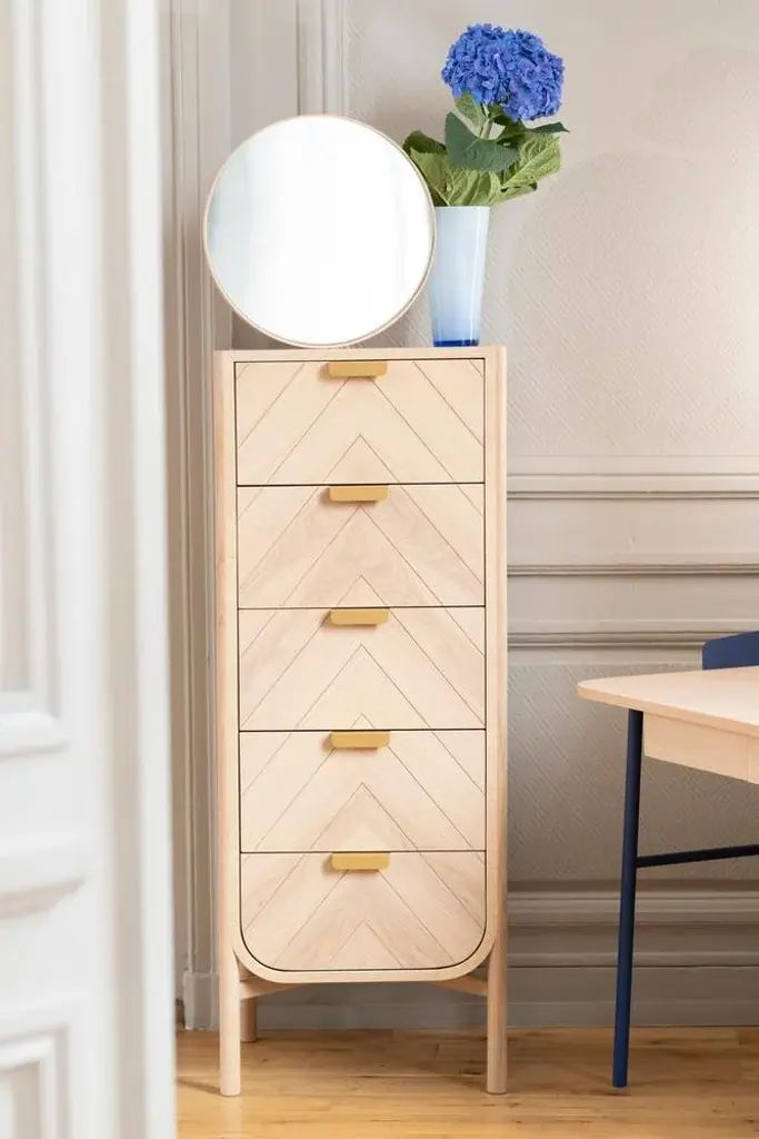Natural oak marius console table by harto dimensions: w 100 x d 36.5 x h 90 cm. Materials: solid wood, mdf wood veneer. Weight: 20.0 kg the marius console, with its drawer engraved with chevrons and its refined brass handle, is suitable for all uses, in an entrance hall, in the living room or in a bedroom.