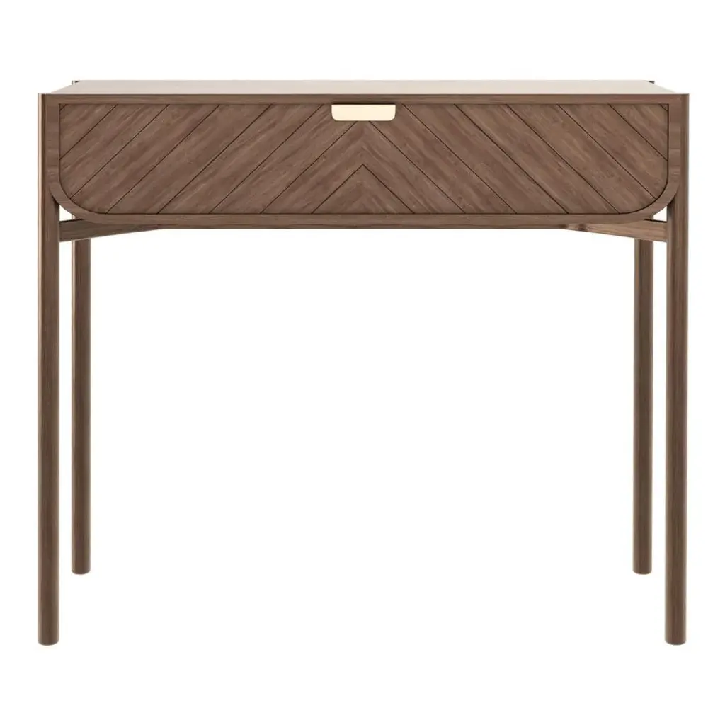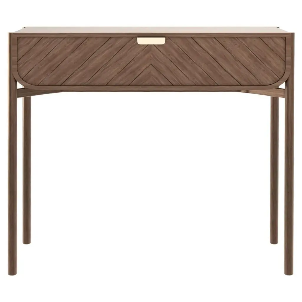 Natural walnut marius console table by harto dimensions: w 100 x d 36.5 x h 90 cm. Materials: solid wood, mdf wood veneer. Weight: 20.0 kg the marius console, with its drawer engraved with chevrons and its refined brass handle, is suitable for all uses, in an entrance hall, in the living room or in a bedroom.