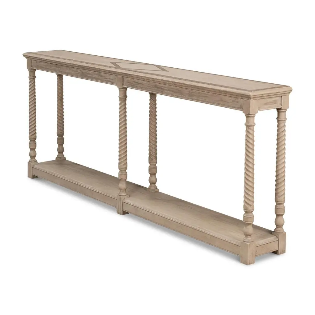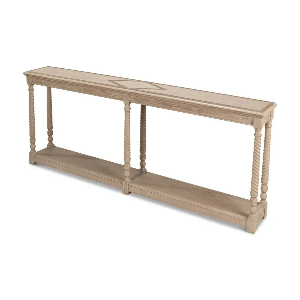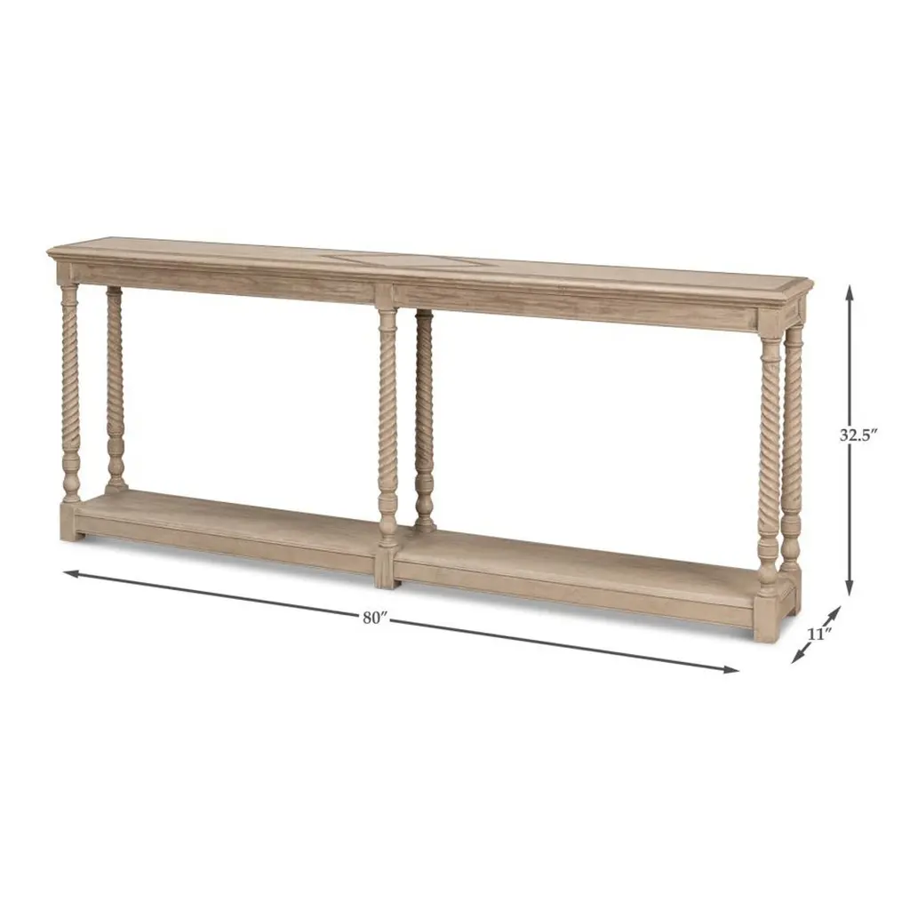 Neo Classic pine console table with our barn gray finish, the lozenge inlaid and crossbanded top with a molded edge above six spiral carved tapered legs on a shelf stretcher base.Dimensions: 80" W x 11" D x 32.5" H.