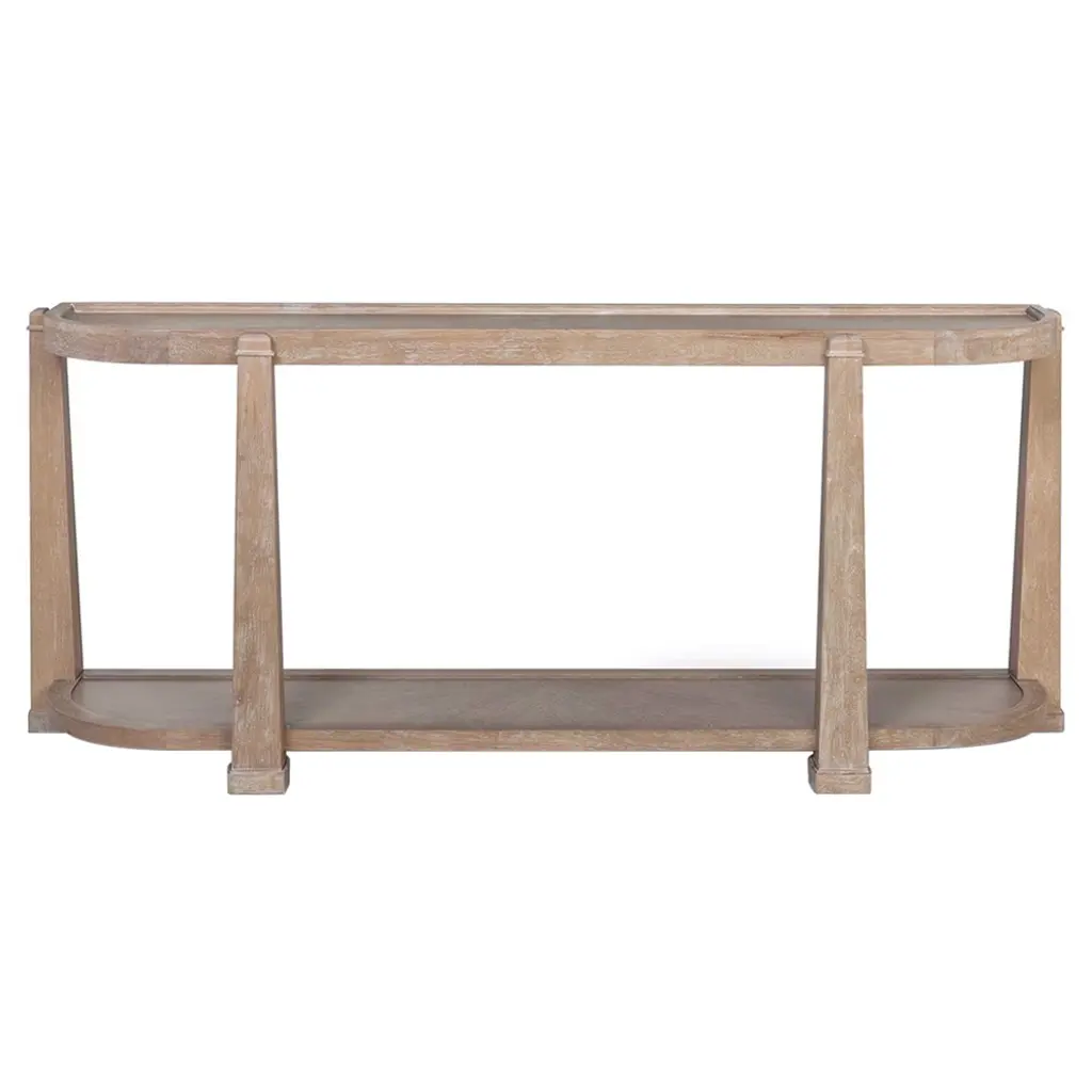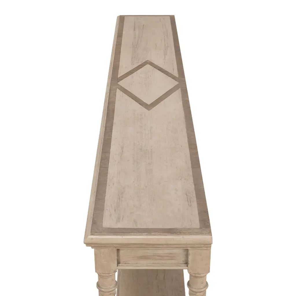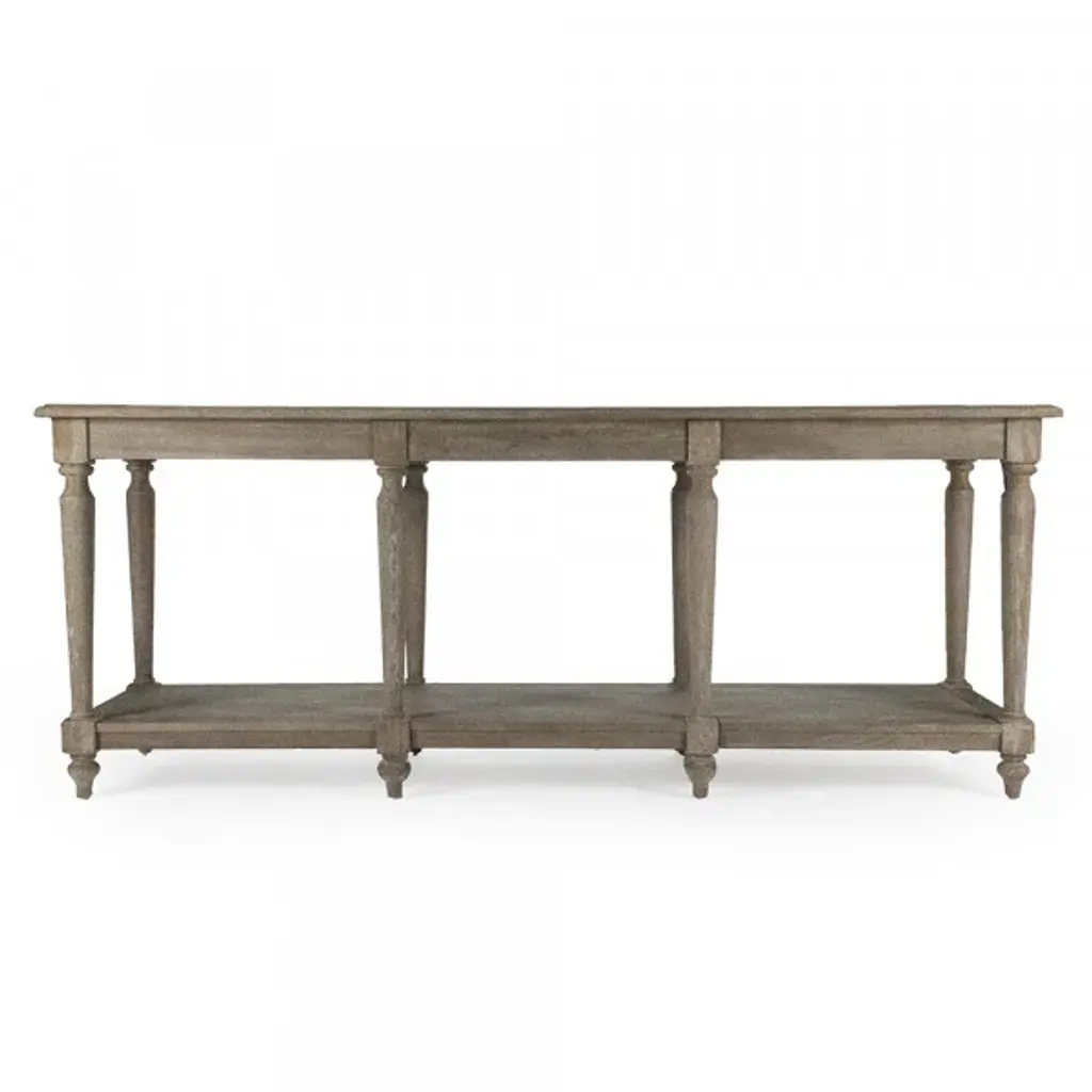 Neo Classic pine console table with our barn gray finish, the lozenge inlaid and crossbanded top with a molded edge above six spiral carved tapered legs on a shelf stretcher base.Dimensions: 80" W x 11" D x 32.5" H.