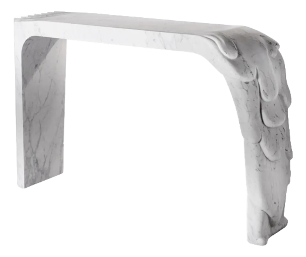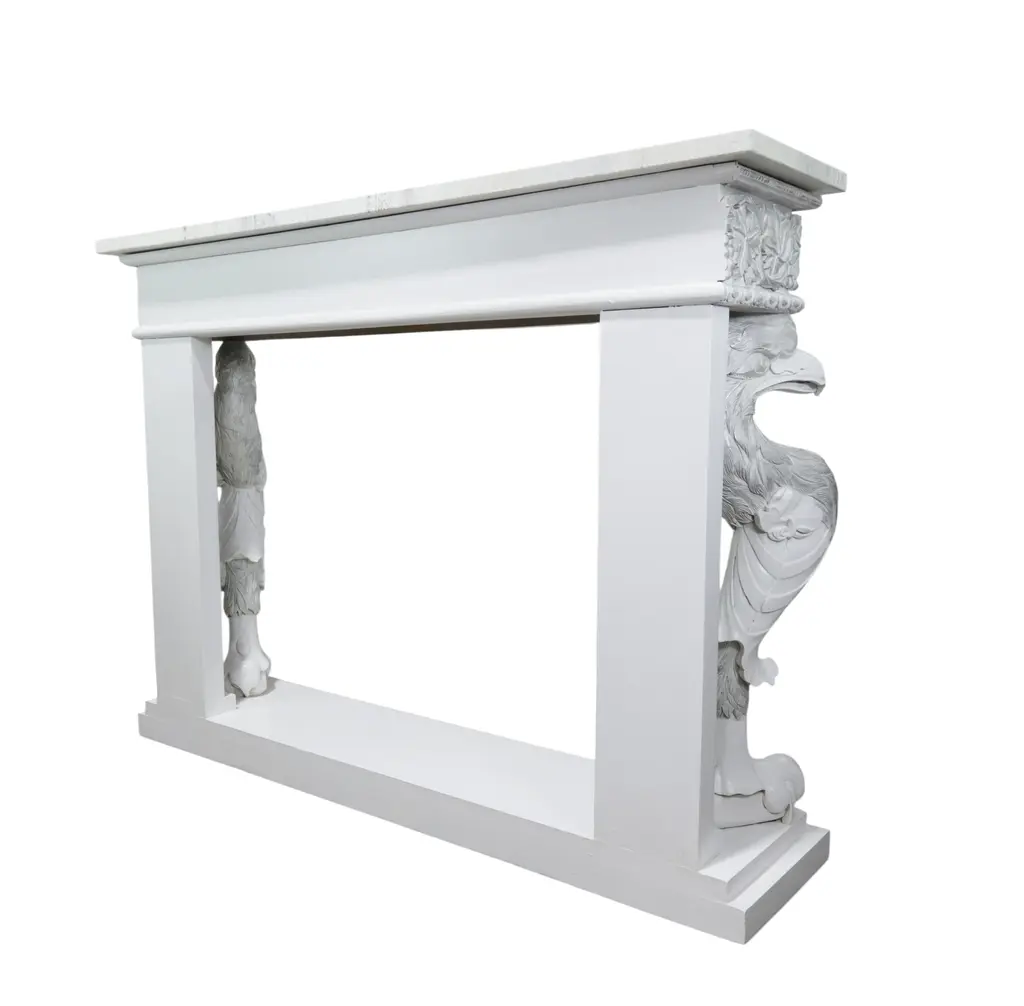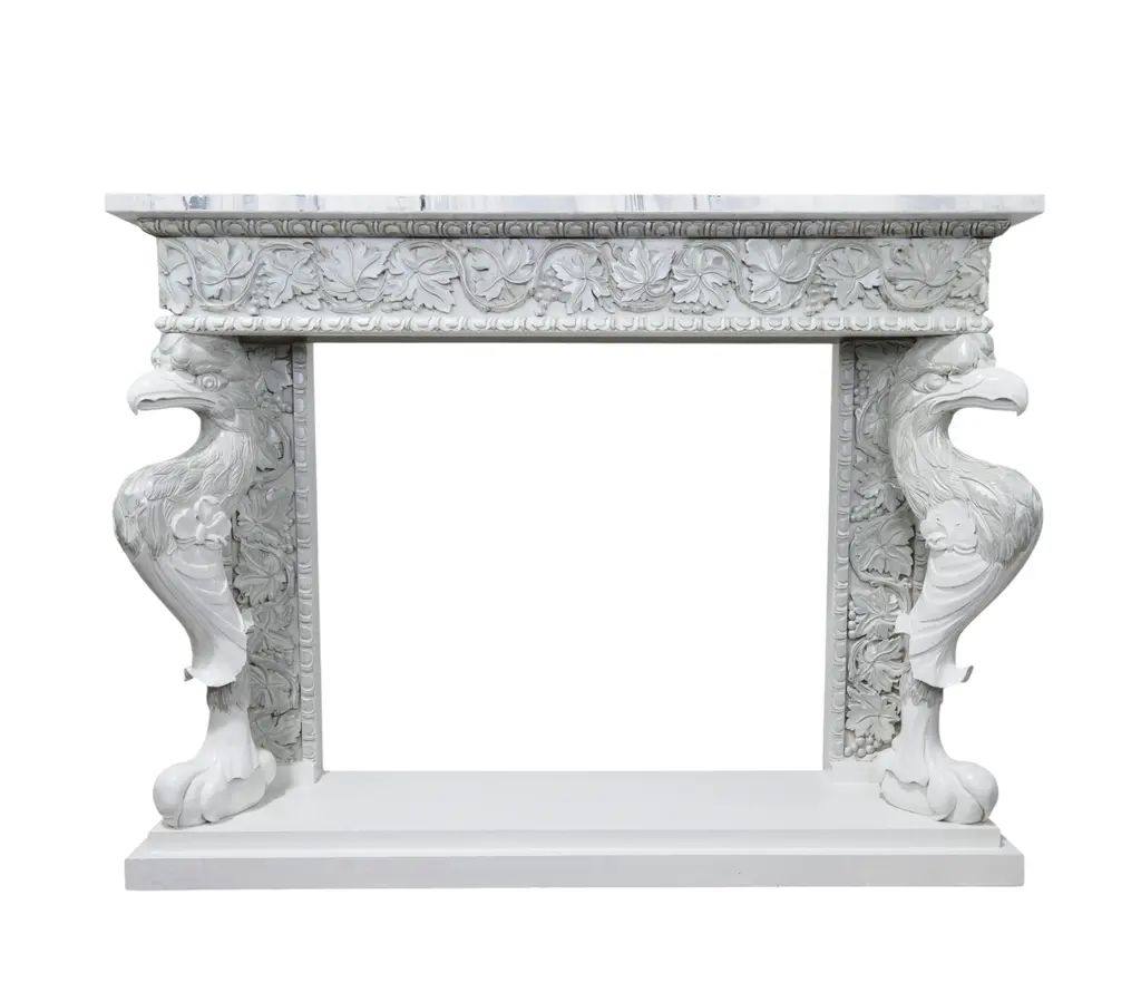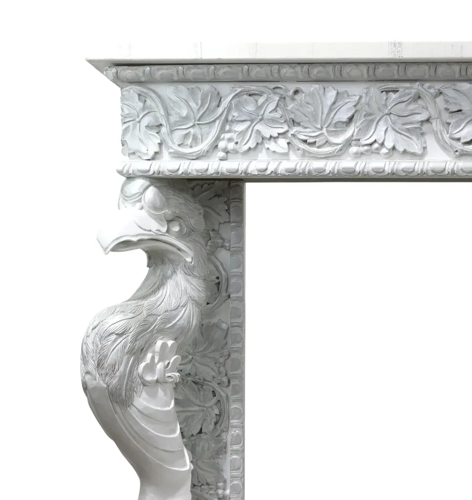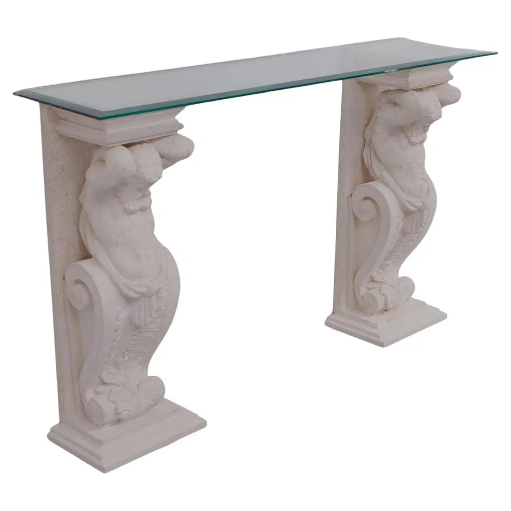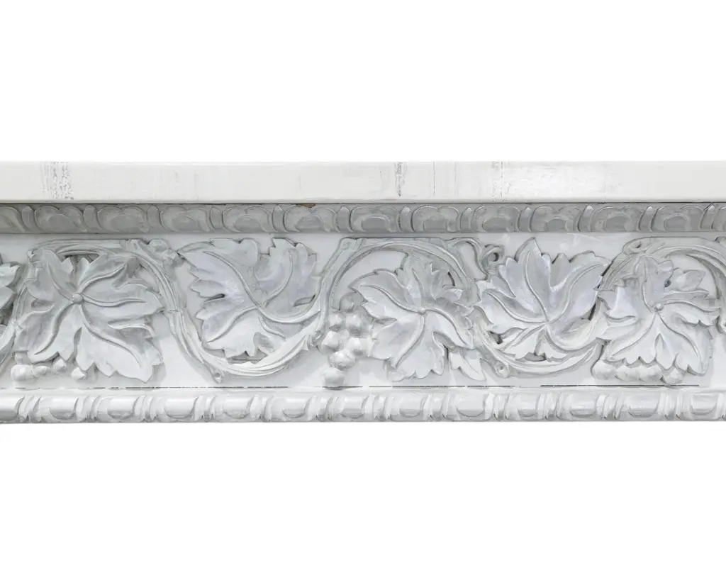 This striking neoclassical console table features a crisp white base accented with silver-gilt carvings that highlight its intricate details. The frieze is richly decorated with scrolling acanthus leaves and floral motifs, while the sides are supported by finely carved mythical bird figures, symbolizing strength and guardianship. (With a hand-painted marble top) With its symmetrical proportions, elegant profile, and shimmering silver finish, this console table blends the grandeur of the Renaissance Revival with the refinement of neoclassical design. A true statement piece, it brings both functionality and artistic sophistication to an entryway, living room, or gallery space. Please note: This table comes in a set of two, each with a different hand-painted marble top—each piece is unique (see images). We will send the top randomly, or the buyer can select their preferred top.