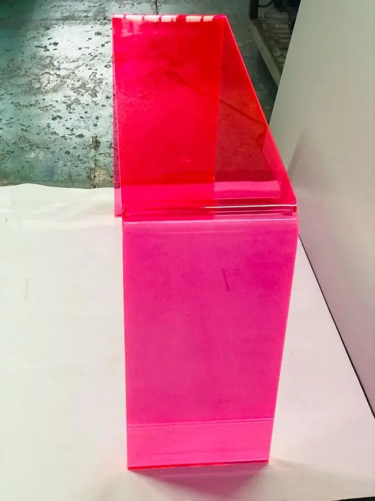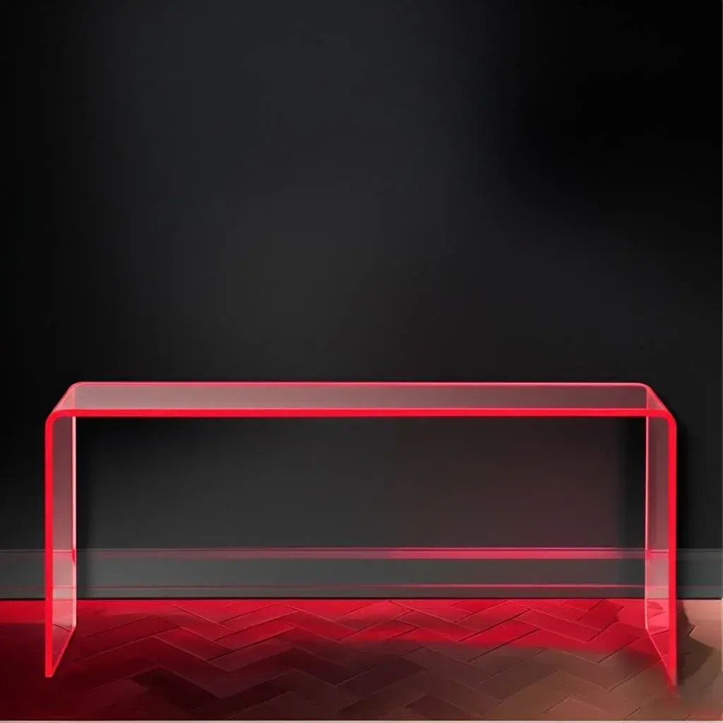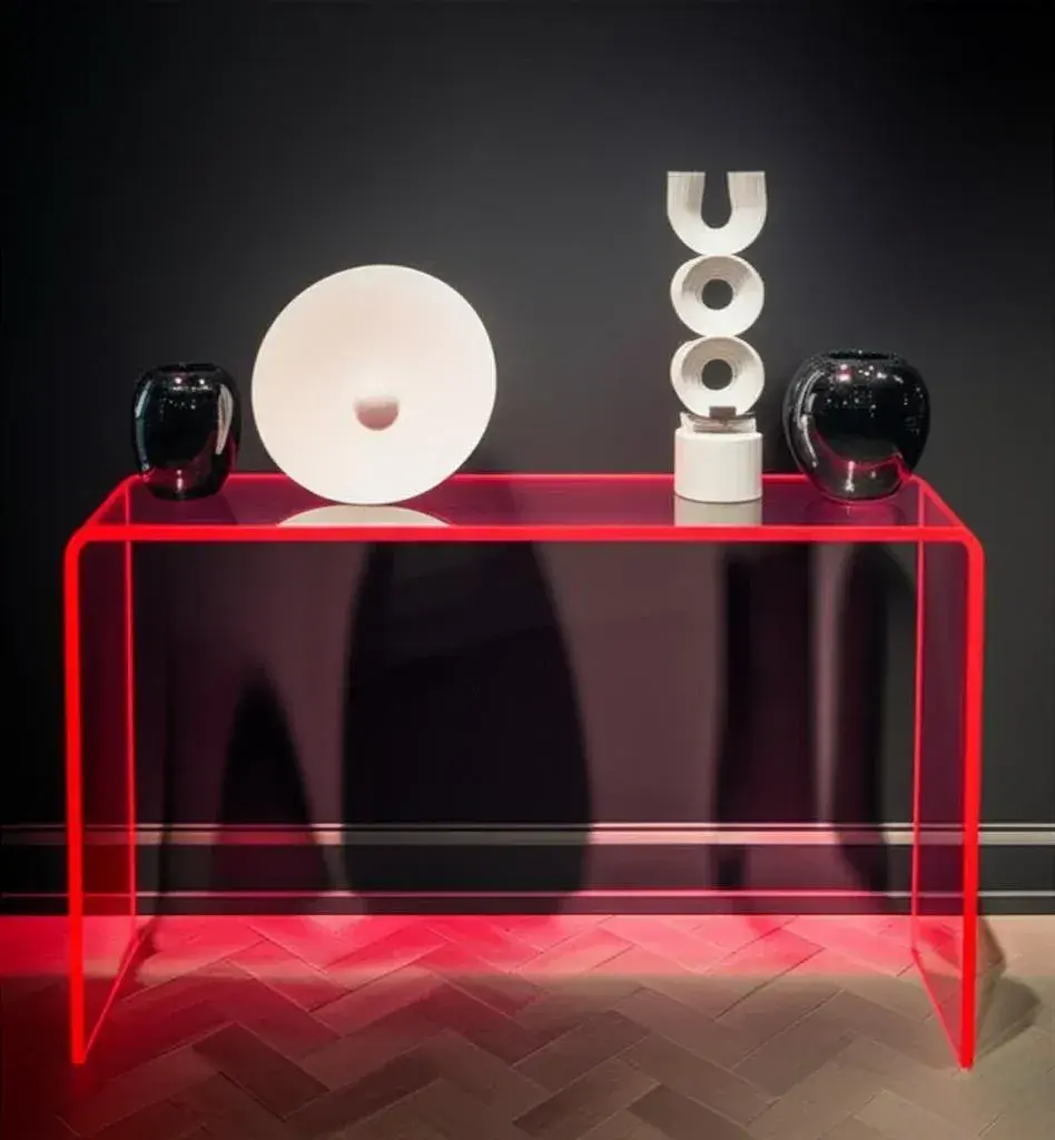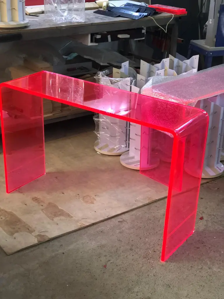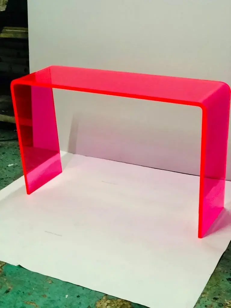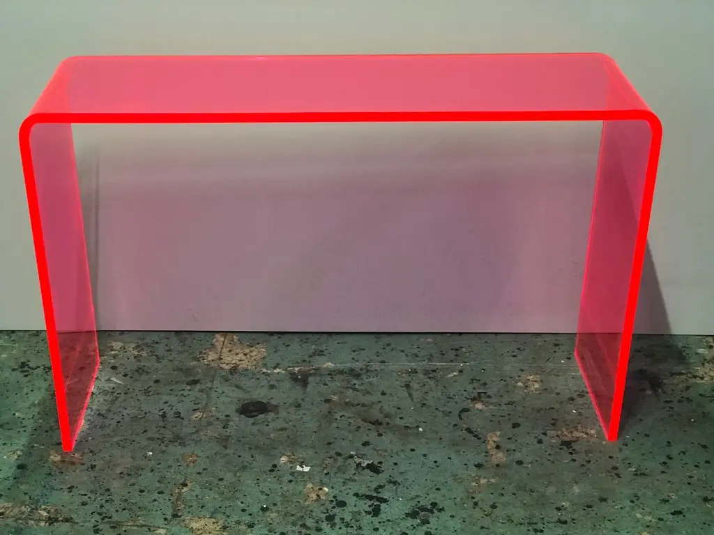 Our neon pink console table floats in a room without permanent visual seating. In a single continuous turn, thick-cut acrylic plexi will look very stylish in entrances, corridors and behind the sofa. It is made of 20 mm neon pink acrylic material. Clean with mild soap and water; dry with a soft cloth Overall dimensions Width: 38 " Depth: 15" Height: 27.5 " PRODUCTION TIME 3-4 WEEKS.