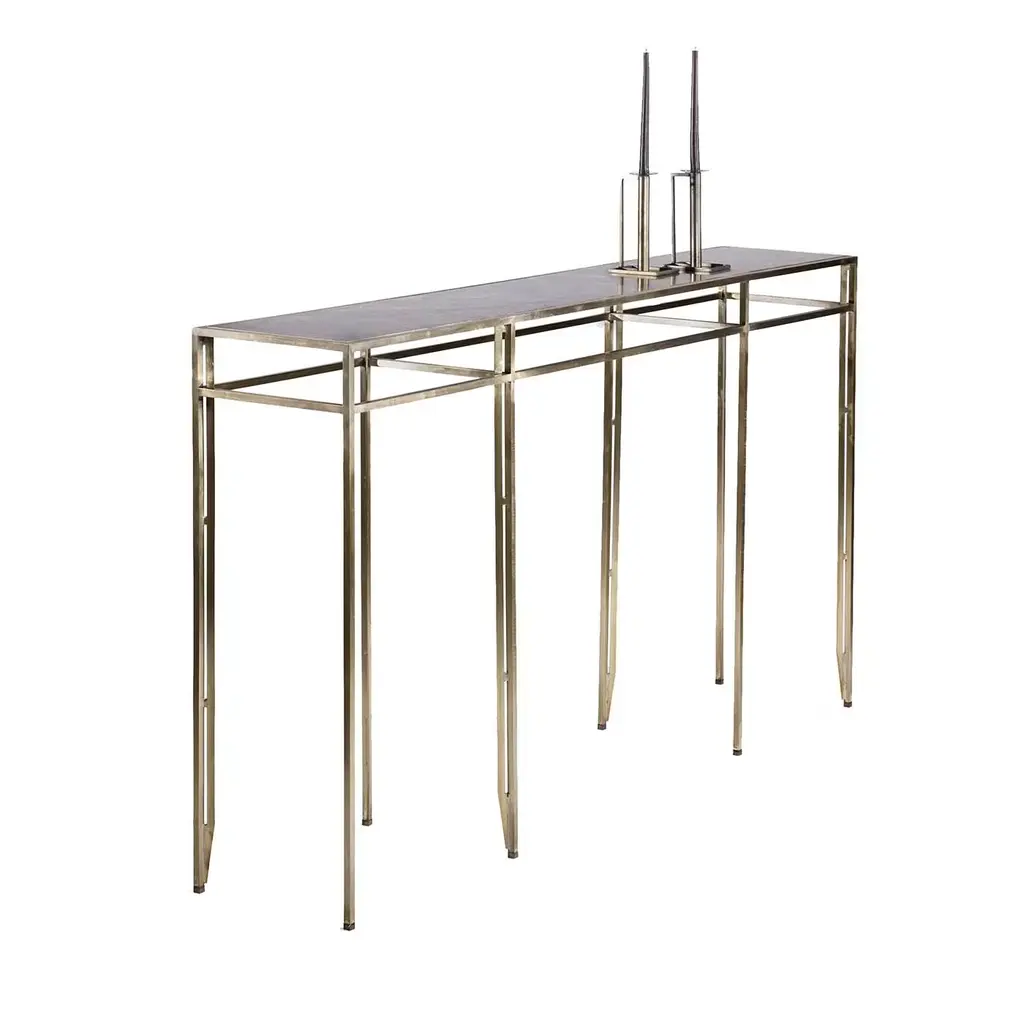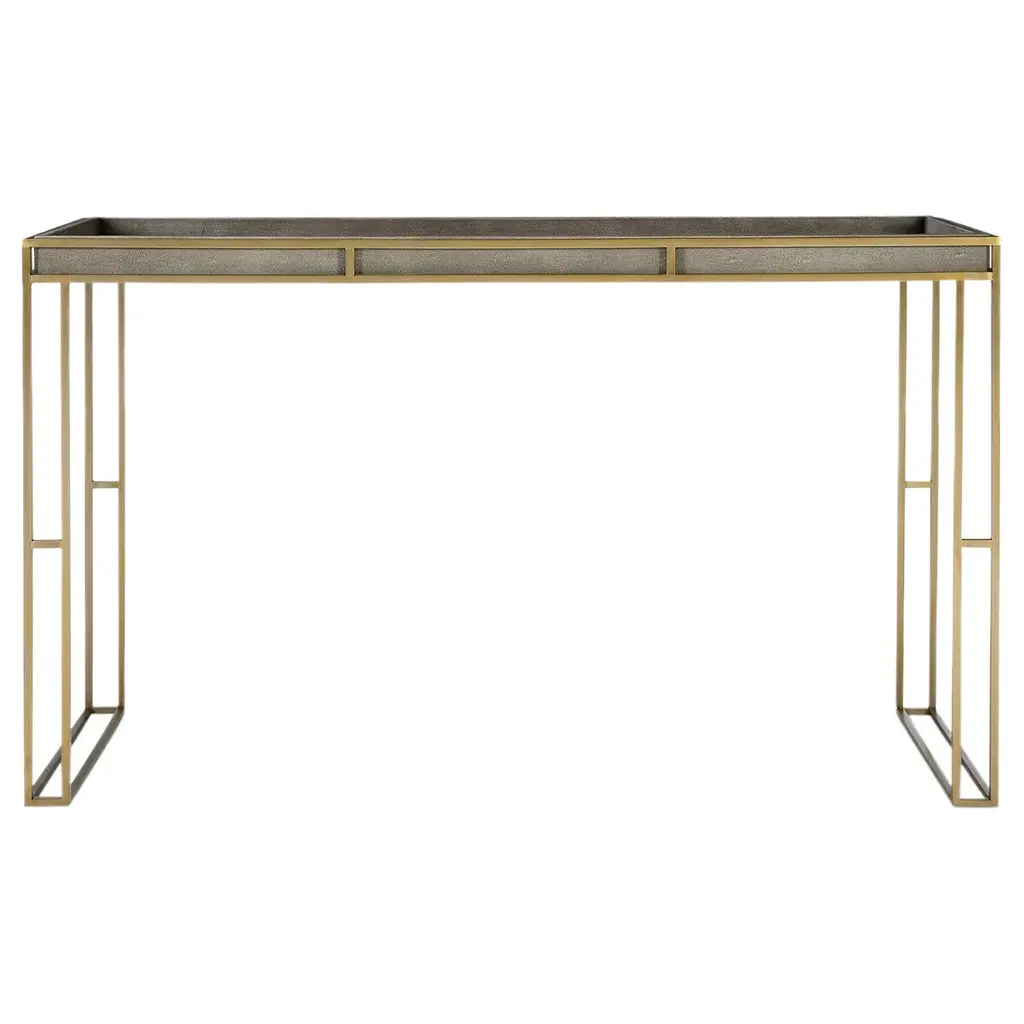 The Nerina Console Table is a testament to modern minimalist elegance, a piece that captures the essence of contemporary sophistication. Its design is a harmonious blend of sleek lines and understated luxury, inviting admiration from all who encounter it. The tray-style silhouette exudes a sense of refined simplicity, while the rich faux shagreen surface adds a touch of opulence, reminiscent of the finest textures. Supported by a plated brushed brass steel frame, this console table stands as a beacon of strength and style, effortlessly enhancing any space it graces. The Nerina Console Table is more than just a piece of furniture; it is a statement of taste and a celebration of modern design.