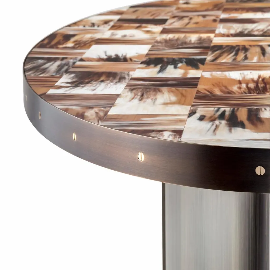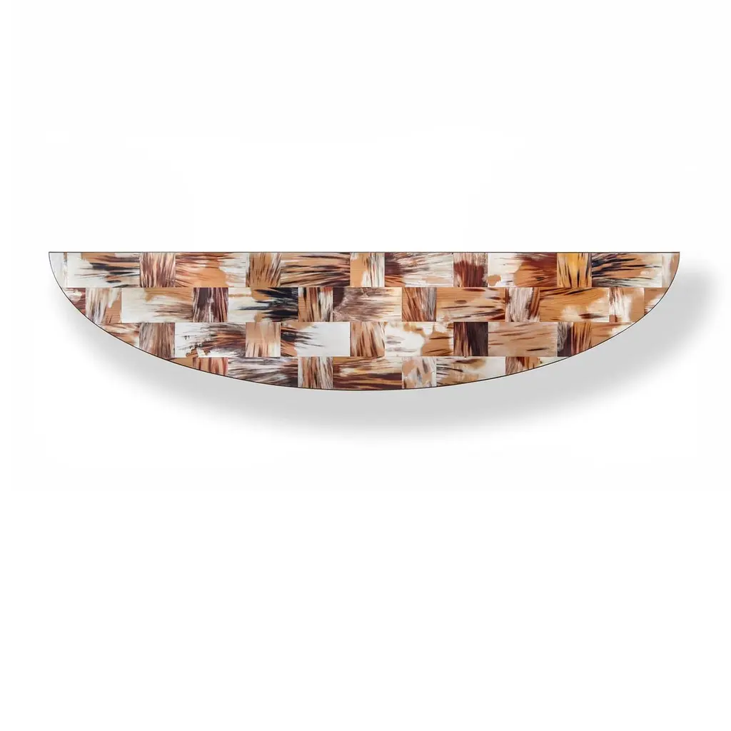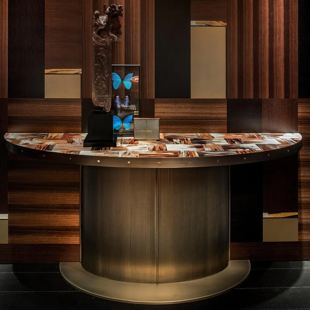 Luxury materials and impeccable craftsmanship converse together in our Nettuno console table. An intertwined motif of matte Corno Italiano tiles, meticulously paired by expert artisans, characterize its top and offer unmistakable style and excellence. Supported by a sturdy structure in burnished brass-plated stainless steel, the design is added a modern touch by a beautiful edging accented with contrasting screws in 24-karat gold plated brass. With its half-moon silhouette, this console table works particularly effectively placed against walls and it’s sure to provide a fabulous focus in your entryway.Note: Colors and shades of Corno Italiano processed by our Company are unique and due to the natural origin of raw material. For this reason Corno Italiano tones that can be seen in pictures are indicative and can not be reproduced in finished products.