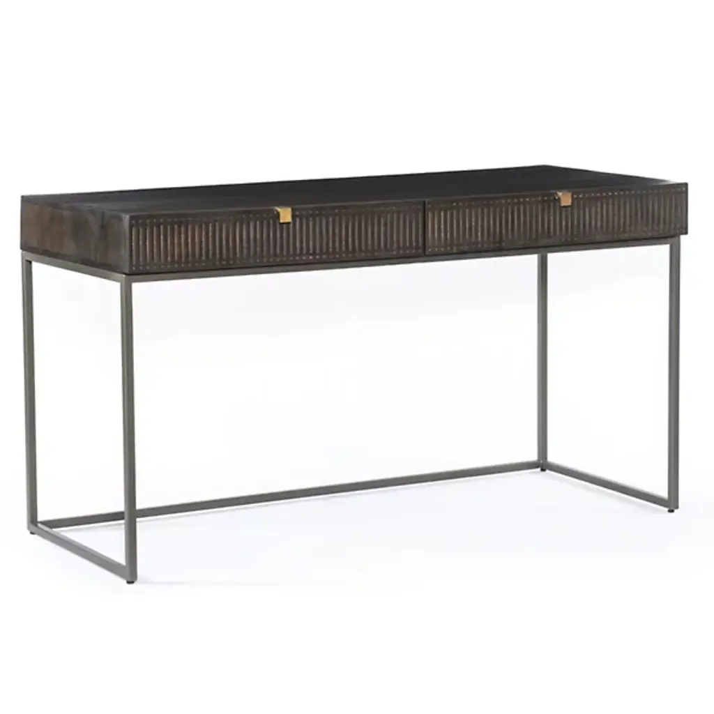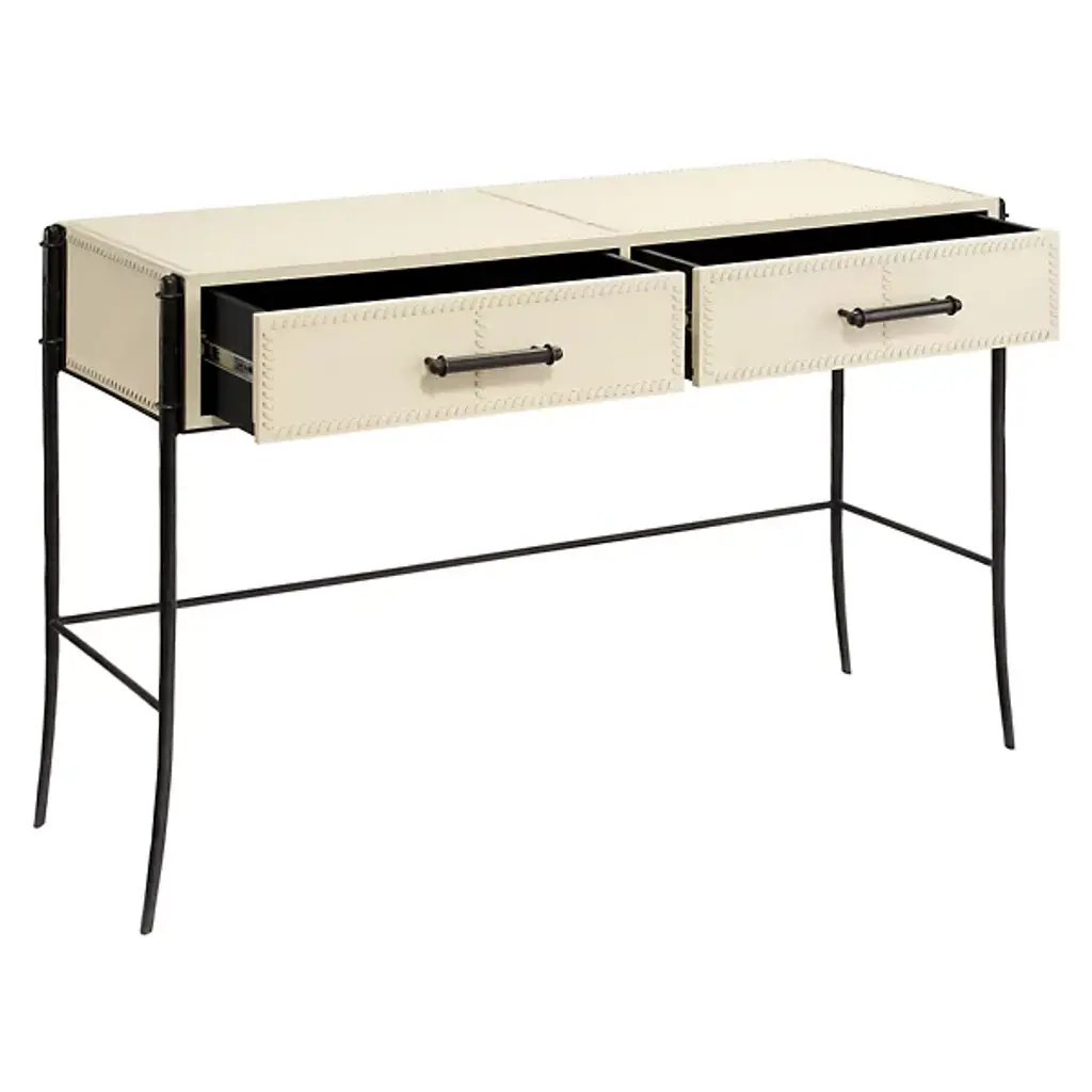 The Nevado Console Table from Jamie Young Co. unites iron craftsmanship with leather detailing. Two smooth-gliding drawers provide discreet storage behind leather-wrapped fronts with iron pulls. The hand-forged frame shows the metalsmith's skill through precise angles and considered proportions. Detailed stitching adds minimalist interest to the leather elements. East Asian and Western design influences come together in this functional piece, suitable for entryways or living spaces.
