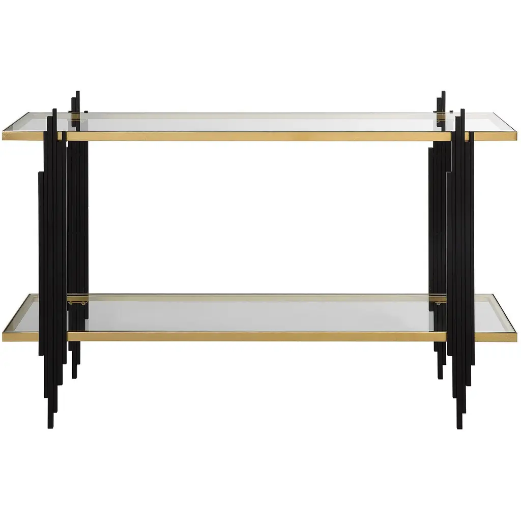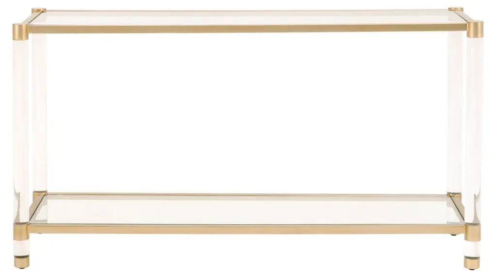 Clear acrylic legs and a brushed-brass frame give this streamlined console table glamour that will never go out of style. The tempered-glass bottom shelf and top add to the table's sleek finesse.
