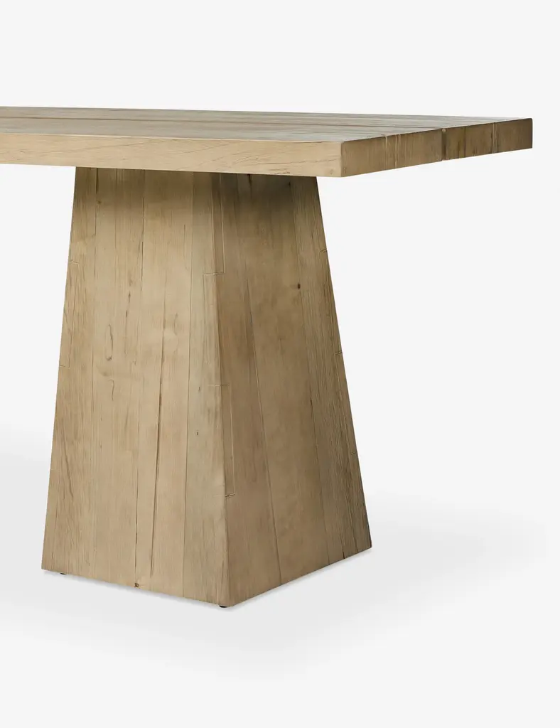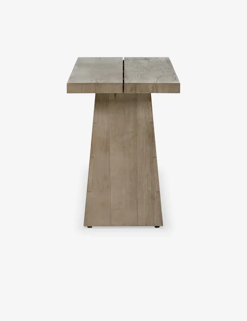 Roughhewn wood brings farmhouse charm to the rustic profile of this wood console table. Its generous proportions include a wide tabletop on tapered pedestal legs, fashioning a sculptural sofa or entryway full of organic character.