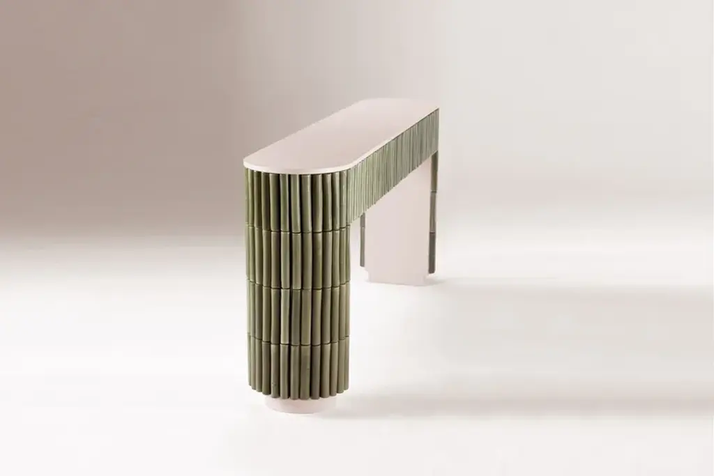 Exceptional in its craftwork, Nouvelle Vague is a consolle that rejects traditional conventions in favor of experimentation. Round ceramic handmade pieces, painted in a unique craquele glaze are placed around a lacquered center top, creating a sense of movement that evokes the motion of the waves.Top: Lacquered woodStructure: Mar di Giava ceramic tiles