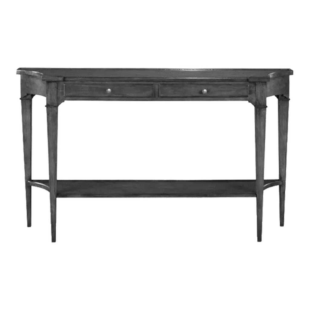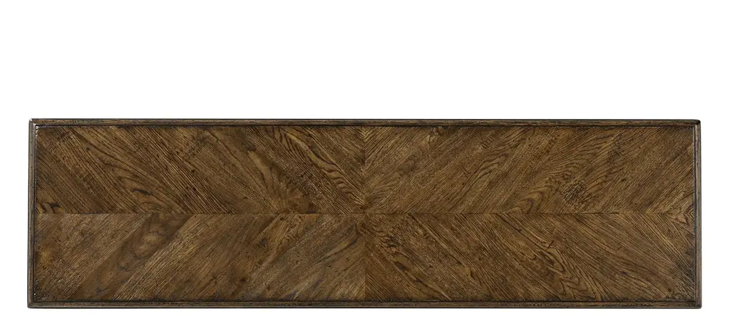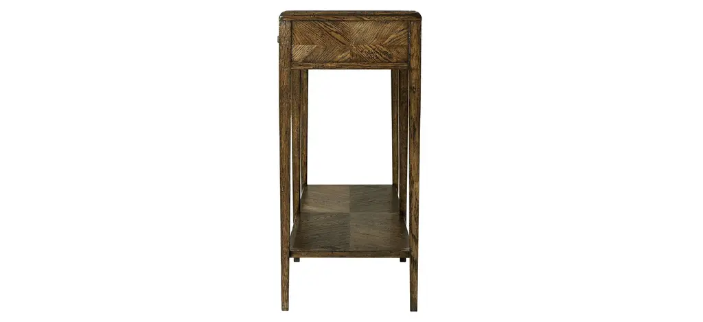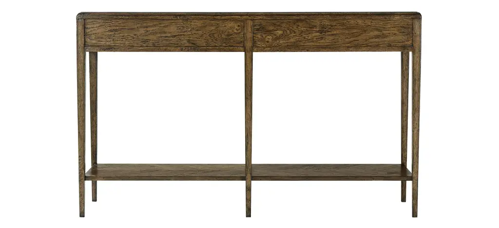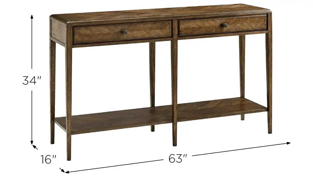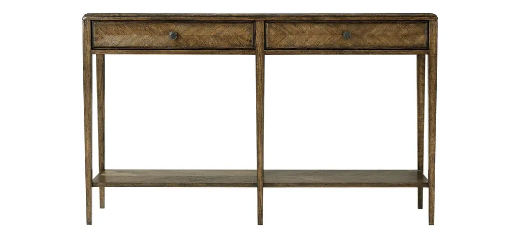 Accentuated with tapered legs and bold Verde Bronze finished handles, Nova's rustic two tiered mirrored herringbone console table includes a rectangular oak parquetry top and two frieze drawers in the Dusk finish.