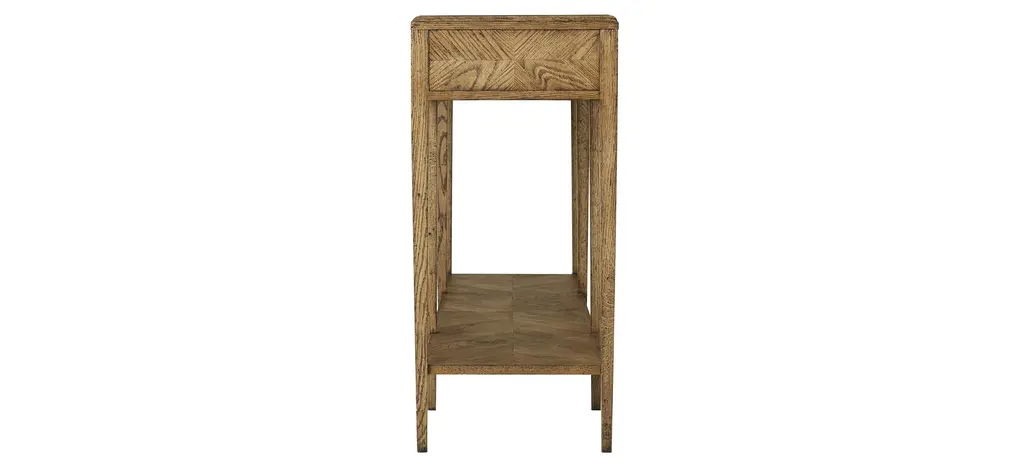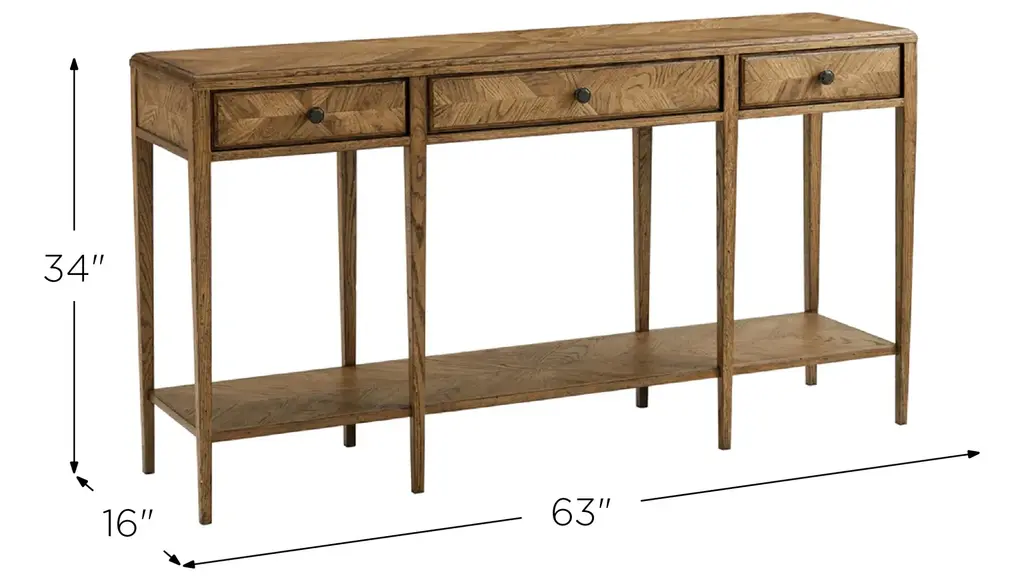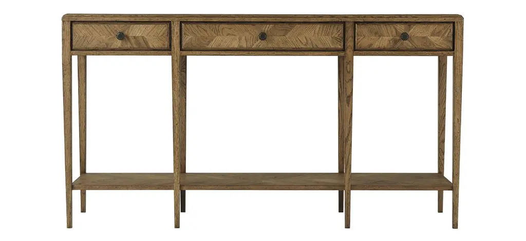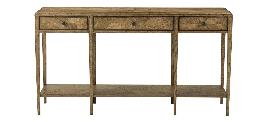 Displaying Nova's instantly recognizable mirrored herringbone oak parquetry on its top and drawer faces, this two tiered console table with three frieze drawers shines in our Dawn finish. Completed with three Verde Bronze finished handles and solid tapered oak legs.