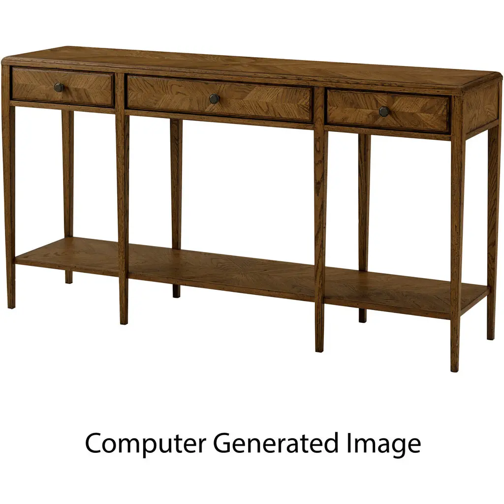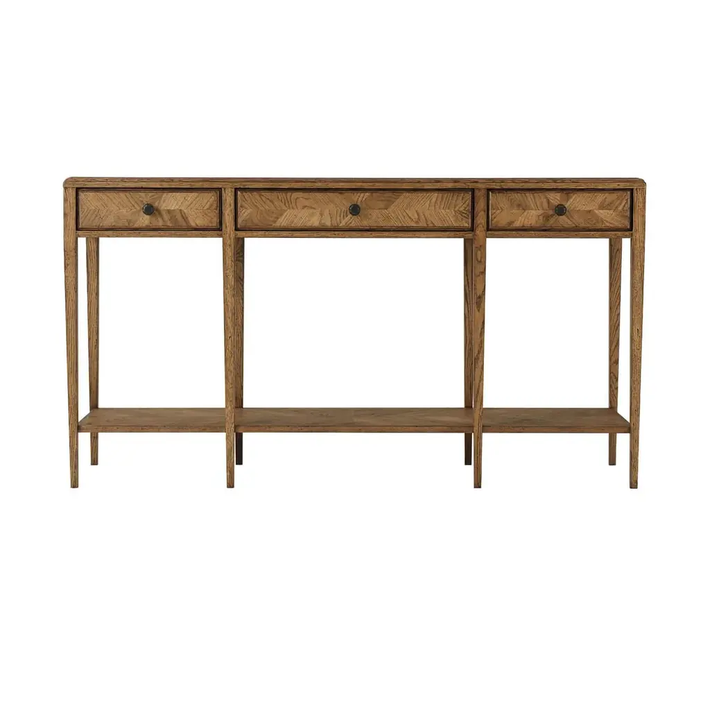 An oak parquetry two-tier console table with mirrored herringbone oak parquetry on its top and drawer faces. This two-tiered table includes three frieze drawers accented with Verde Bronze finished handles and has solid tapered legs. It is shown in our Dawn finish. Dimensions: 63" W x 16" D x 34" H