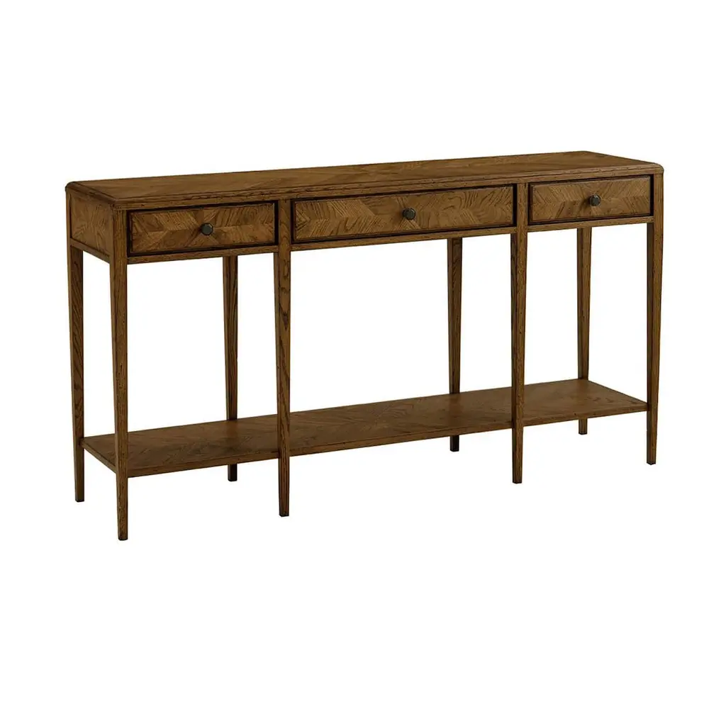 A dark oak parquetry two-tier console table with mirrored herringbone oak parquetry on its top and drawer faces. This two-tiered table includes three frieze drawers accented with Verde Bronze finished handles and has solid tapered legs. It is shown in our dusk finish. Dimensions: 63" W x 16" D x 34" H.