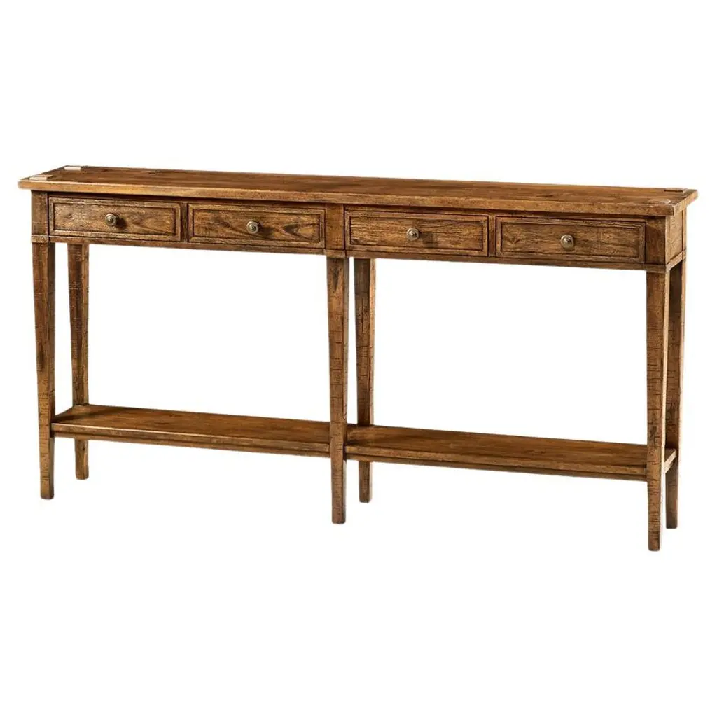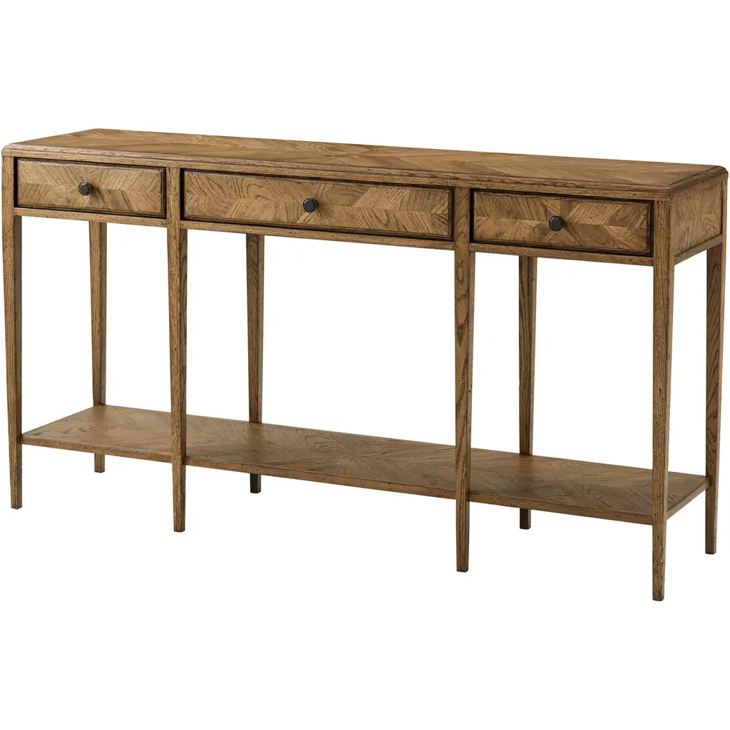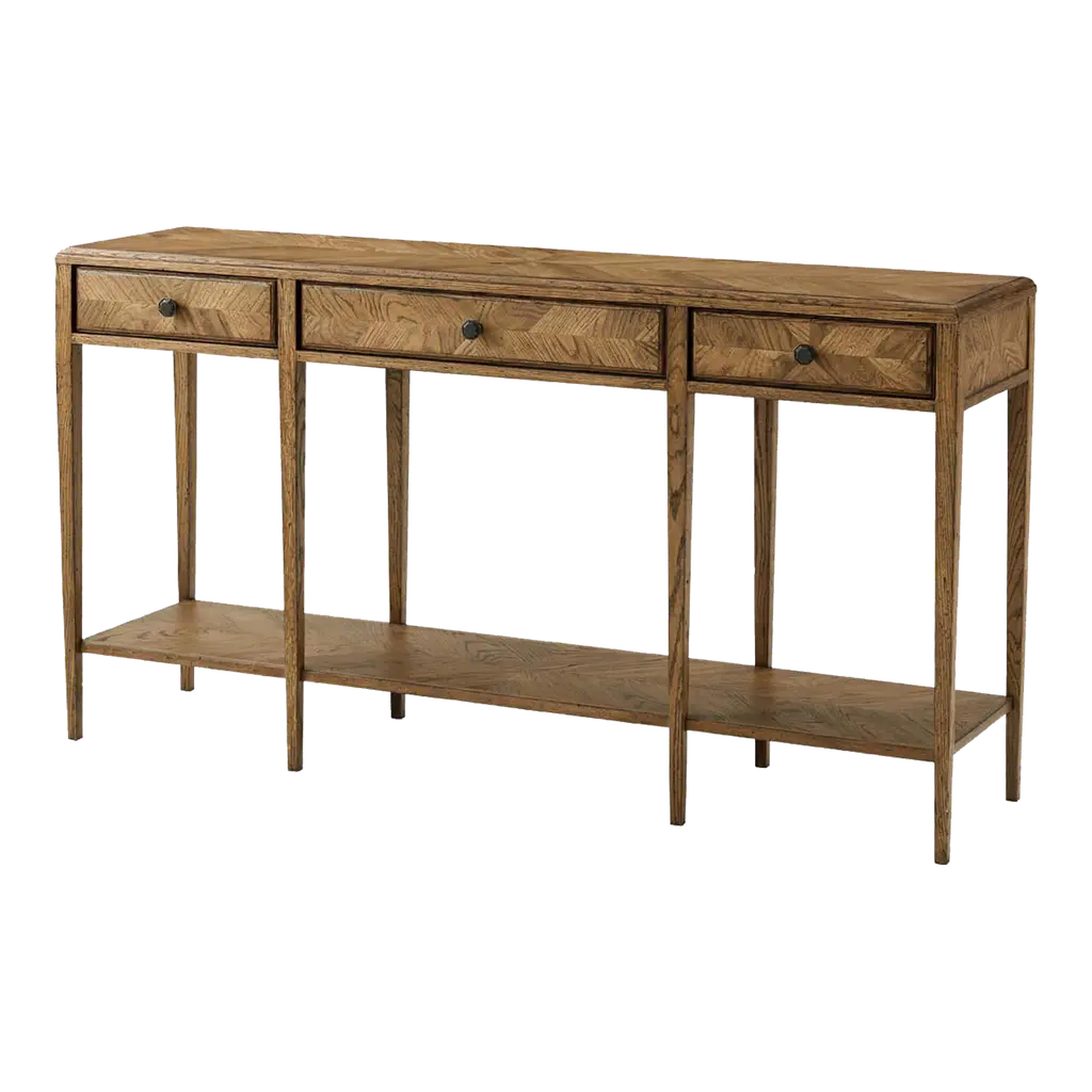 A dark oak parquetry two-tier console table with mirrored herringbone oak parquetry on its top and drawer faces. This two-tiered table includes three frieze drawers accented with Verde Bronze finished handles and has solid tapered legs. It is shown in our dusk finish. Dimensions: 63" W x 16" D x 34" H