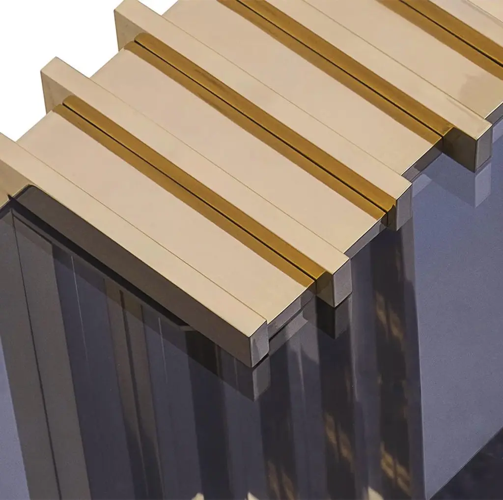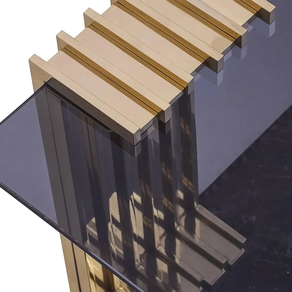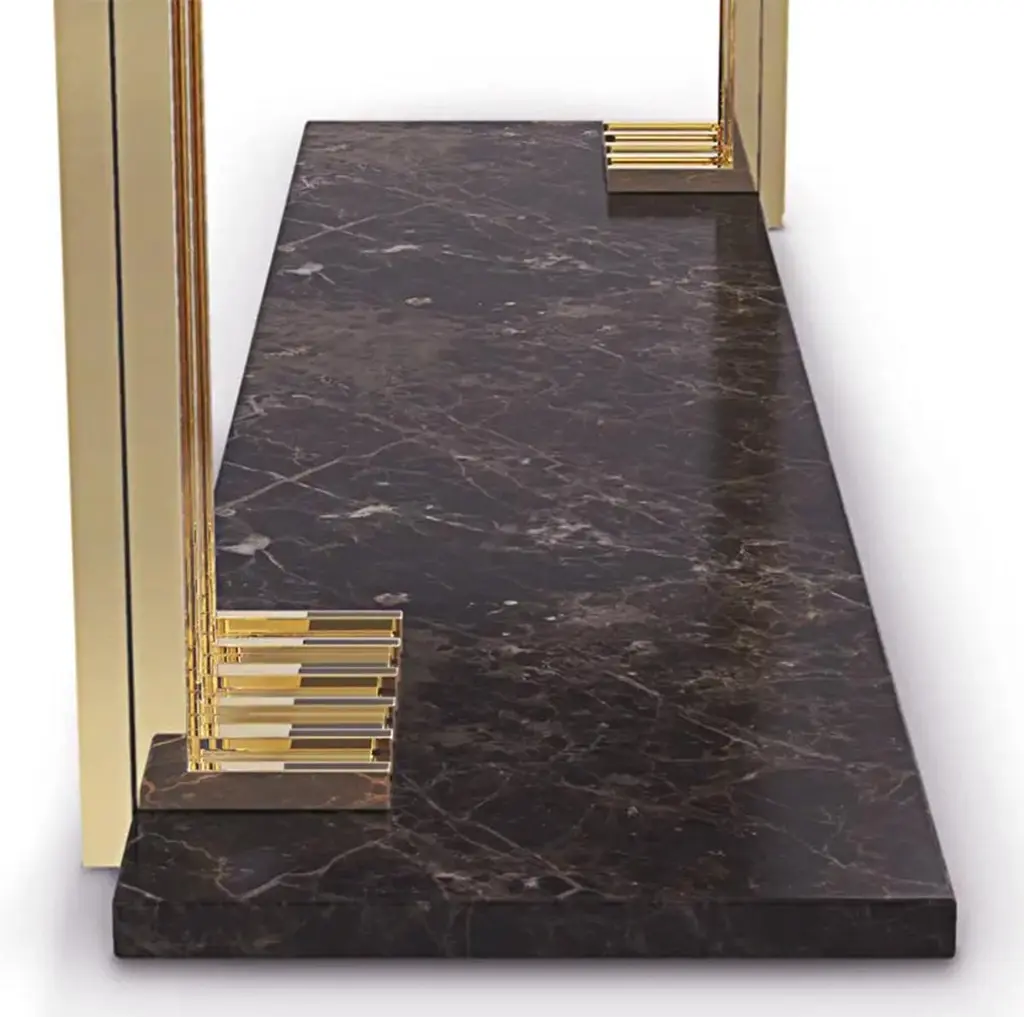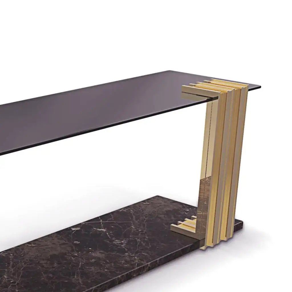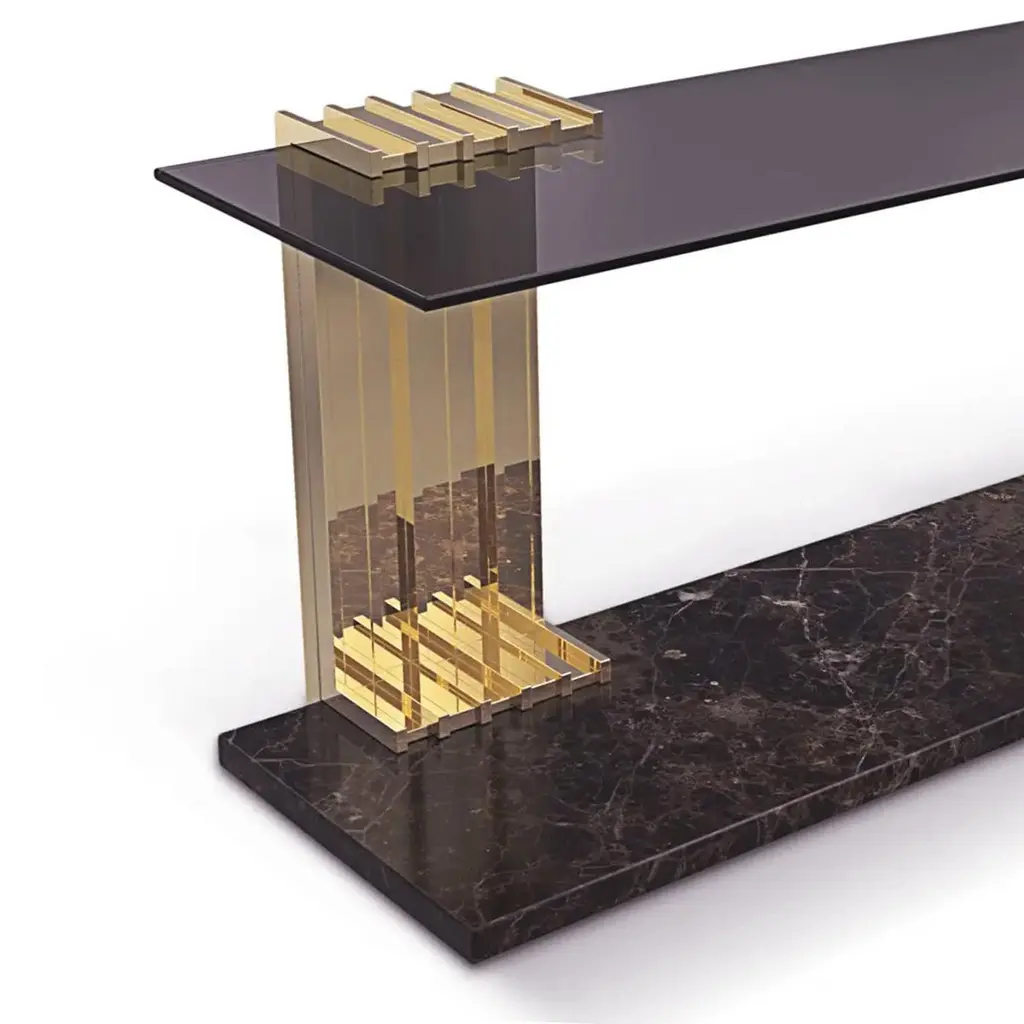 Console table oldies low with solid polished brass feet,with black marble base and with smocked glass top.
