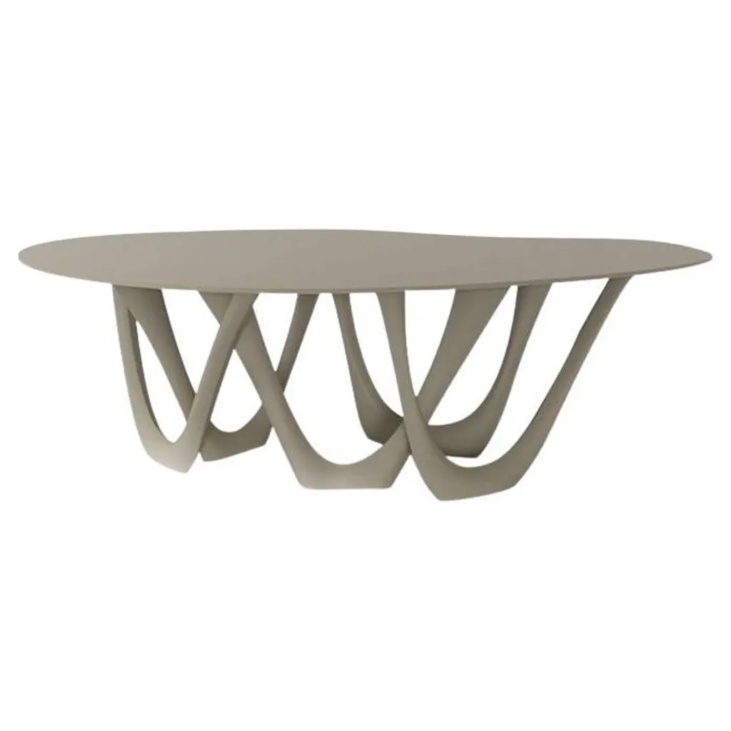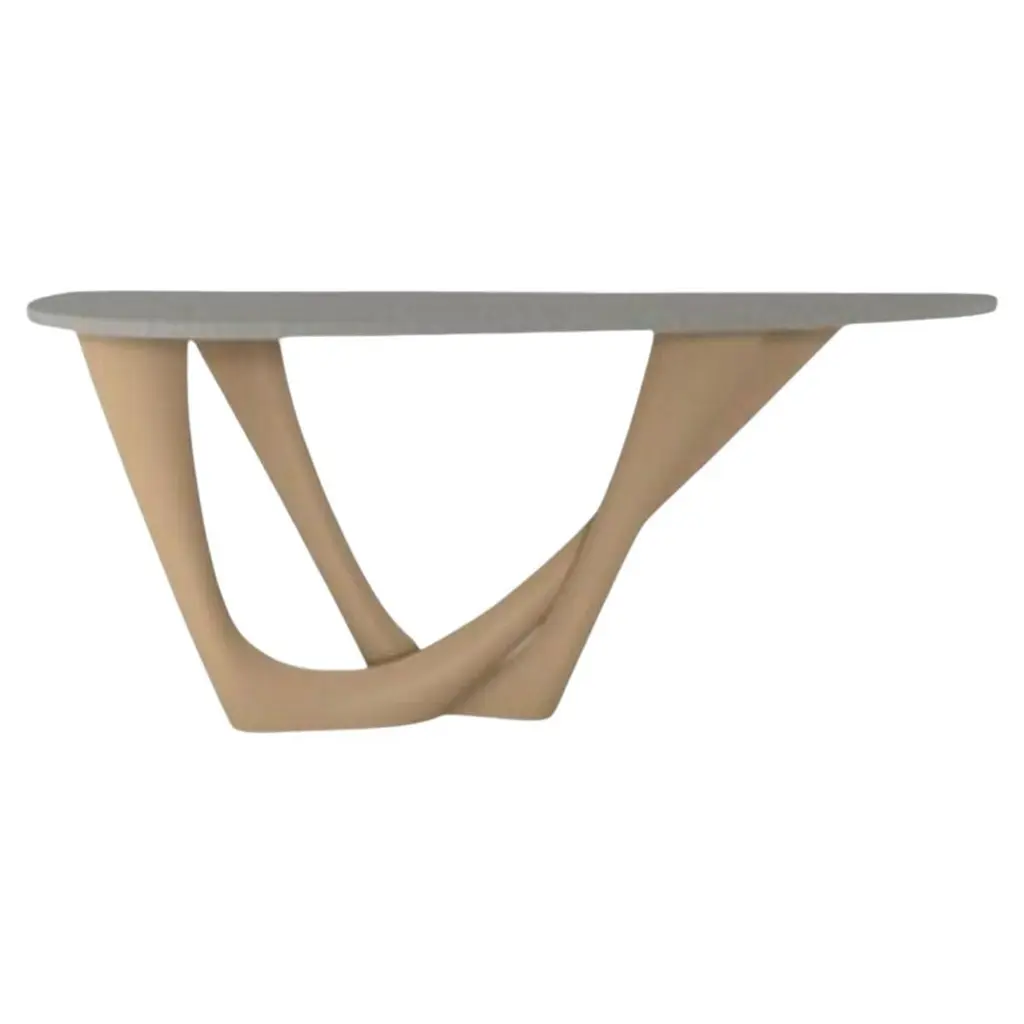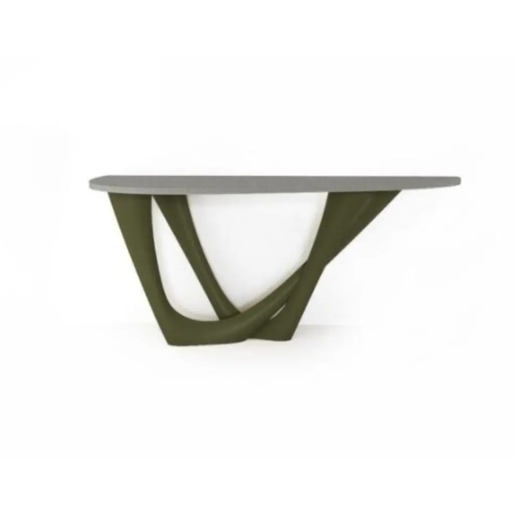 Olive Green G-Console Duo concrete top and steel base by ZietaDimensions: D 56 x W 168 x H 75 cm Material: Carbon steel, concrete.Also available in different colors and dimensions.G-Console is another bionic object in our collection. Created for smaller spaces, it gives another possibility in interior planning and at the same time preserves the unique shape of the original G-Table. Both objects were made for enthusiasts of bionic forms. Made with FiDU technology, it reminds of vines or tree roots. Nature symbolizes a constant changeability and harmony that comes out of it. A diverse structure refers to both natural forms and processes. G-Console comes in two versions – Mono and Duo.About Zieta: Zietas main goal is to deliver uniqueness and customization in design and construction while keeping the production, transport, and warehousing innovatively efficient.This is how they imagine the future world: Light, durable structures of customized applications produced on demand out of one-of-a-kind parts, yet efficiently.They use a computer-controlled production process. Customized pattern, customized form, customized function, one-of-a-kind product, and outstanding precision are what they deliver.You will find all of this philosophy reflected in the products. They research, they discover new possibilities, they play with forms and they deliver a beautiful, innovative, surprising outcome to people who love the design and who care about design development.They believe their work is a valuable contribution to the world of design not only by the unique beauty of the forms but most of all by opening ultra-innovative opportunities of forming and new paths for the world of the future.