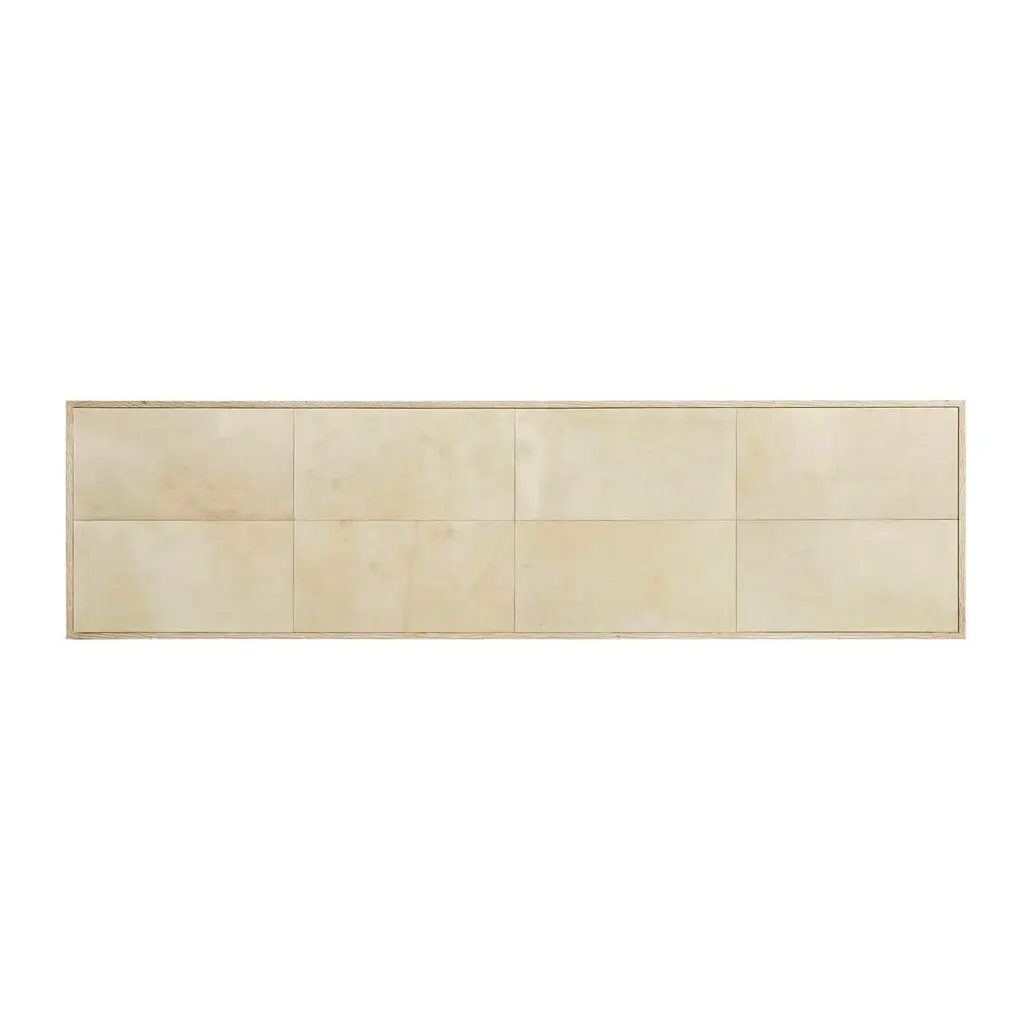A testament to refined craftsmanship and minimalist design. With its oak frame, this console exudes both strength and grace. The surface is a tapestry of genuine, untreated parchment squares, carefully sealed with a clear coat for a durable finish. The harmonious geometry of these parchment panels lends a textural depth that is subtle yet impactful. Topping this serene design is a pane of inset glass, adding a layer of sophistication that is easy to maintain. Whether gracing an entryway or acting as a sleek stage in a living area, this piece is sure to captivate and charm with its pristine presence. Dimensions: 68" W x 18" D x 34" H