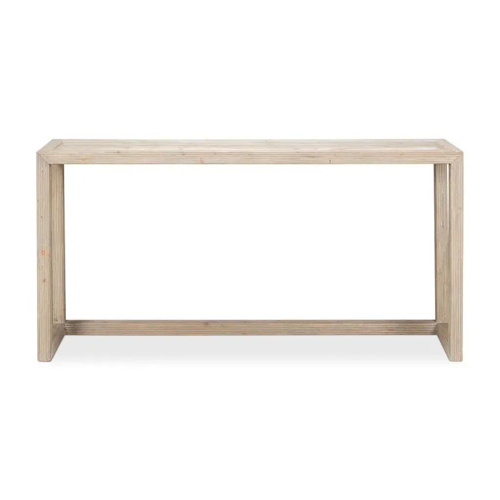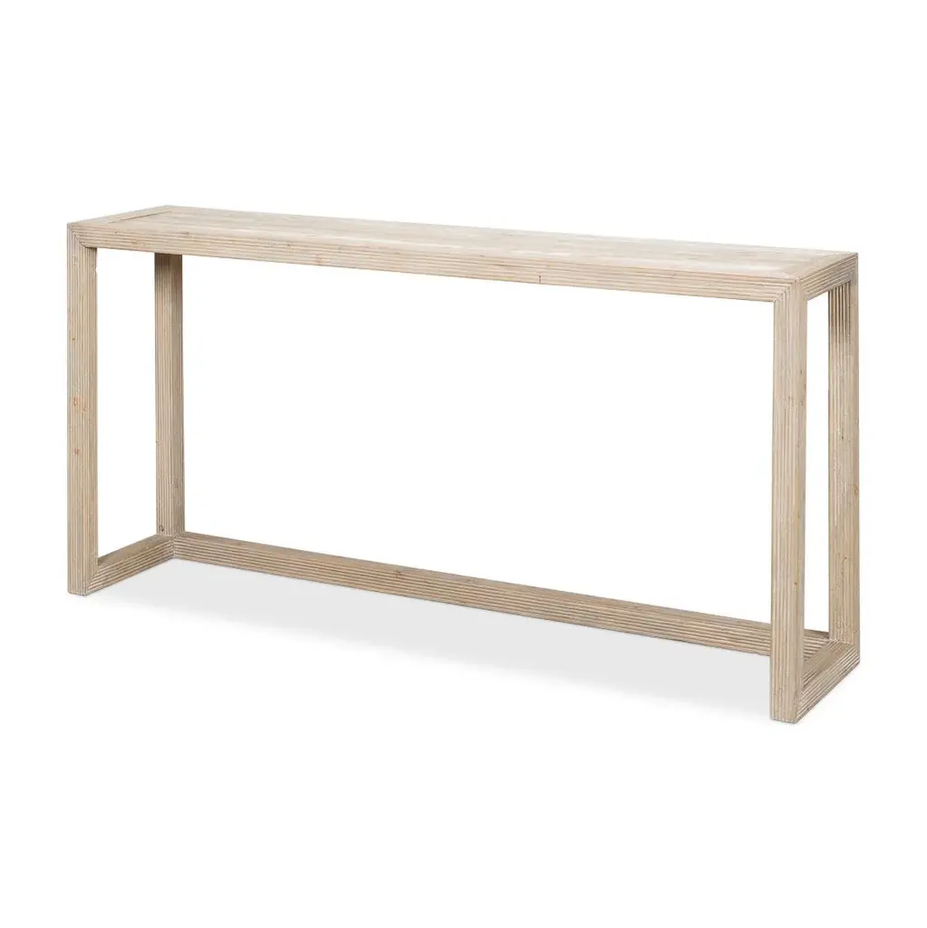 An Organic Modern pine console table with a pickled finish, a reeded framed edge, and a stretcher base. Dimensions: 66" W x 15" D x 32" H