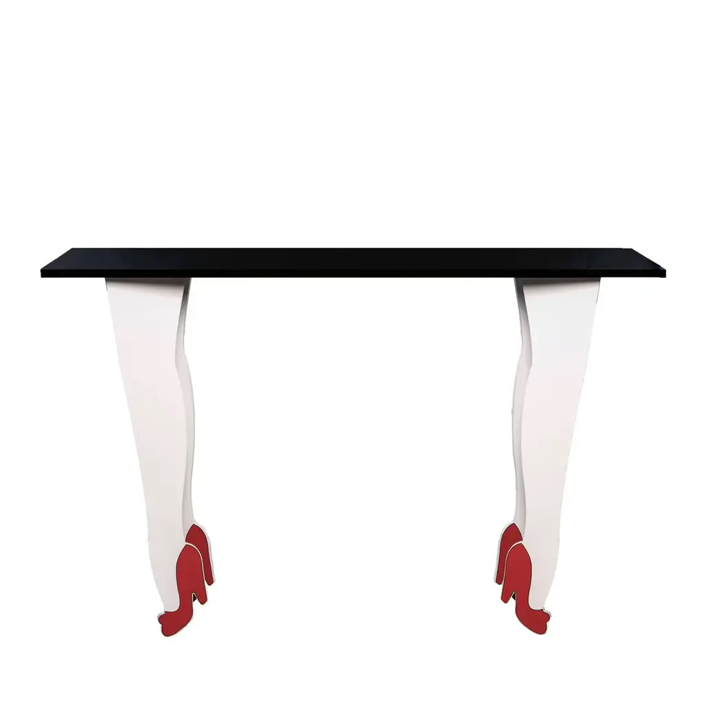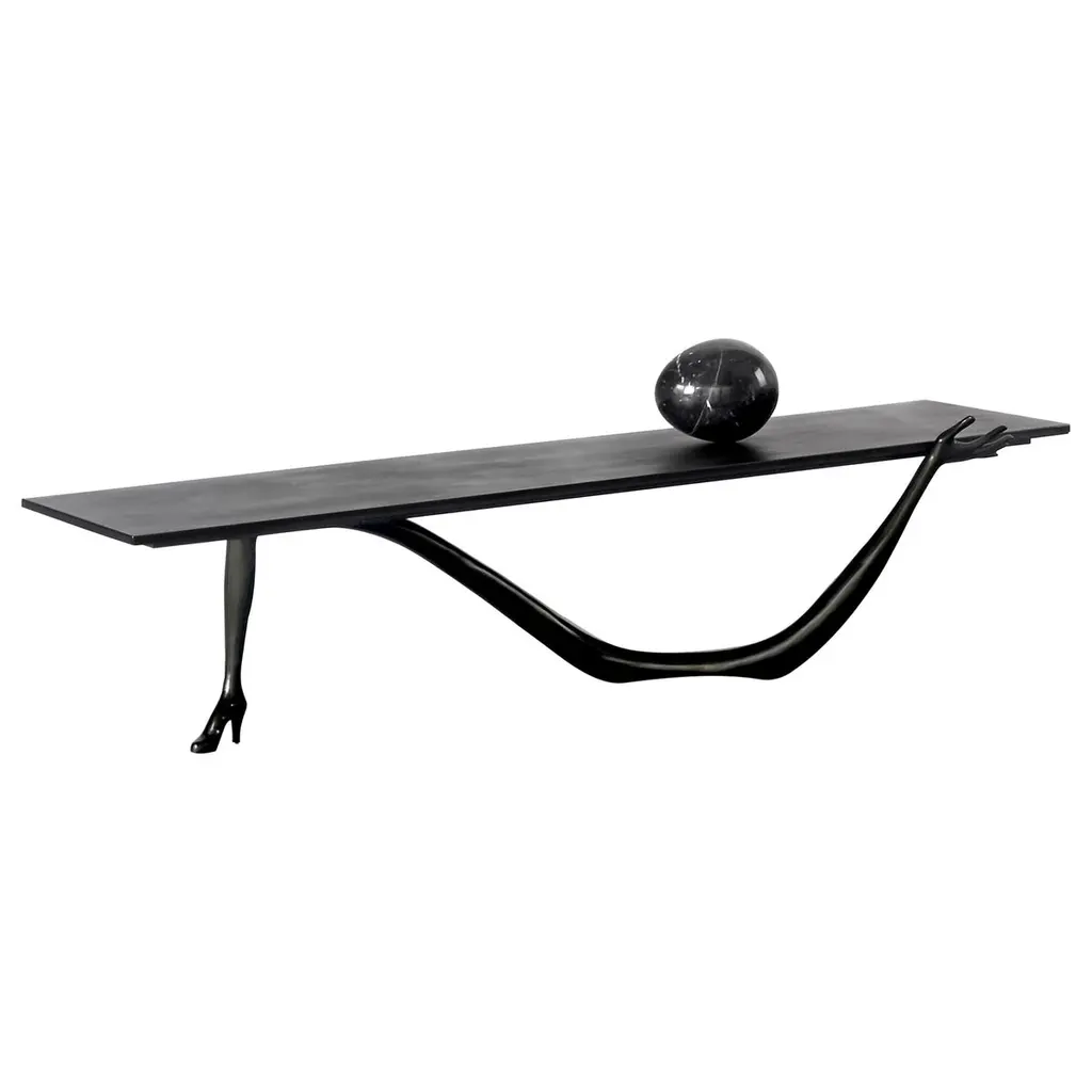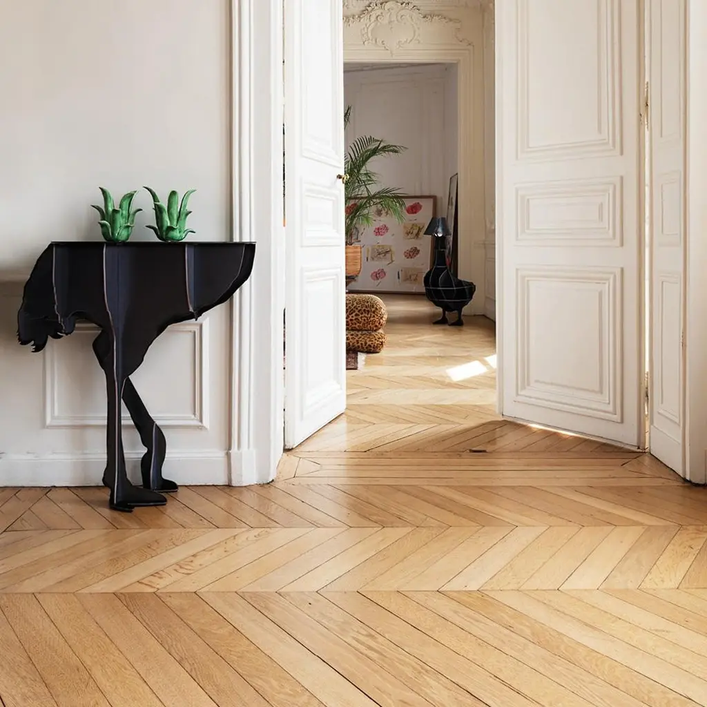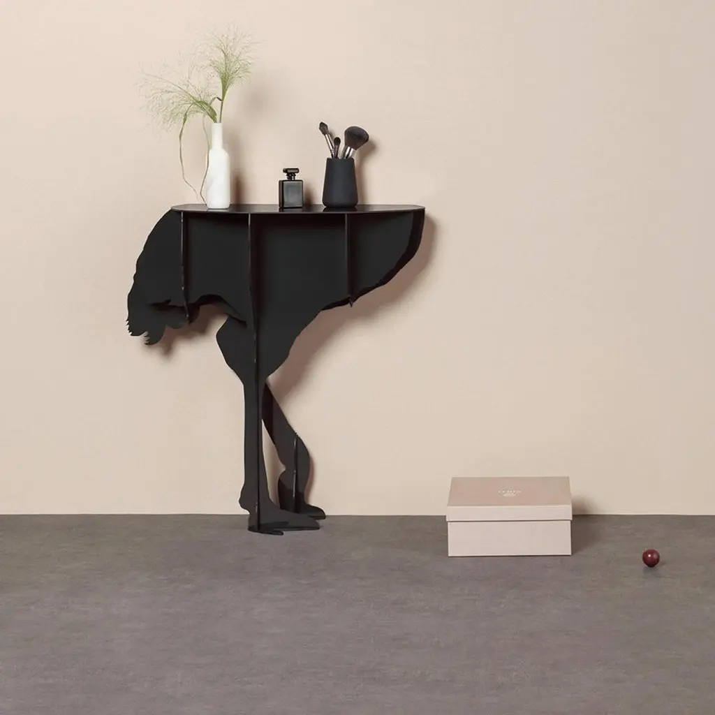 Diva, the aerial ostrich, seems ready to spread her wings in a daring dance, defying the laws of gravity with feet that only seem to skim the ground.Intended to be fixed against a wall, the elegant and practical console surprises with its feminine eccentricity, adding a touch of unique character to any interior it inhabits.Diva is part of the collection called Mobilier de Compagnie, which boldly reinvents animal shapes to integrate them harmoniously into interiors. Both domesticated and wild, the Diva console adds a touch of originality to every space.Ostrich Wall Console - Design: Rachel & Benoît ConversMaterial: high pressure laminate (HPL) for indoor and outdoor useAvailable in Matte Brushed Black, Glossy Red, Matte Fern Green, Glossy Powder Pink, and Matte WhiteDimensions: H.76 × L.71 × W.25 cm - Weight: 6 kg