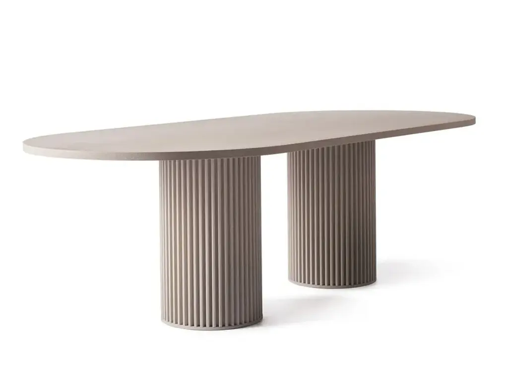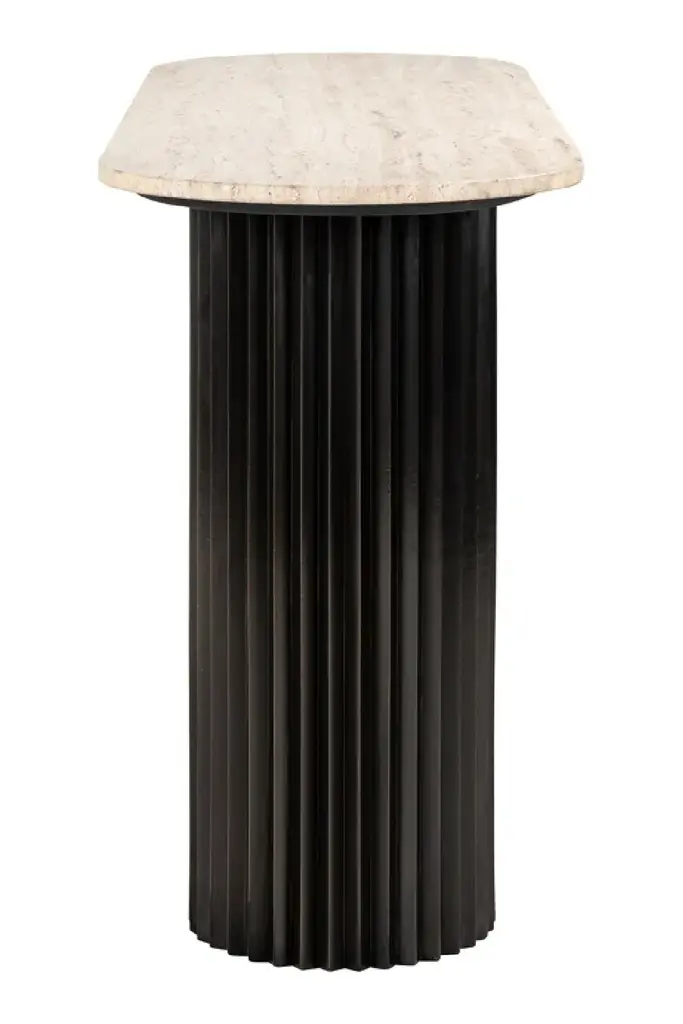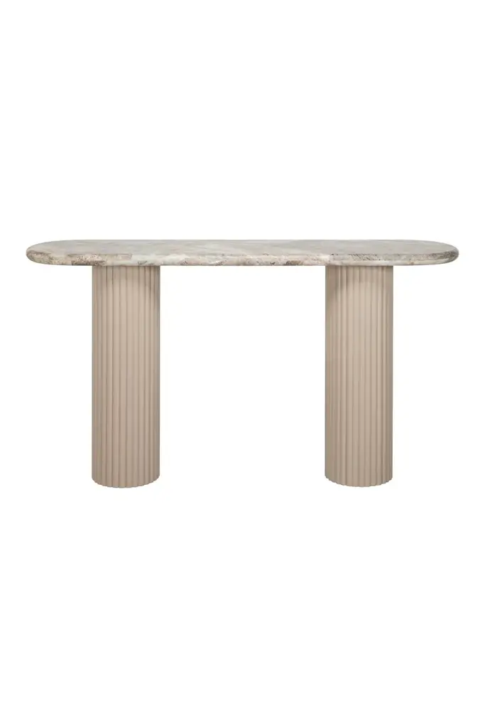Add a sense of refinement to your decor with the Richmond Interiors's Hampton Console Table. With its oval beige travertine top, this table exudes timeless beauty and provides a luxurious surface for various purposes. Its two pillar legs, characterized by their ridges, create a distinctive and eye-catching design. Use it as an accent piece in your entryway or as a stylish surface in your living room for a harmonious and inviting environment.