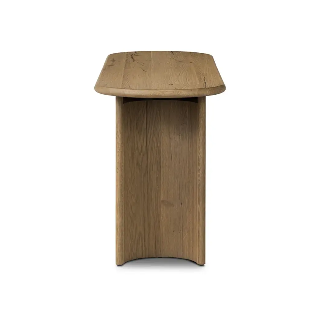A study in shape. Seasoned brown acacia forms the crescent-shaped legs of this console table, topped with Italian white marble to bring an organic presence to the living room or entryway.