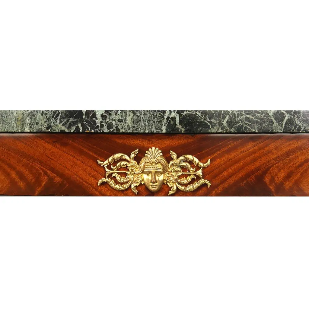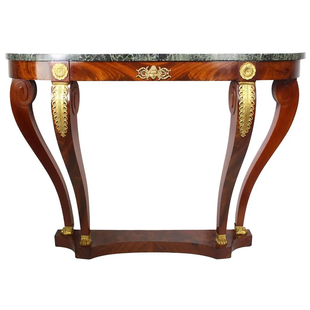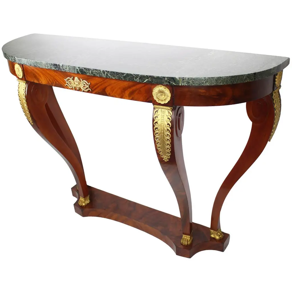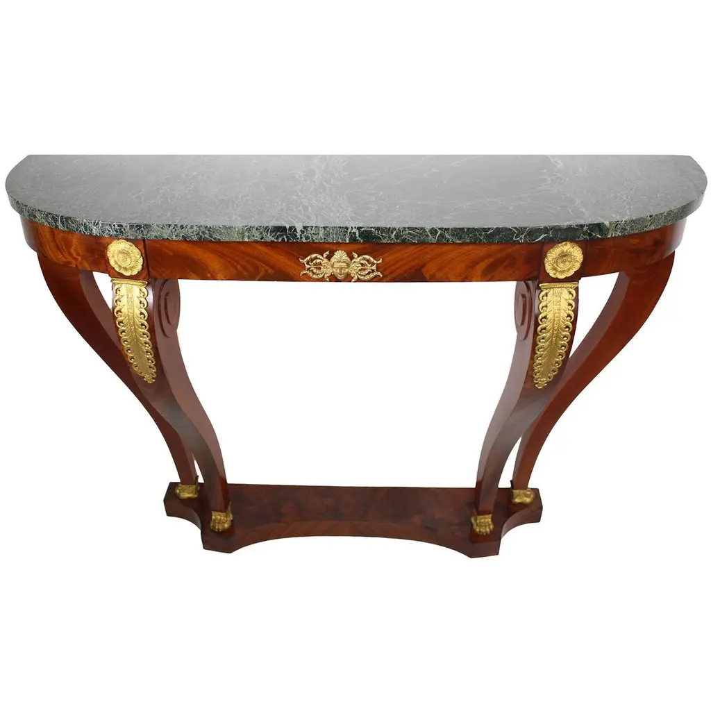 A Fine Pair of French 19th/20th Century Empire Revival Style Exotic Mahogany Marquetry and Gilt-Bronze Wall Mounting Demi-Lune Consoles fitted with green d'Alps marble tops, attributed to Maison Forest, Paris. Circa: Paris, 1890-1900.Maison Forest, founded in 1883, operated from 14 Rue Pierre-Picard and 31 Rue Cambacérès in Paris. Renowned for its exceptional craftsmanship, the esteemed fine furniture manufacturer produced high-quality furniture and decorative art pieces during the late 19th and early 20th centuries. Specializing in Louis XIV, Louis XV, Louis XVI, Empire, and Napoleon III styles, Maison Forest's exquisite furnishings, often adorned with fine ormolu mounts, catered to a discerning international clientele.Height: 39 inches (99.1 cm)Width: 55 inches (139.7 cm)Depth: 16 inches (40.6 cm)