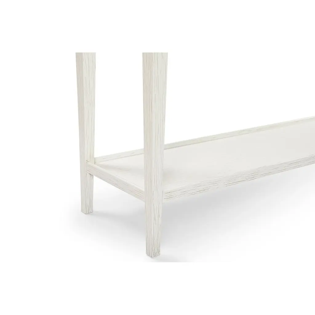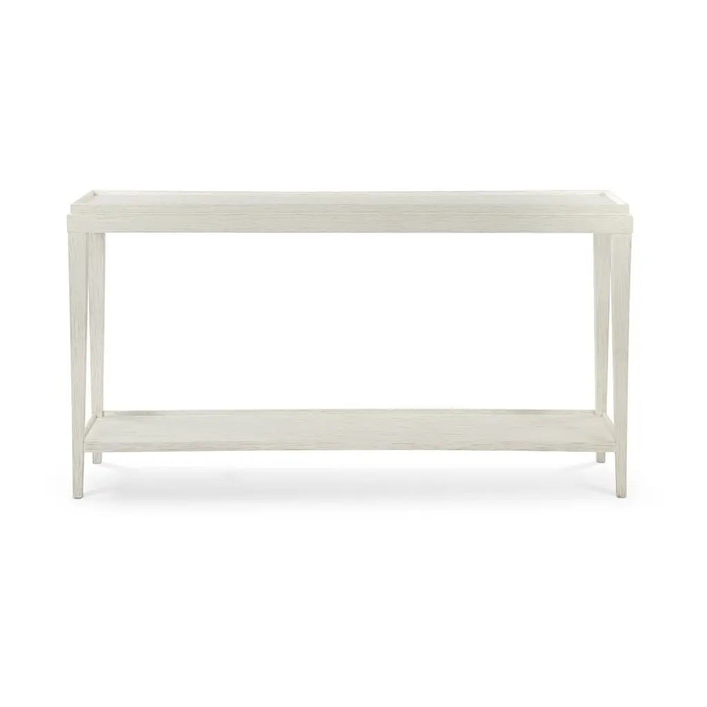 A Classic rustic console table with a 'drift' white painted finish with subtle grey distressing, with a wooden galleried dish top, square tapered legs and a shelf stretcher.Dimension: 62" W x 13.75" D x 33" H