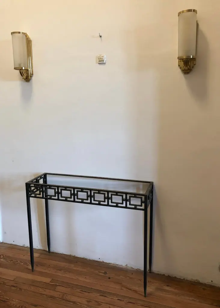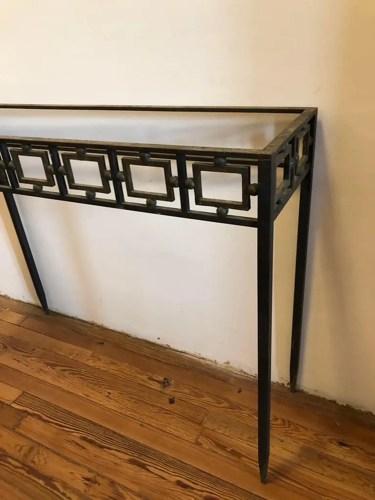 ConsoleMaterial: iron and glassFrance.We have specialized in the sale of Art Deco and Art Nouveau and Vintage styles since 1982. If you have any questions we are at your disposal.Pushing the button that reads 'View All From Seller'. And you can see more objects to the style for sale.Why are there so many antiques in Argentina?In the 1880 – 1940 there was a grate wave of immigration encouraged by the periods of war that were taking place.1st World War took place between 1914 and 19182nd World War took place between 1939 and 1945 The immigrants options were New York or Bueno Aires. Tickets were cheap and in Buenos Aires they were welcomed with open arms, as it was a country where everything was still to be done.Argentina was the country of new opportunities, labour was needed and religious freedom was assured, in many cases the of the family travel first until they were settled and then the rest of the family members join them.In the immigrant museum “Ellis Island Immigrant Building” in New York you can se the promotional posters of the boats that would take them to a new life.Between the years 1895 and 1896, Argentina had the highest DGP (gross domestic product) per capita in the world according to the Maddison Historical Statistics index, this situation arose due to the large amount of food being exported to European countries, which were at war.The Argentinean ships left the port of Buenos Aires with food, but they returned with furniture, clothes and construction elements, (it´s common to see this the old buildings of the historic neighbourhood of San Telmo, the beams with the inscription “Made in England)”, as well as many markets that were built in Buenos Aires, such us the San Telmo Market, whose structure was brought by ship and afterwards assembled in 900 Defensa Street. With the great influence of European immigrants living in the country, the children of the upper classes travelled to study in France, resulting in the inauguration of “La Maison Argentinienne”, on 27th of June 1928, in the international city of Paris, which hosted many Argentinians that were studying in Frace. It´s the fourth house to be built after France, Canada and Belgium, being the first Spanish-speaking one. Still in place today (17 Bd Jourdan, 75014, Paris, France). Many of the children of these wealthy families who attended international art exhibitions, museums and art courses abroad, took a keen interest in the European style. This is why Buenos Aires was at the time referred as “The Paris of South America”.Between the years 1890 and 1920 more than a hundred Palaces were built on Alvear Avenue the most exclusive avenue in Buenos Aires. Today some of these palaces have been transformed into museums, hotels and embassies.In the year 1936, the Kavanagh building was inaugurated, it was the tallest reinforced concrete building in South America.During 1994 the American Society of Civil Engineers distinguished it as an “international engineering milestone”, and it´s now considered a World Heritage of Modern Architecture.At the time was common to hire foreign architects such as Le Corbusier, who visited Buenos Aires/Argentina in 1929 and in 1948 he drew up the blueprints for a house built in La Plata City (which was declared a World Heritage Site).In 1947, the Hungarian architect Marcelo Breuer designed “Parador Ariston” in the seaside city of Mar del Plata. After an Argentinean student at Harvard University convinced him to come to Argentina. He worked on an urban development project in the Casa Amarilla, area of La Boca. The Ukrainian architect, Vladimiro Acosta, arrives in Argentina in 1928 and worked as an architect until que moved to Brazil.Antonio Bonet, a Spanish architect who worked with Le Corbusier in Paris, arrives in Argentina in 1937, where he carried out several architectural works and in 1938 designs the well-known BFK chair.Andres Kálnay, of Hungarian origin, made around 120 architectural masterpieces, among which the former Munich brewery stands out, he even made the furniture’s design. The German architect, Walter Gropius, director of the Bauhaus, lived in Argentina, where he wrote articles for “Sur” magazine and founded in Buenos Aires, an architectural firm with Franz Möller, who was also an architect, where he built two houses.At the same time several famous designers decided to immigrate to Argentina, among them we can find the well-known French designer, Jean-Michel Frank, who arrived in the country in 1940 and also worked for the Rockefeller family.Special pieces were made, which were sold exclusively in the country, such as the well-known German company “WMF”, who sold their products by catalogue, which were chosen by the ladies of high society in the list of wedding gifts, as well as the pieces designed by Christofle. The Swiss sculptor Alberto Giacometti, made special pieces for Argentinean mansions.In 1904 the first Jansen branch outside Paris was established in Buenos Aires, as the Argentinean clientele demanded a large amount of furniture, from the end of the 19th century to the mid-20th century.In 1970, the brand Rigolleau Argentina made pieces authorised by Lalique.The brands Maple and Thompson also set up shop in the country.The French plastic artist, Marcel Duchamp moved to Argentina in 1918-1919.Glass signed Gallé, Charder, Leverre, Schneider, Muller and other French firms. They were bought in flower shops and were given to ladies with beautiful floral arrangements. Some furniture manufacturers travelled to international fairs and bough the patterns to produce the furniture in Argentina, such as the furniture firm Englander and Bonta, who bought the patterns ins Italy.It is worth mentioning that in Argentina we have the largest community of Italians outside of Italy, as it is estimated that 70 percent of the inhabitants have at least one Italian descendant, followed by Spanish immigrants.The most Important furniture stores in Argentina