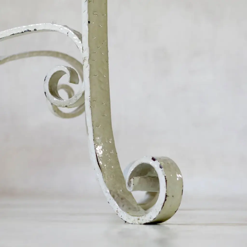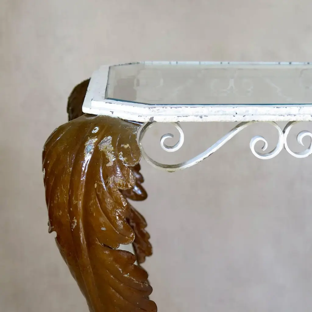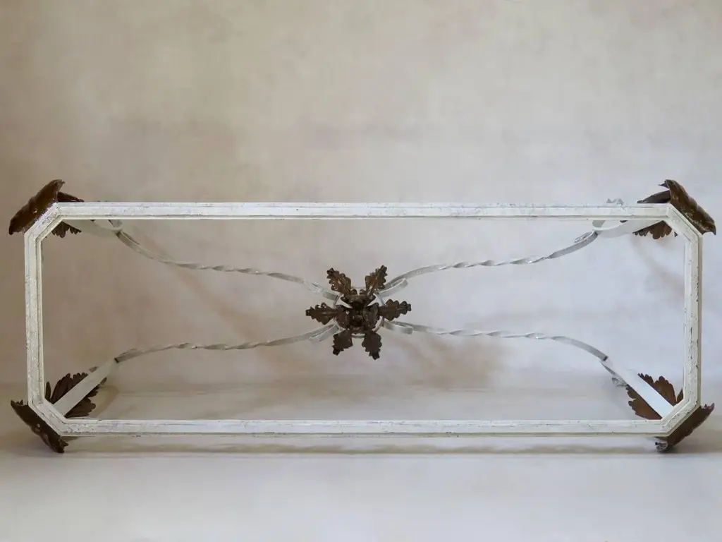 Very elegant pair of console tables made of painted wrought iron, with canted corners. The tables are raised on cabriole legs ending in scrolled feet. Curlicued apron. The knees are decorated with large appliqued acanthus leaves -- a motif which is echoed in the rosette at the center of the stretcher. Glass tops. Original paint.