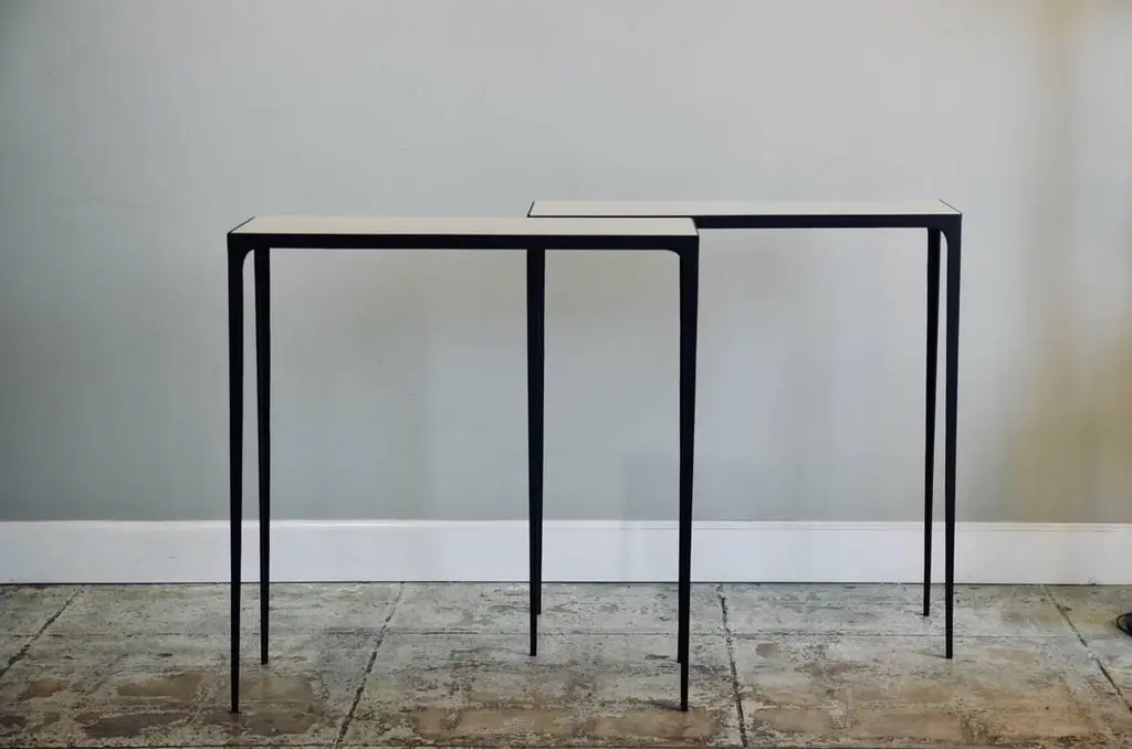Pair of 'Esquisse' wrought iron and parchment consoles by Design Frères.