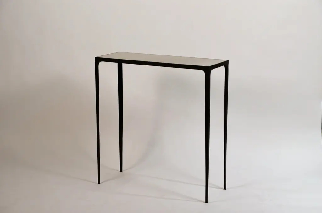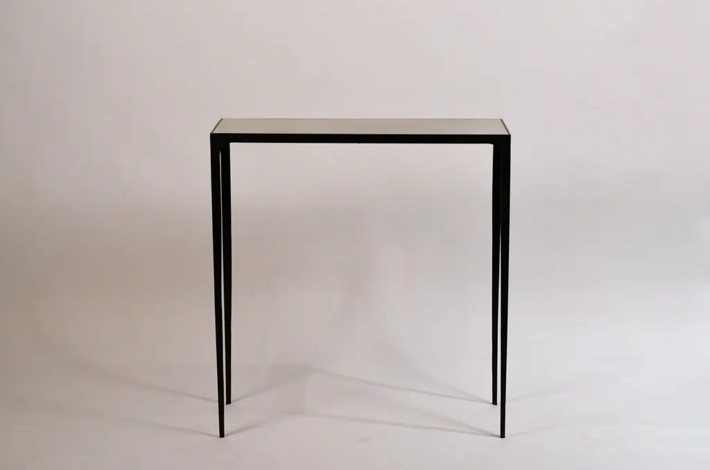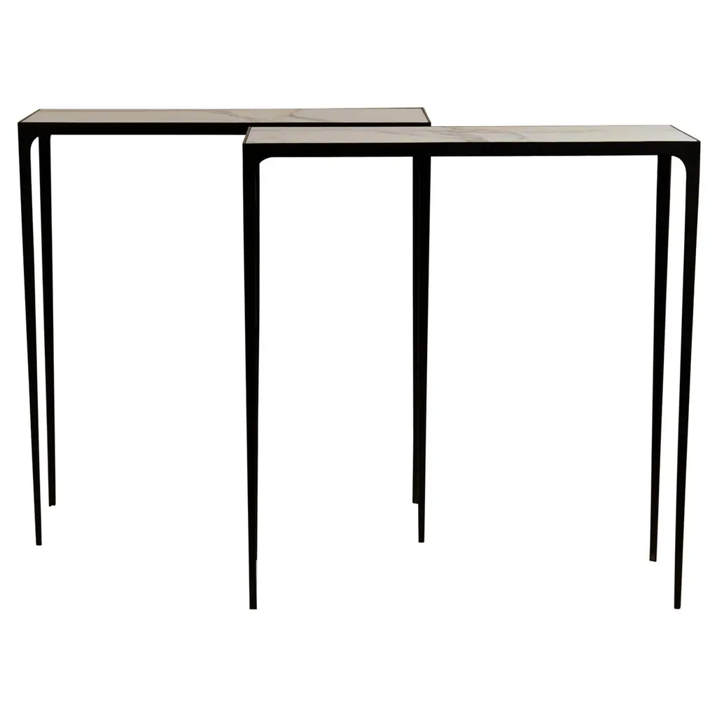 Pair of understated 'Esquisse' wrought iron and parchment consoles by Design Frères. Chic genuine parchment tops fitted onto a slender matte black wrought iron bases.