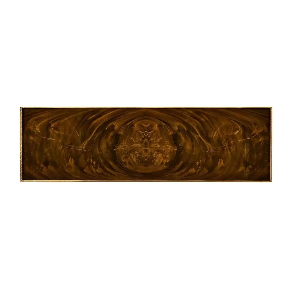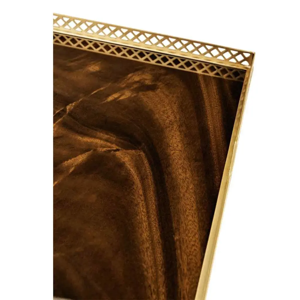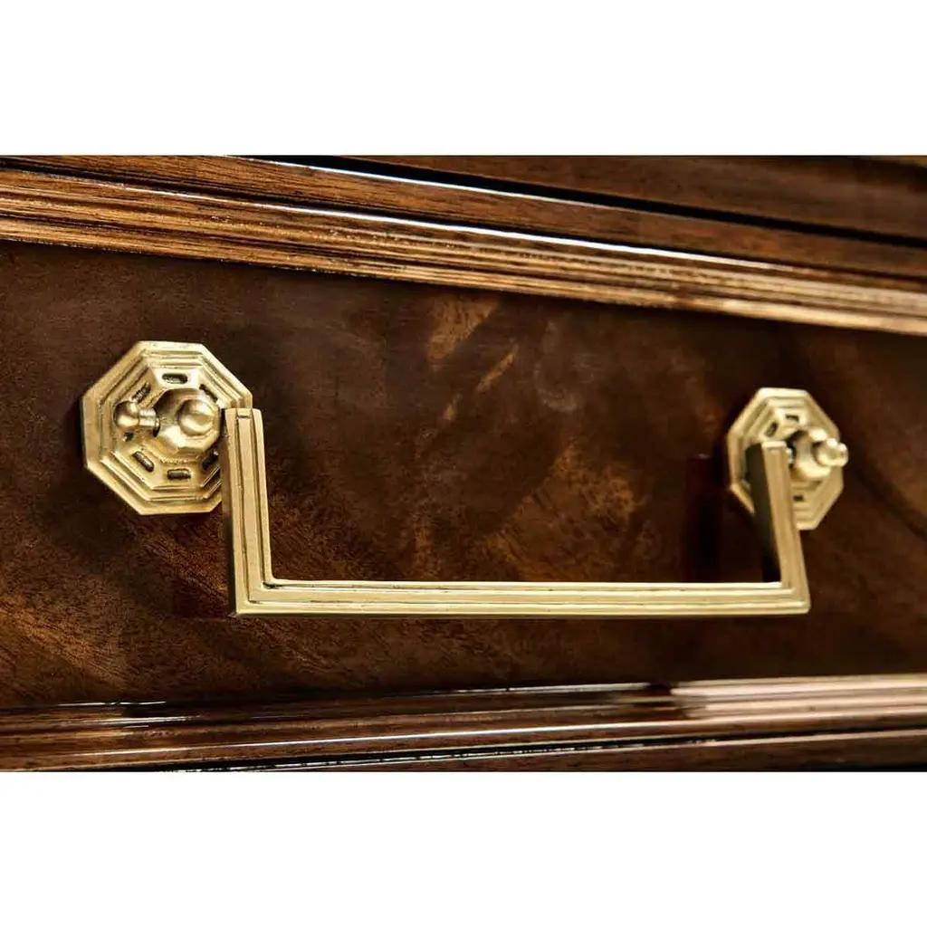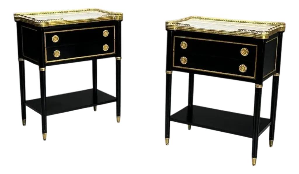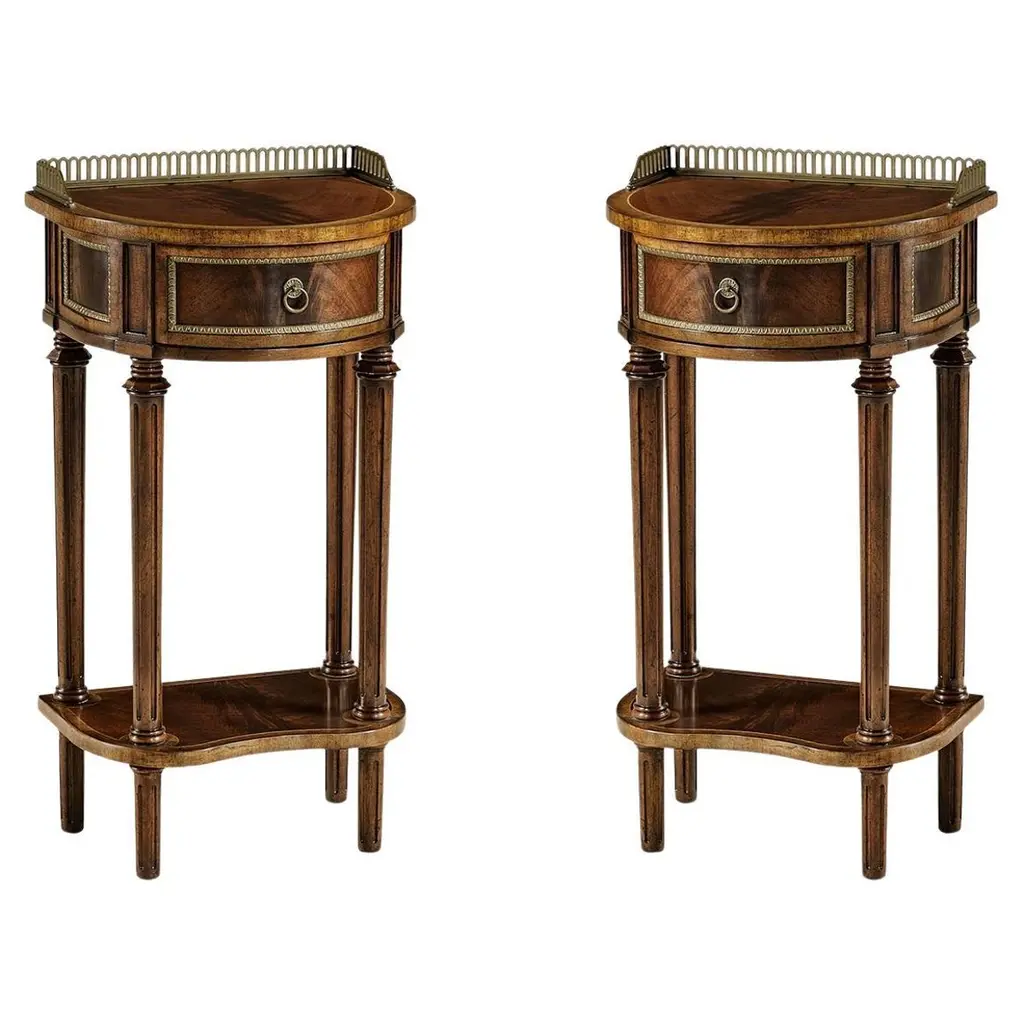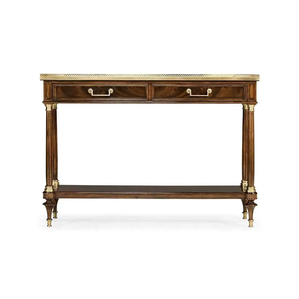 French Louis XVI mahogany console desserté with pierced brass gallery, two drawers, raised turned and fluted legs with shelf stretcher base and turned toupee feet on brass caps.Dimensions: 53.87" W x 16" D x 38" H
