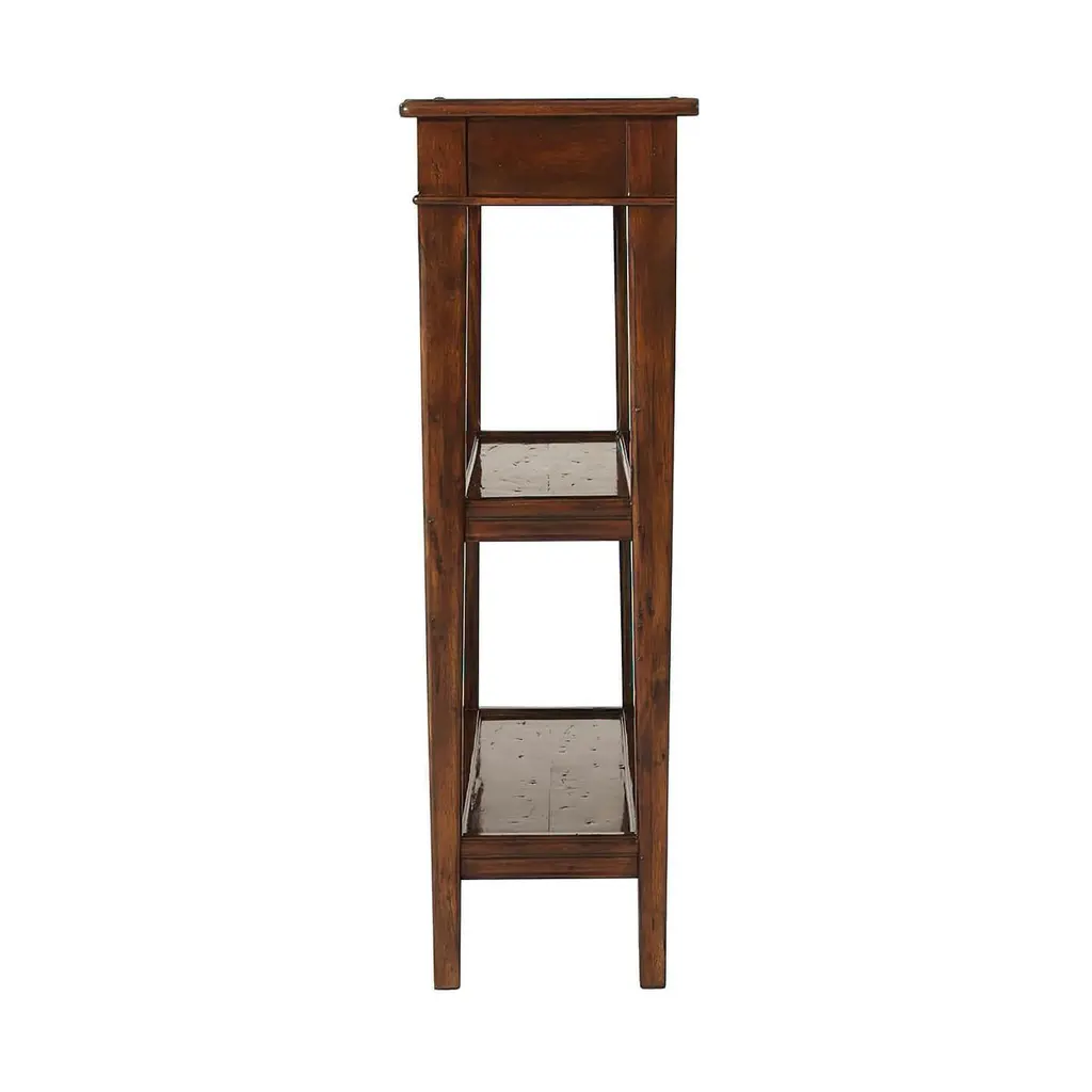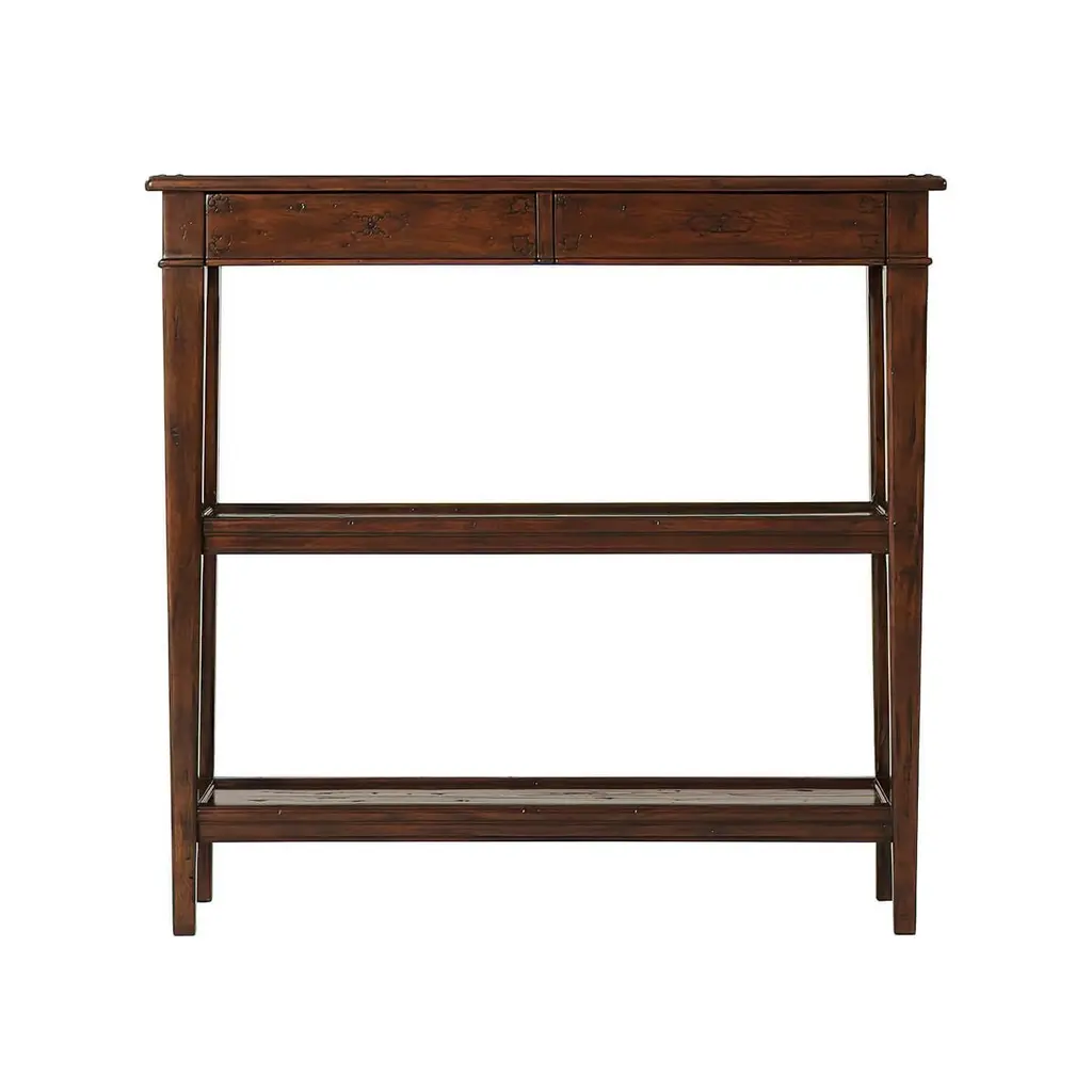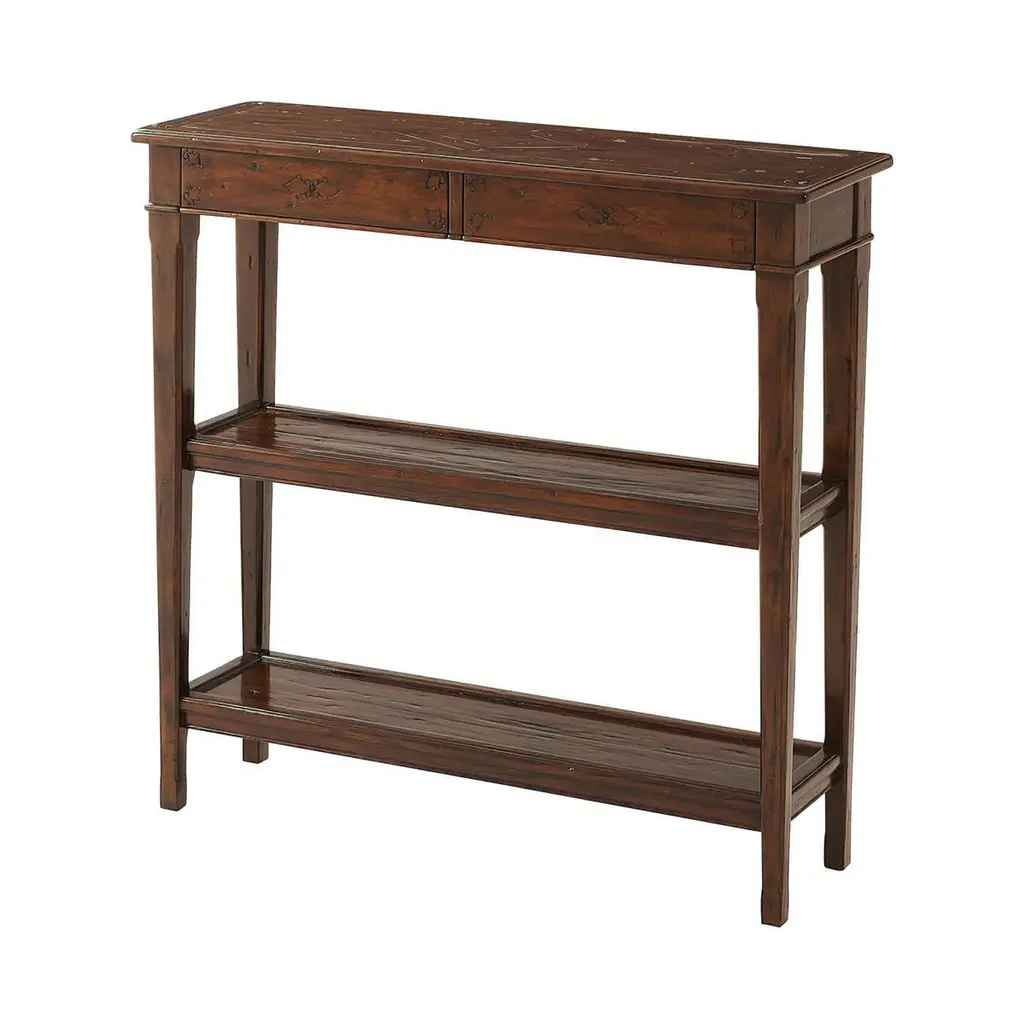 A French Provincial Neo Classic antiqued wood console table, with two frieze drawers and two further tiers between square tapering supports. Dimensions: 37.75" W x 12" D x 36" H.