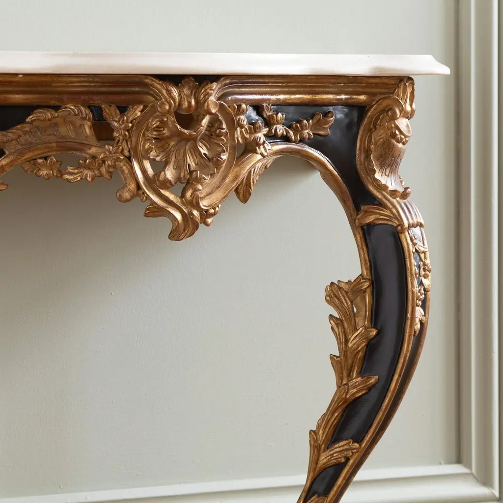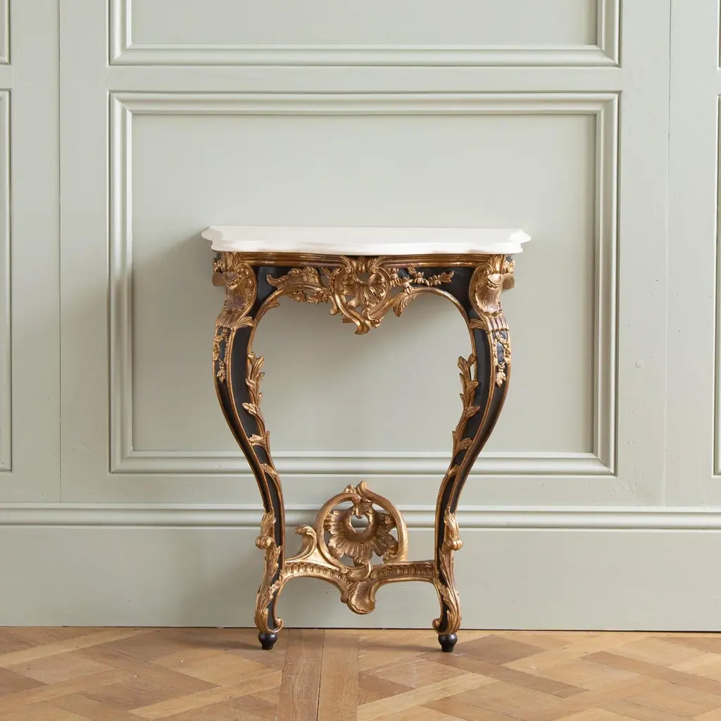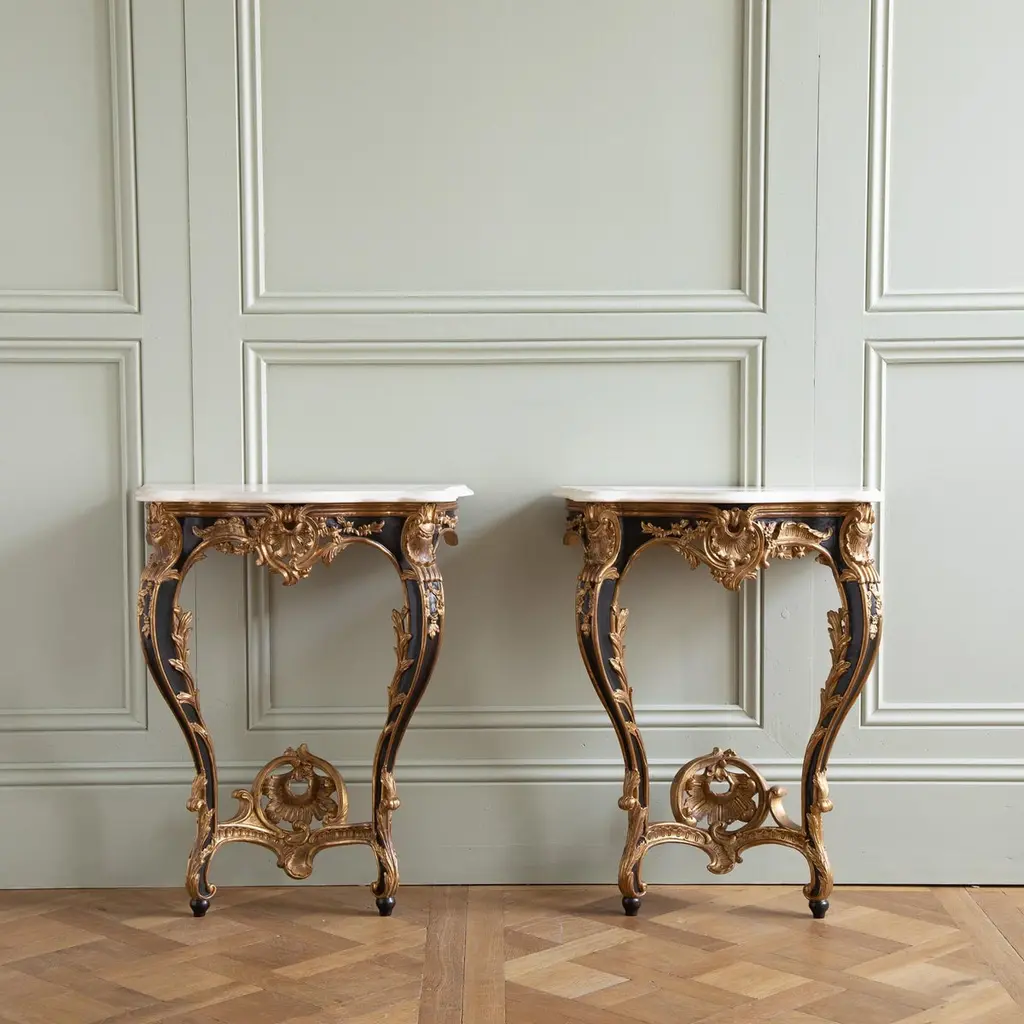 A pair of Louis XV style consoles, hand-carved by master craftsmen and finished in a hand lacquered with gold highlights, slightly aged and distressed patina. Includes a bevel-cut Crema Marfil marble which has been honed and lightly polished.