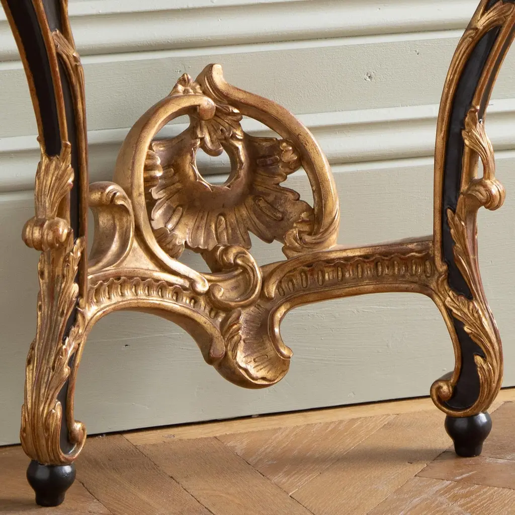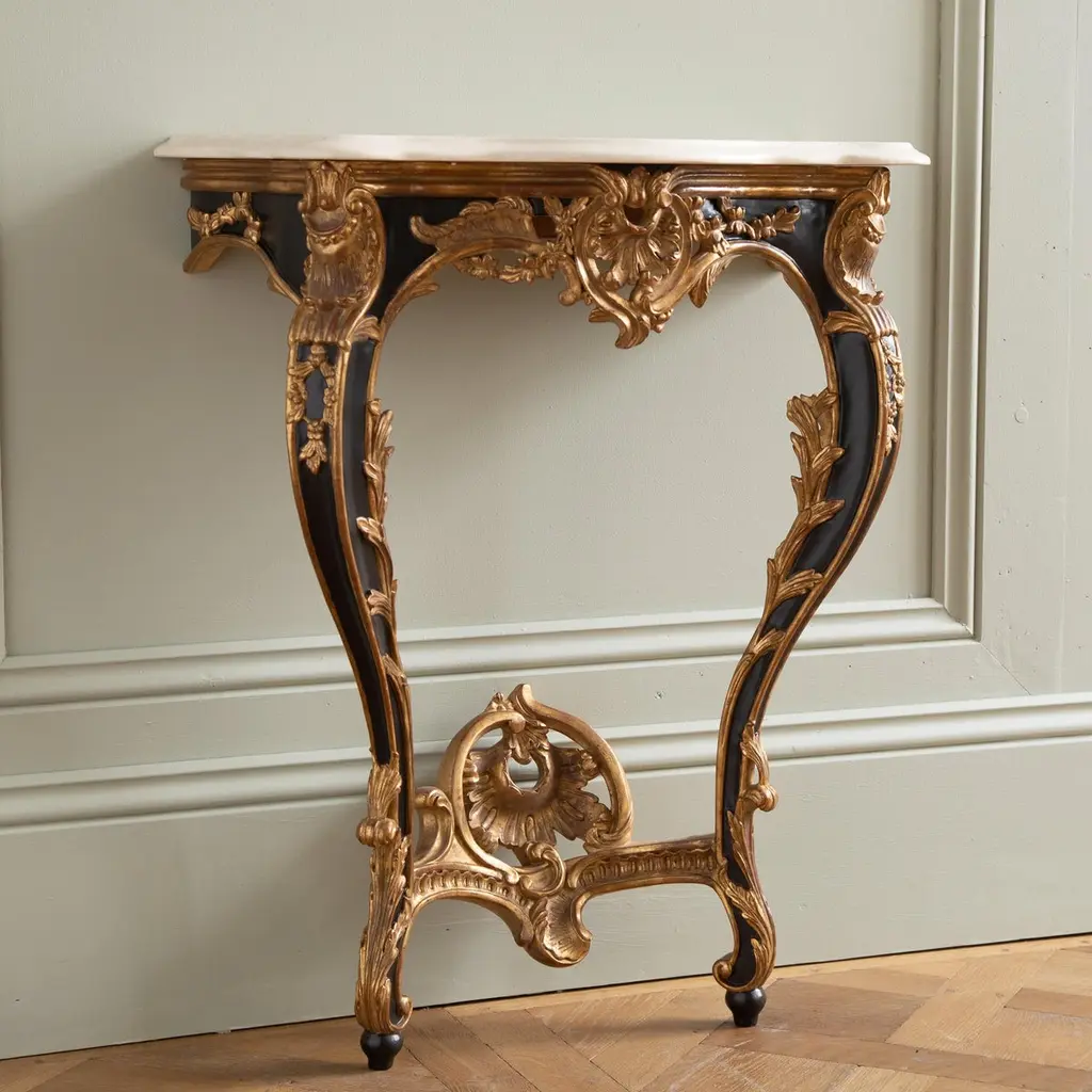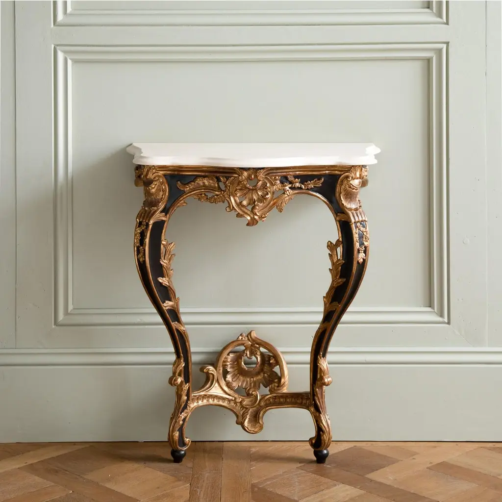 A pair of Louis XV style consoles, hand-carved by master craftsmen and finished in a hand lacquered with gold highlights, slightly aged and distressed patina. Includes a bevel-cut Crema Marfil marble which has been honed and lightly polished.