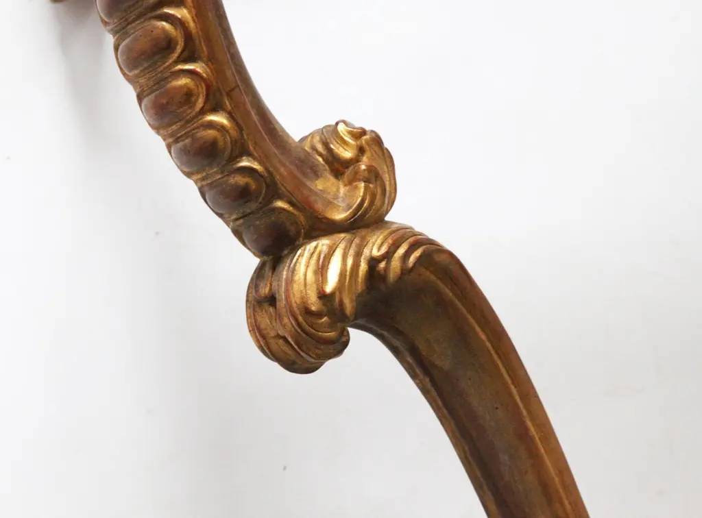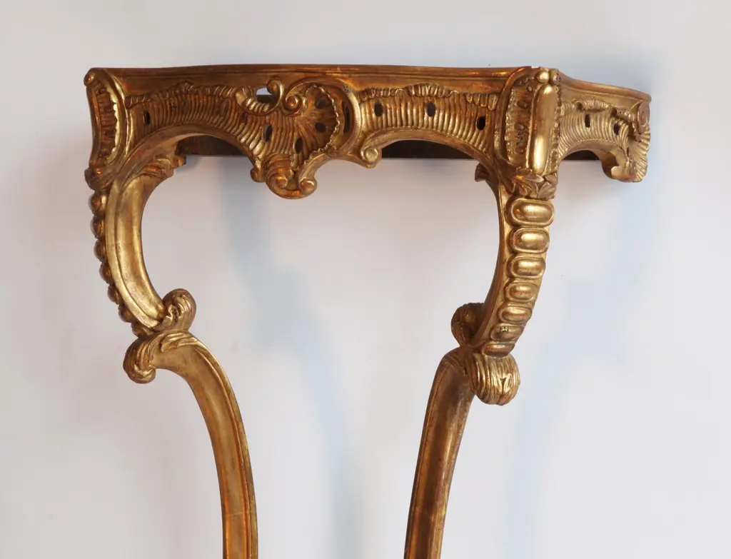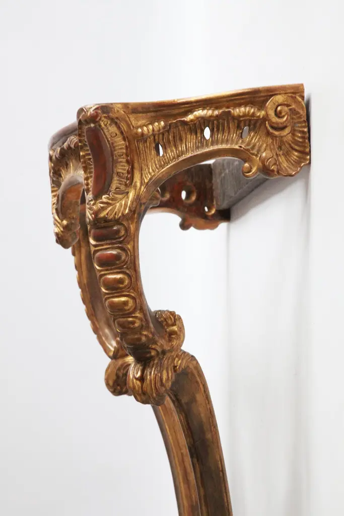 Pair of Rococo style consoles: elegantly sculpted by master craftsmen and finished with an antique gilded patina using traditional methods and materials. We have a selection of marble to choose from. (prices on request).