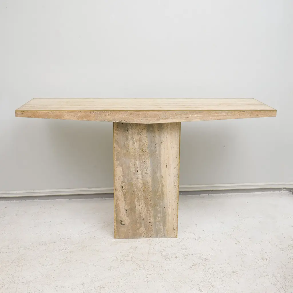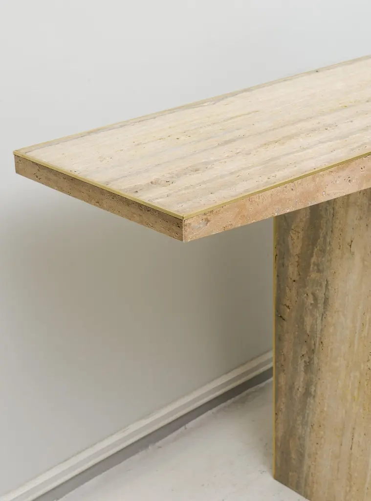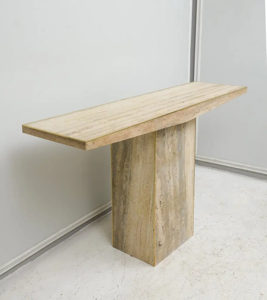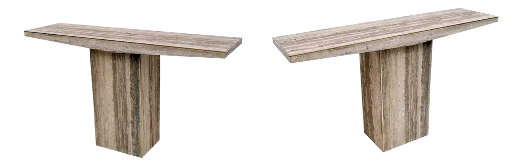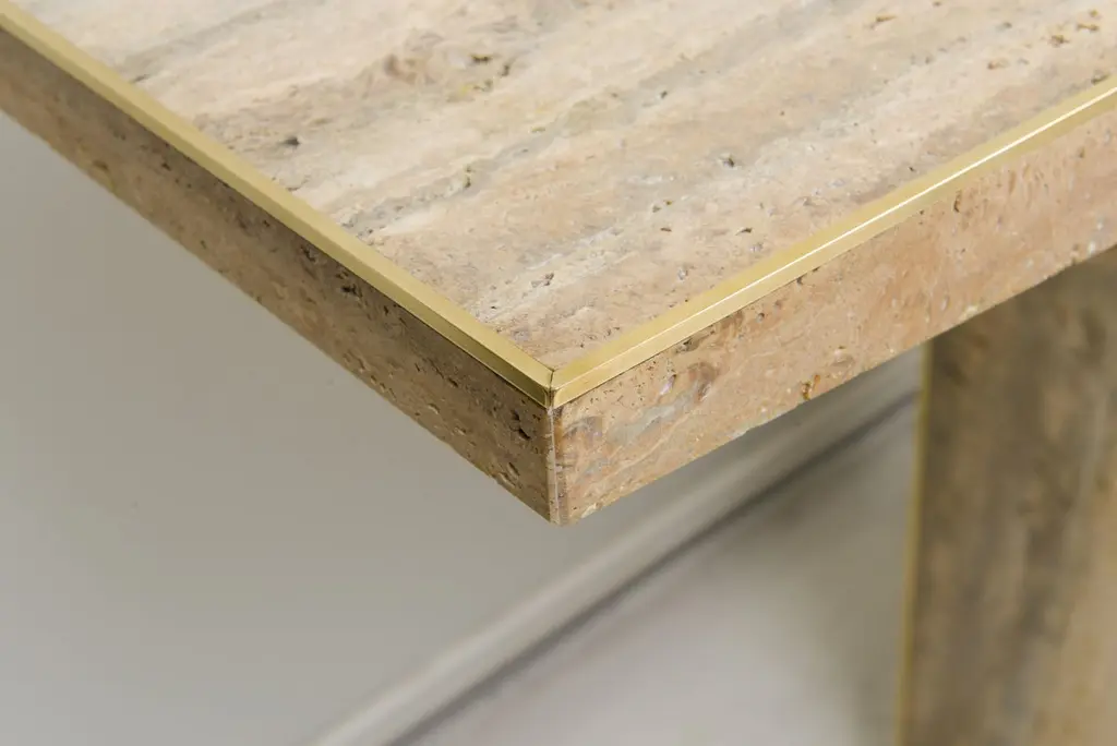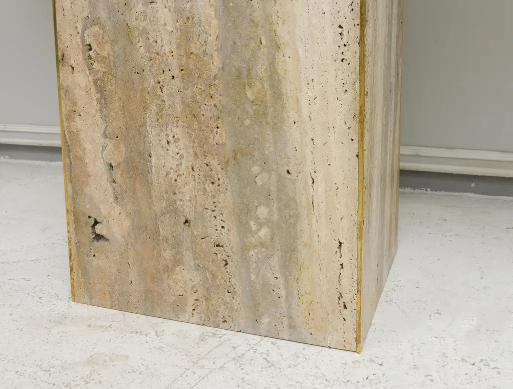 Pair Of Italian Contemporary Travertine Consoles With Brass Banding
