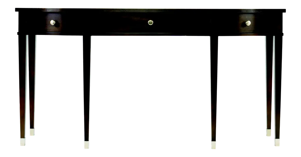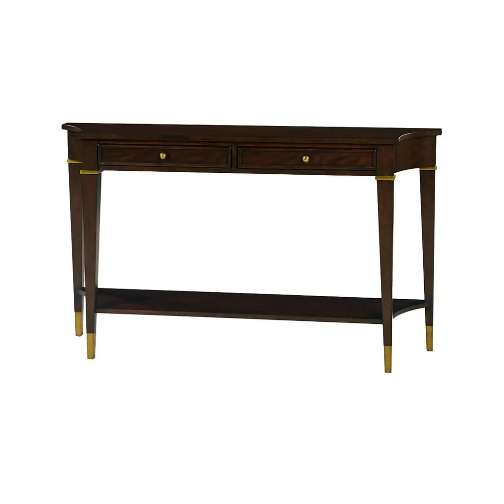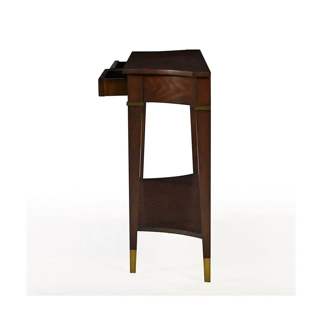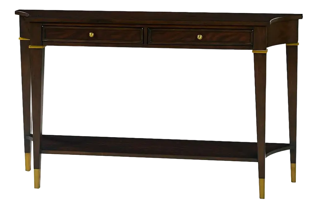 Featuring a dark finish on rich mahogany crotch veneer and solids, this console table is both elegant and classic.Its curved corners and tapered legs create a refined French 18th-century style silhouette, while brass detailing and hand-turned solid brass hardware add a touch of luxury. Two drawers provide practical storage, complemented by a shaped lower shelf ideal for decor or organization. Perfect for entryways, living rooms, or hallways, this versatile piece combines classic style with modern functionality.Dimensions: 58" W x 14" D x 34" H