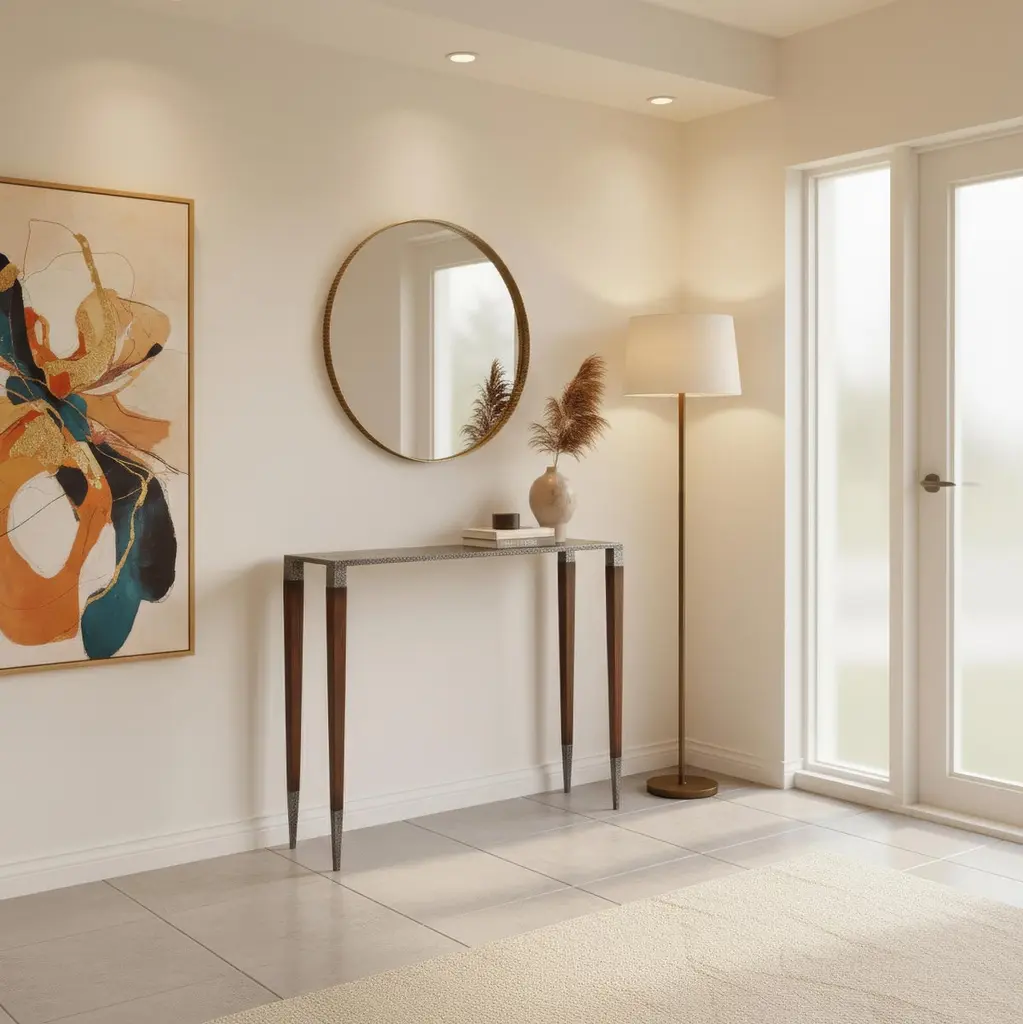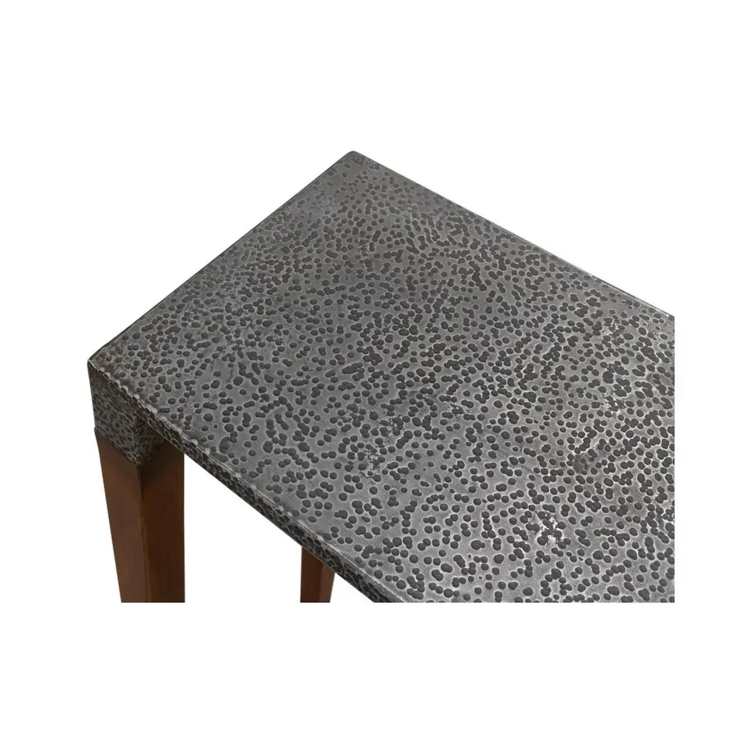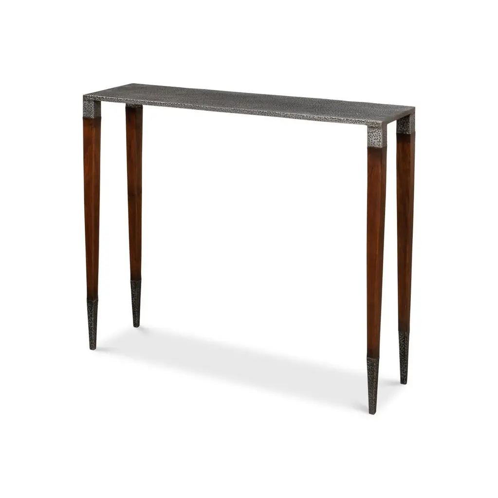 Console table brings refined elegance to compact spaces, blending solid walnut with the bold character of wrought iron. Its hammered iron top and leg caps create a striking contrast against the smooth, tapered walnut legs, evoking the glamour of 1930s Art Deco design with a touch of modern sophistication.Perfectly scaled for hallways, entryways, or behind a sofa, the slim profile allows this table to fit seamlessly into smaller spaces without sacrificing presence. The mix of warm wood and textured metal adds depth and dimension, making it an elegant accent for both contemporary and traditional interiors. A balance of craftsmanship and design, this piece reflects understated luxury in every detail.Dimensions: 36" W x 10" D x 30" H