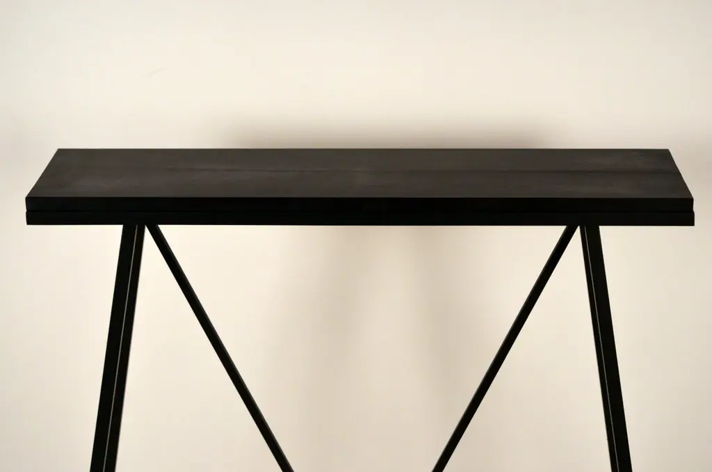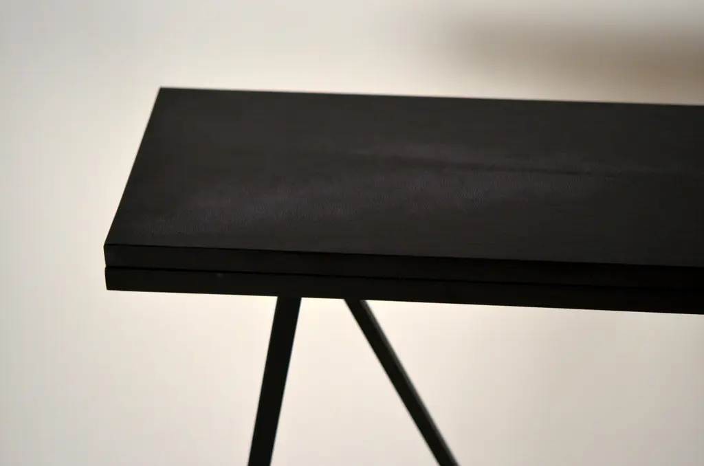 Pair of 'Trapèze' blackened steel and goatskin consoles by Design Frères.